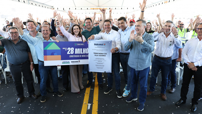 Descrição da imagem de fundo: A imagem está dividida em três partes: à esquerda, vê-se parcialmente a bandeira do Paraná, com círculo azul, estrelas brancas, ramos verdes e a faixa diagonal verde sobre fundo branco. Ao centro, aparece a silhueta de uma araucária ao entardecer, com o sol projetando luz entre os galhos. À direita, há uma vista aérea das Cataratas do Iguaçu em meio à vegetação da mata atlântica.