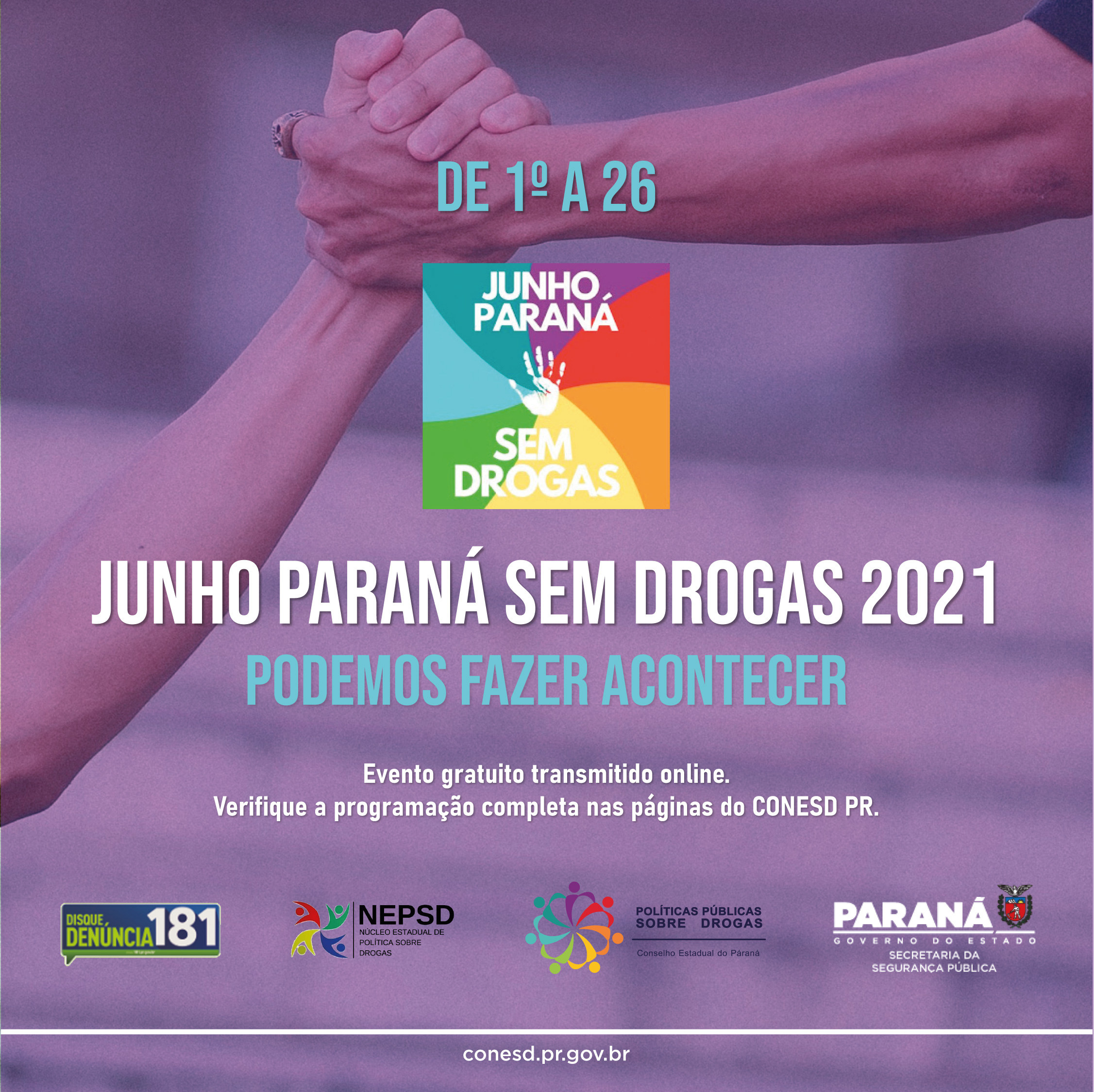 O Governo do Estado inicia nesta terça-feira (1º) a campanha Junho Paraná sem Drogas, que dedica o mês a ações de conscientização, prevenção e tratamento ao uso de drogas e substâncias químicas. A campanha é realizada pela Secretaria estadual da Segurança Pública, por meio do Conselho Estadual de Políticas Públicas Sobre Drogas do Paraná (Conesd), juntamente com o Núcleo Estadual de Política Sobre Drogas (Nepsd). - Foto/Arte: SESP
