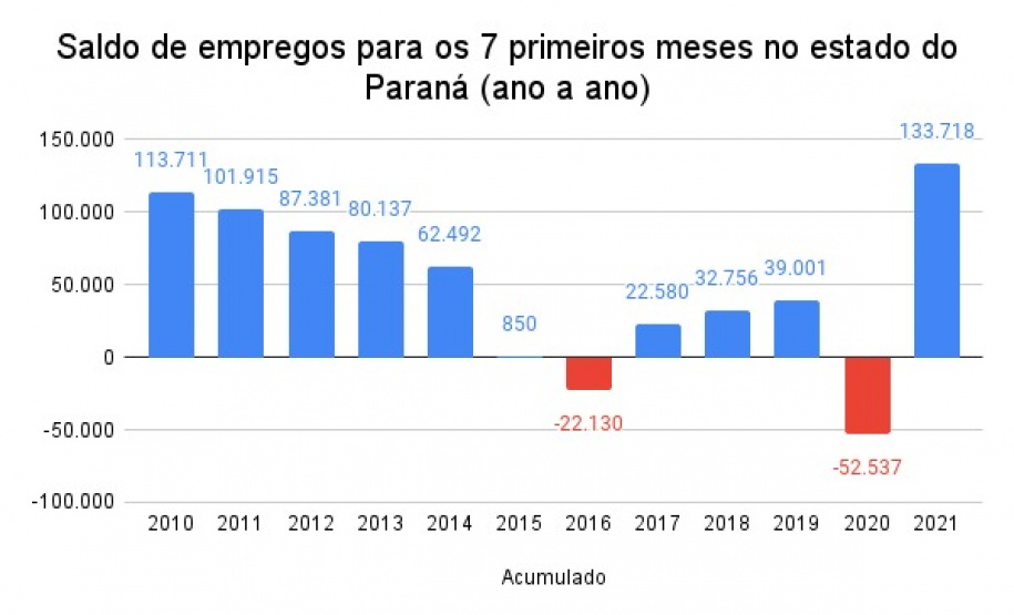 O saldo acumulado do ano, entre janeiro e julho, é de 132.328 empregos. O resultado faz do Paraná o quarto do país que mais abriu postos de trabalho em 2021, atrás apenas de São Paulo (594.613), Minas Gerais (219.560) e Santa Catarina (139.410). O desempenho demonstra a recuperação econômica após a fase mais crítica da pandemia.