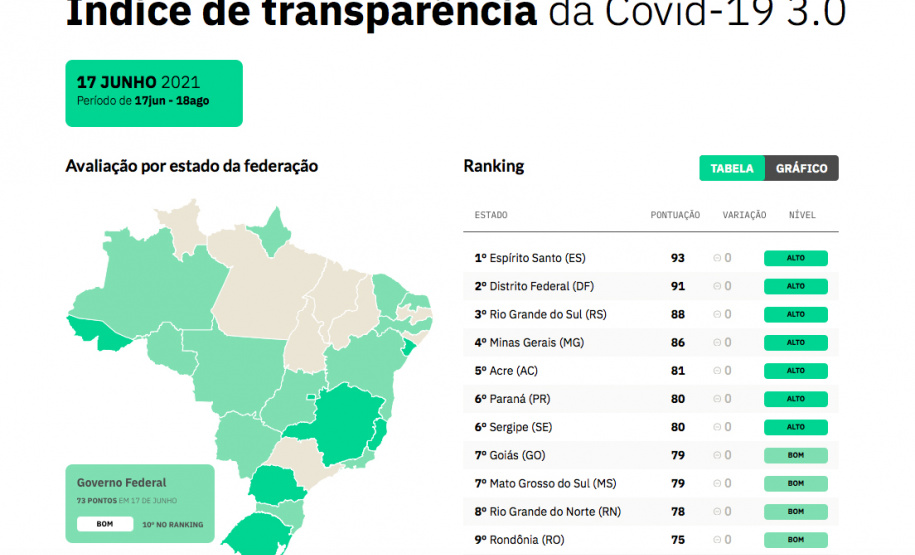 A transparência do Paraná com relação ao enfrentamento da Covid-19 recebeu novo conceito alto da Open Knowledge Brasil, organização da sociedade civil que tem acompanhado a disponibilização de informações pelos estados. O ranking divulgado nesta quinta-feira (17) é o terceiro elaborado pela entidade e considerou outras variáveis, ausentes nas duas versões anteriores do Índice de Transparência da Covid-19 (ITC).