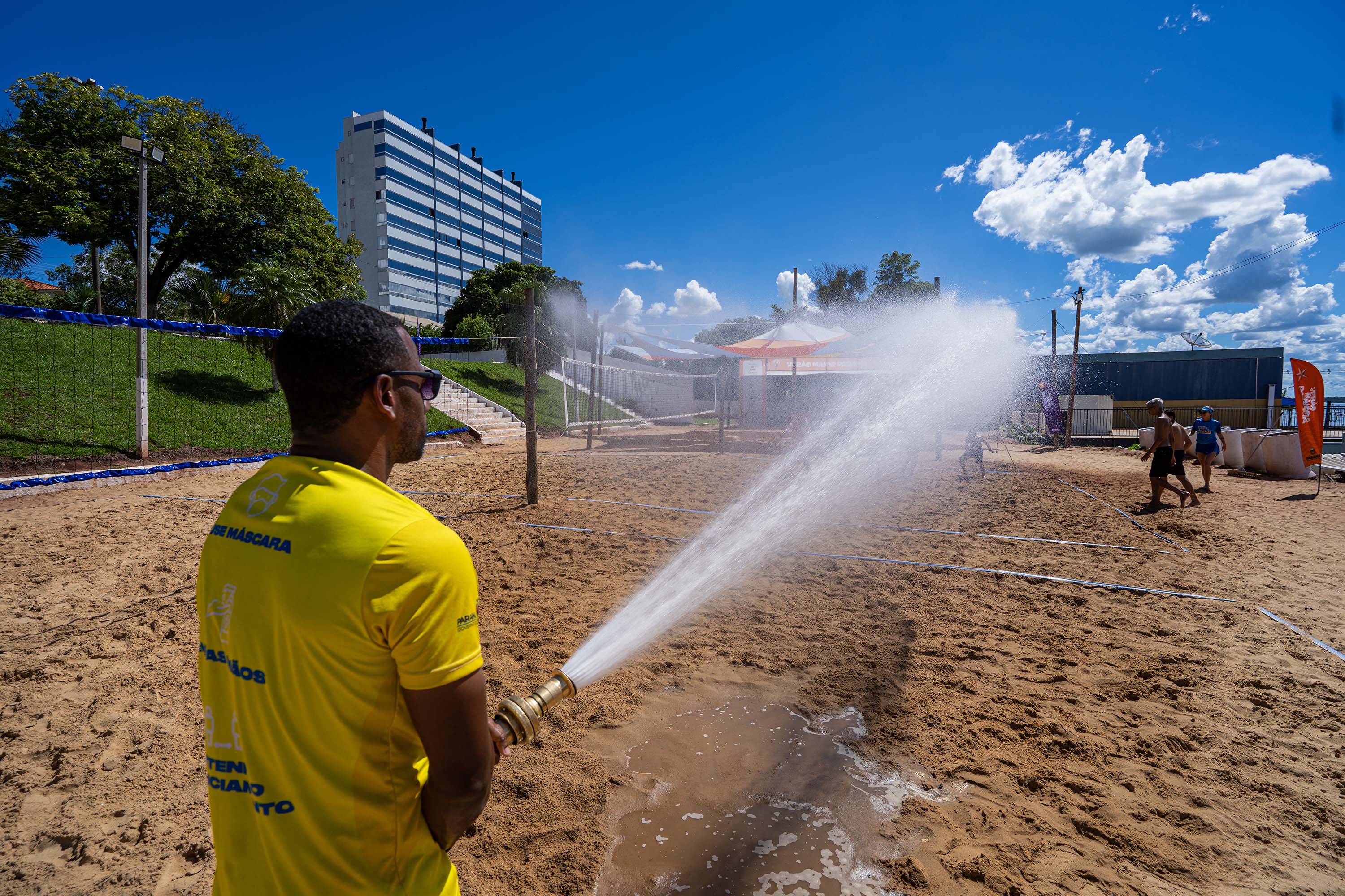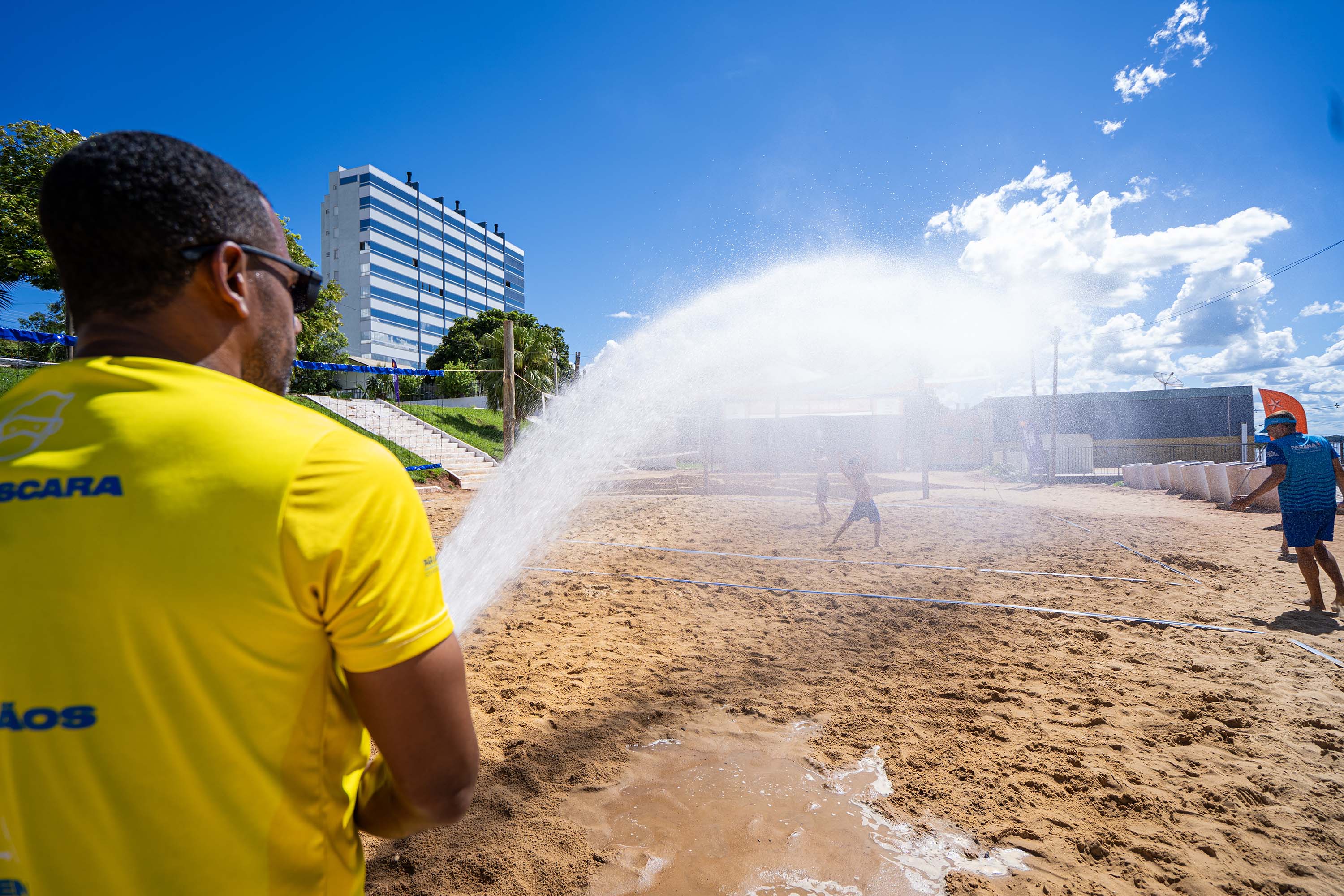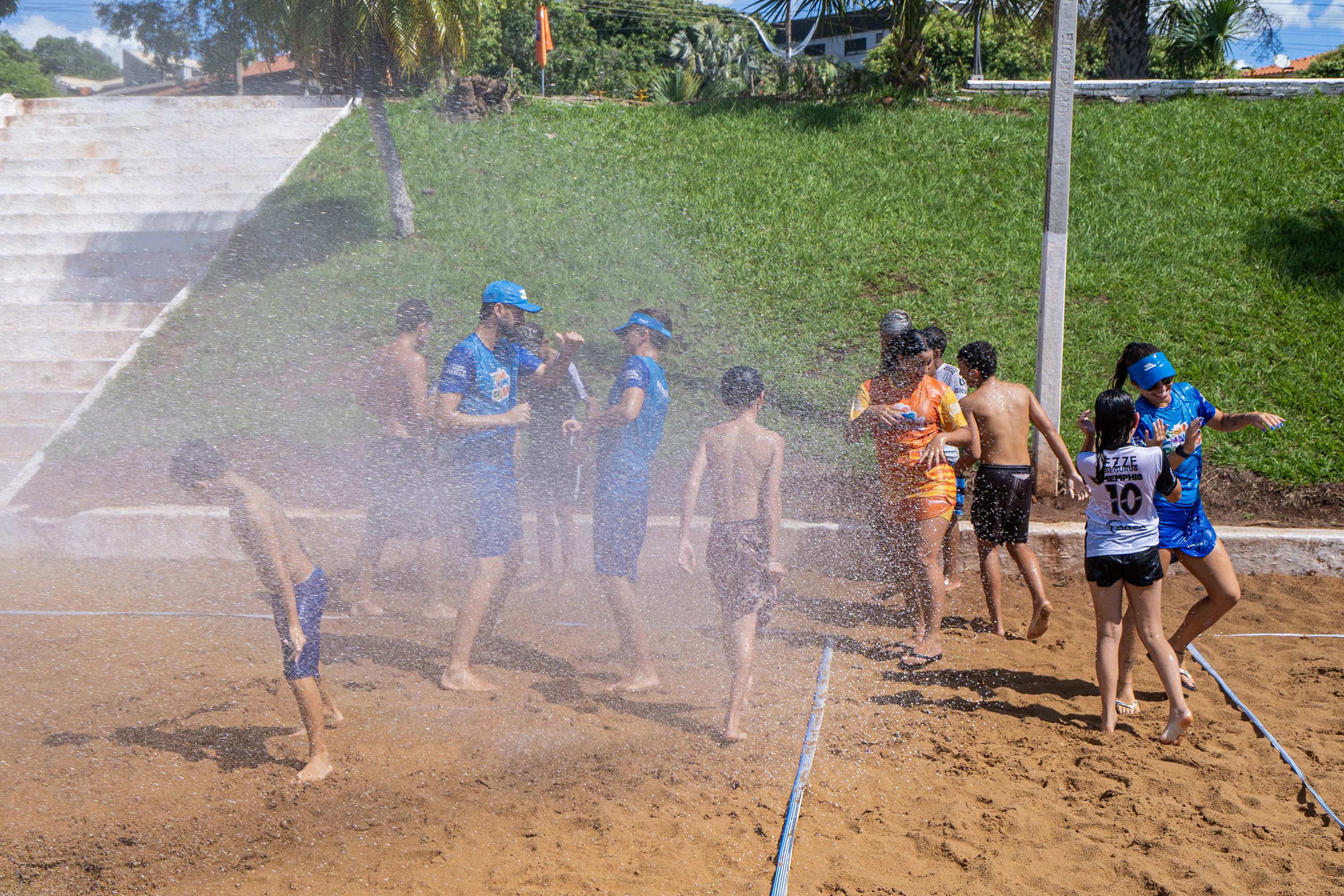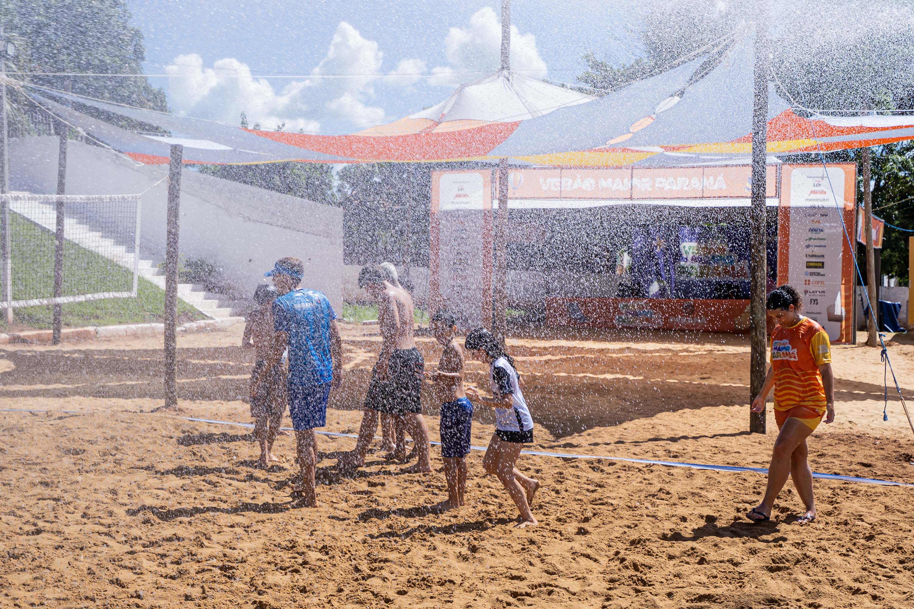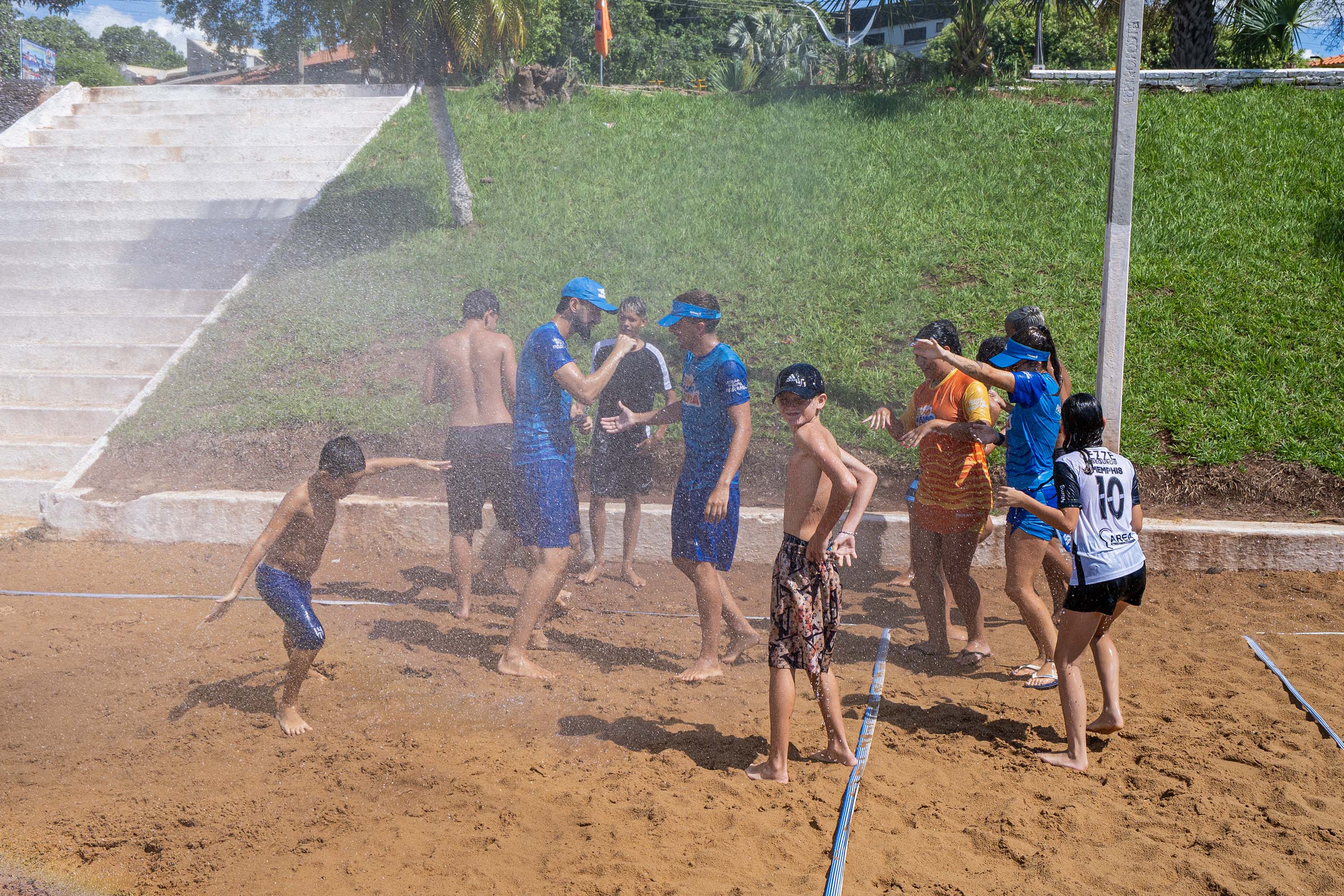As atividades acontecem diariamente, das 9h às 12h e das 15h às 19h. Antes de voltar ao esporte, um dos momentos mais esperados pela criançada é o banho de mangueira, usado para refrescar a areia quente e dar mais conforto às brincadeiras. Simples e eficiente, a estratégia garante energia para mais uma tarde de diversão. Bastam poucos minutos para a alegria tomar conta do espaço.