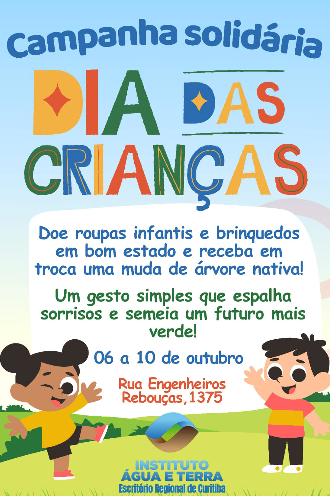 O Instituto Água e Terra (IAT) começou nesta segunda-feira (06) uma campanha solidária voltada para o Dia das Crianças, comemorado no domingo (12). A ação de educação ambiental estimula a troca de roupas infantis e brinquedos novos ou em bom estado por mudas de espécies nativas. O IAT é uma autarquia vinculada à Secretaria de Estado do Desenvolvimento Sustentável (Sedest).