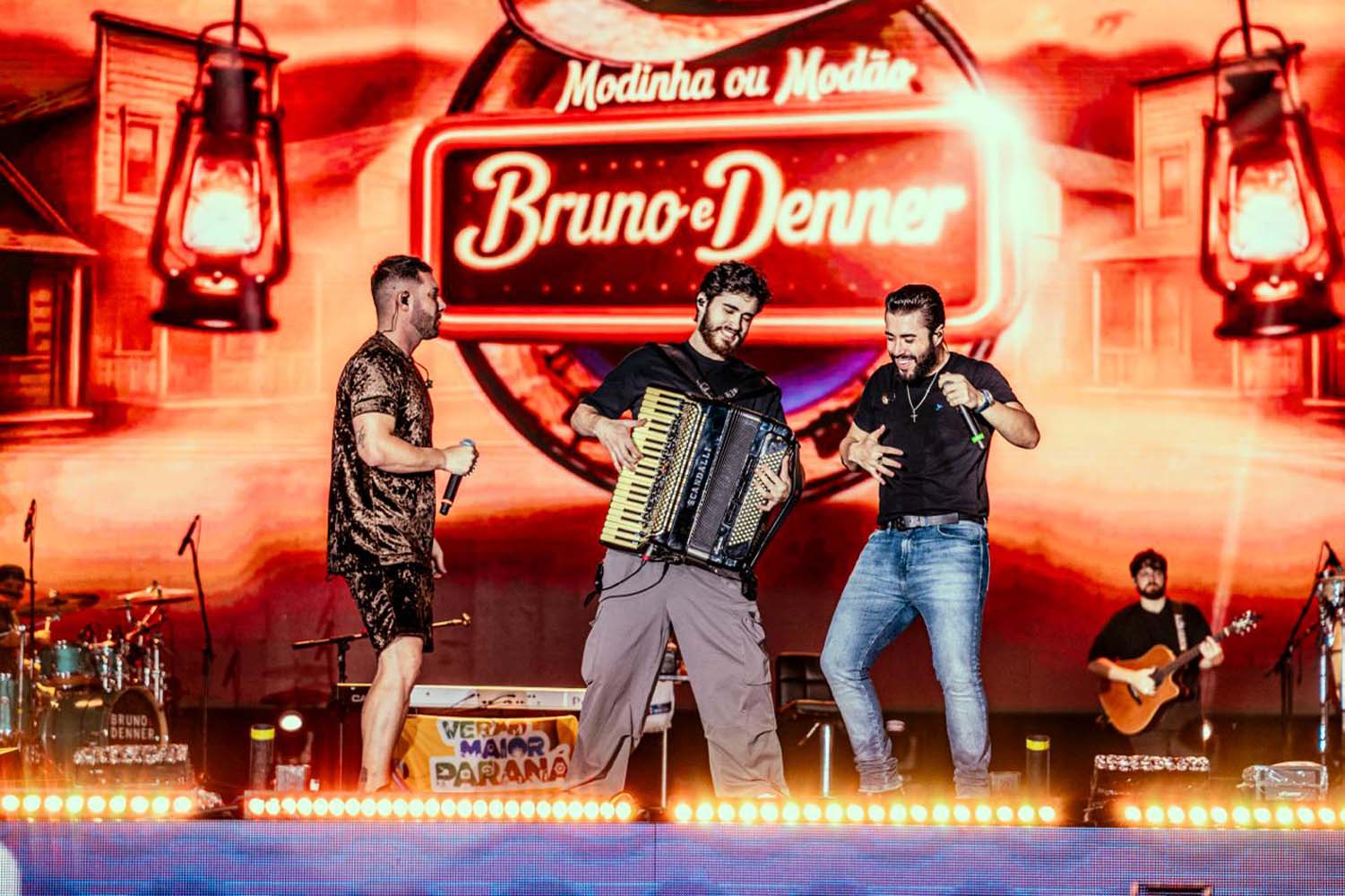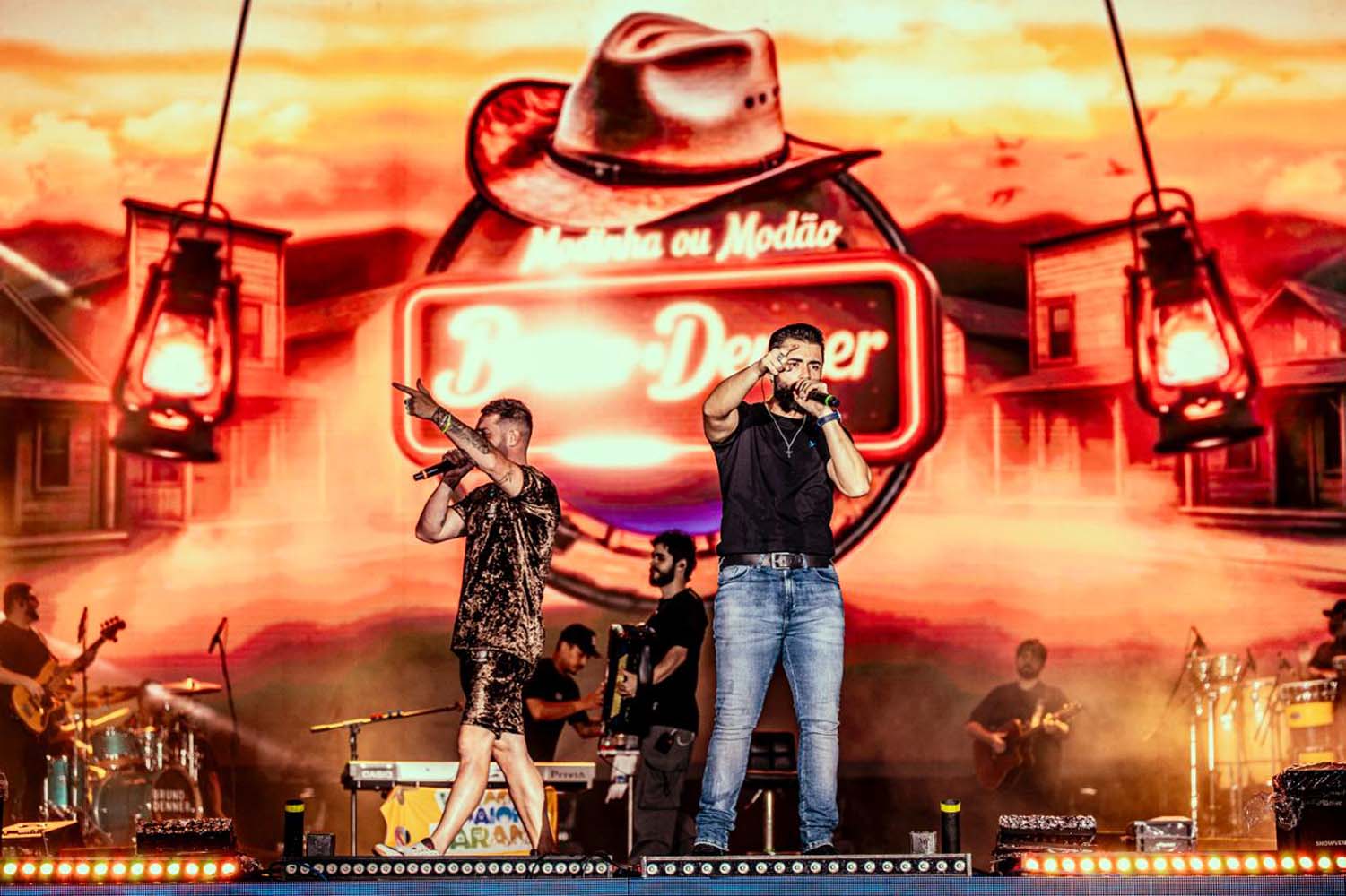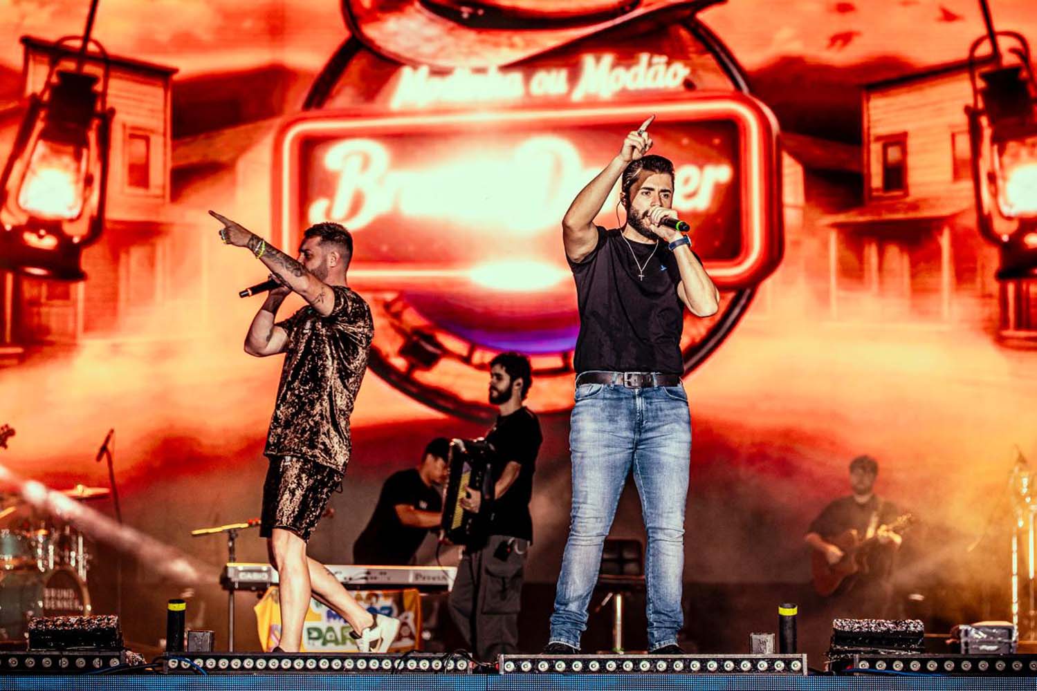 Conhecidos por unir a tradição sertaneja a elementos modernos, Bruno & Denner empolgaram públicos de todas as idades com releituras de músicas famosas, como “Gosta de Rua”, de Felipe & Rodrigo; “Barulho do Foguete”, de Zé Neto & Cristiano; e “Não Vitalício”, de Mari Fernandez e Matheus & Kauan.