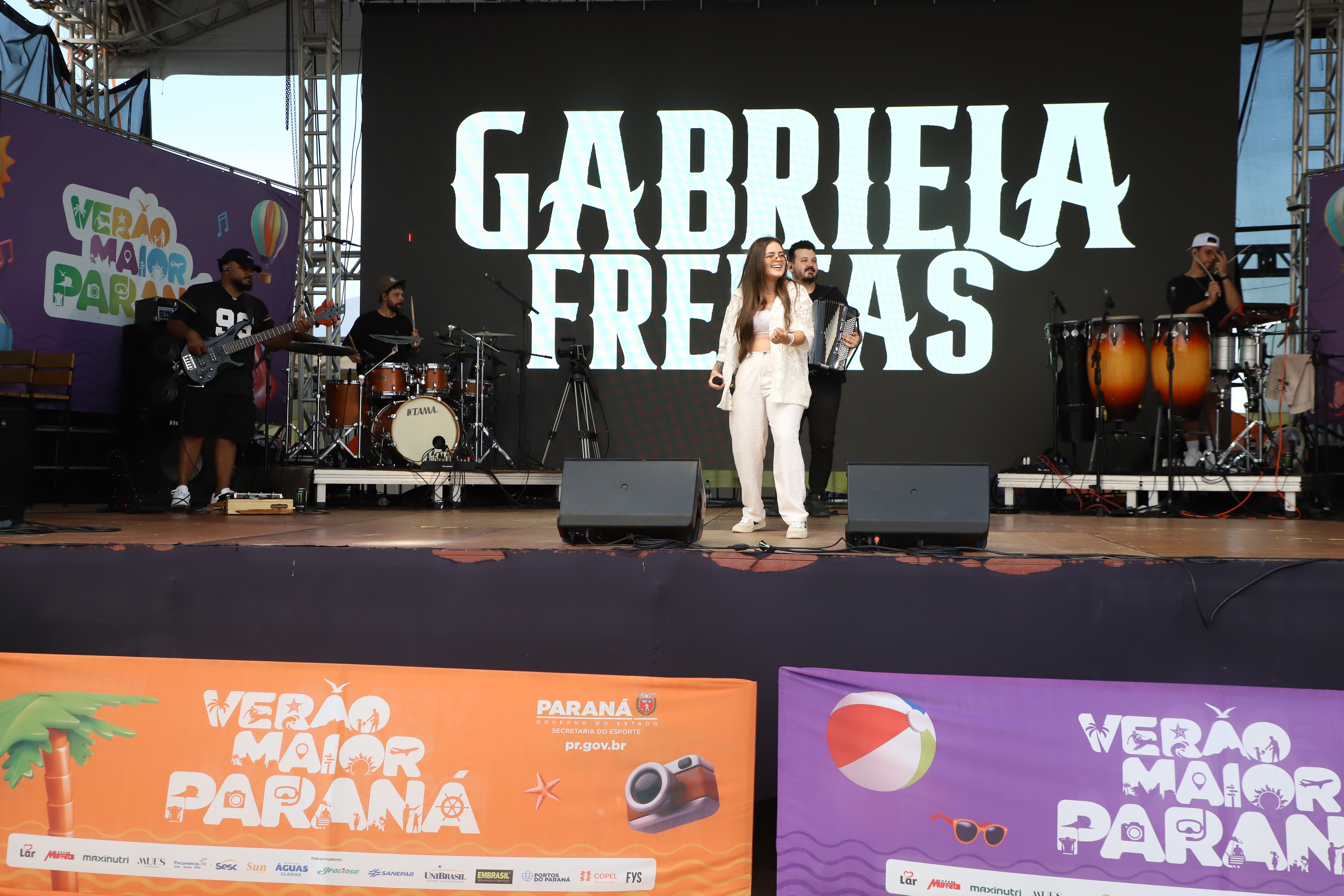 A primeira a subir ao palco foi a curitibana Gabriela Freitas, que levantou a plateia com muito sertanejo. Veterana do Verão Maior Paraná, ela voltou ao festival em um novo momento da carreira, agora em trajetória solo, após ter participado de uma edição anterior como dupla. Para a cantora, a apresentação teve um significado especial. “Para mim é uma honra estar fazendo parte do Verão Paraná. A carreira solo é um passo enorme pra mim, eu estou muito contente de estar aqui, muito feliz e quero agradecer ao governo pela oportunidade", disse.