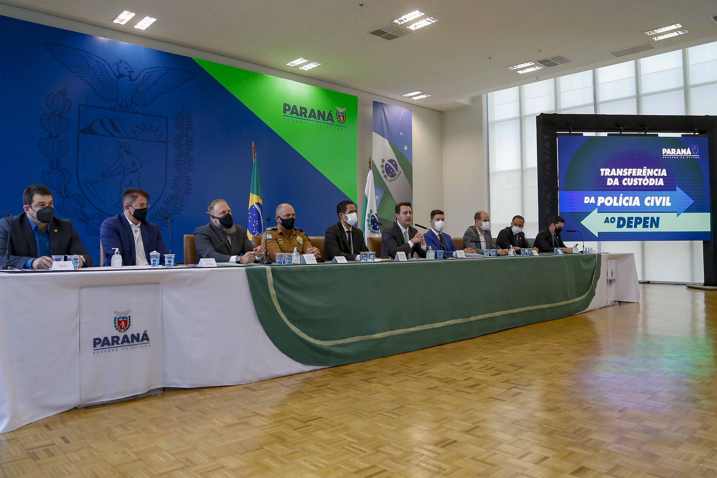 O dia 15 de setembro de 2021 é histórico para a segurança pública do Paraná. Após anos de espera, o Estado não terá mais presos custodiados por integrantes da Polícia Civil. Isso só foi possível com o decreto assinado pelo governador Carlos Massa Ratinho Junior nesta quarta-feira (15), em cerimônia no Palácio Iguaçu, que autoriza o início da terceira e última fase do processo de transferência de gestão, com o repasse da custódia dos últimos detentos das carceragens da Polícia Civil para a gestão plena do Departamento Penitenciário do Paraná (Depen). No total, cerca de 12 mil pessoas privadas de liberdade tiveram a situação regularizada desde 2019.