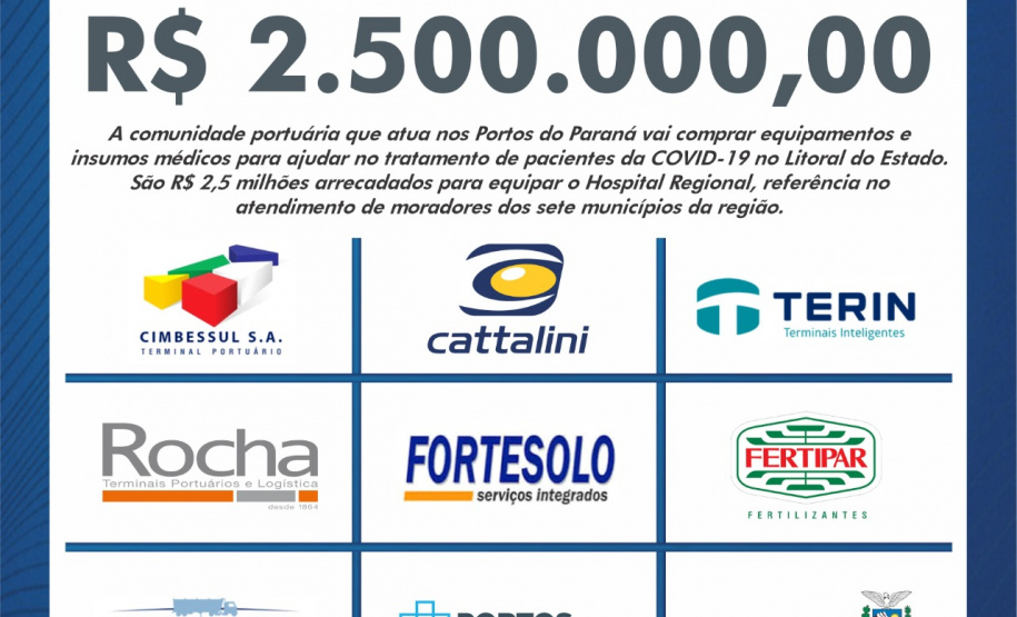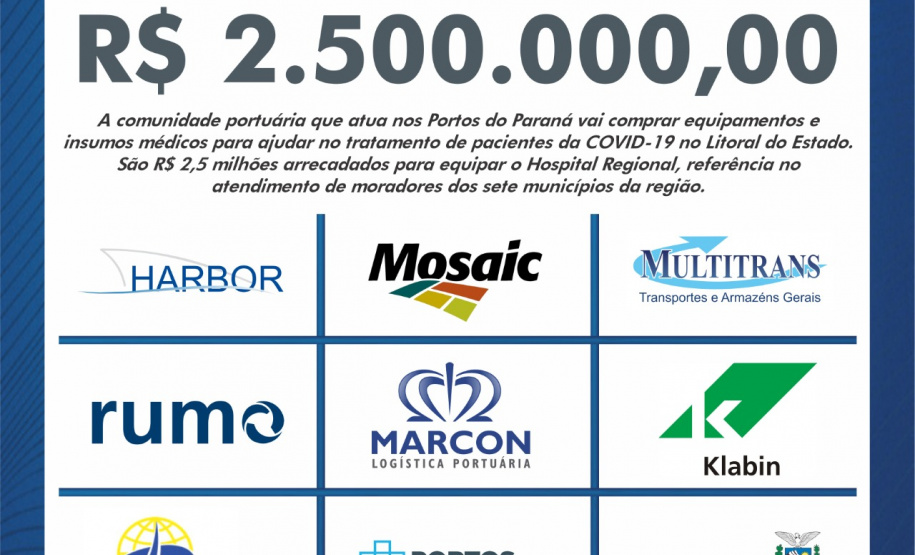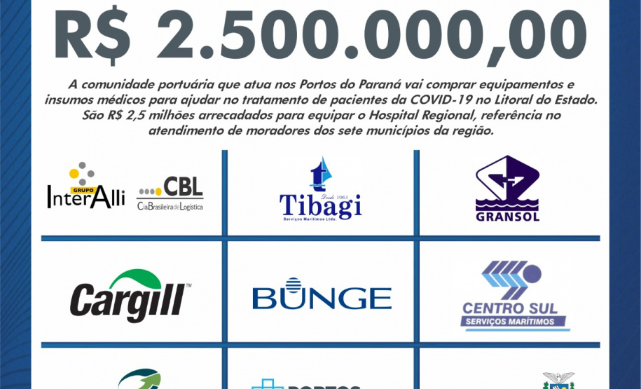A ajuda vem de 30 empresas, sindicatos, cooperativas e outros órgãos. Os equipamentos serão adquiridos conforme a necessidade da administração hospitalar. “A comunidade portuária se uniu porque sabe do papel fundamental que desempenha na vida da população. Neste momento de crise, o porto reforça a missão de zelar e melhorar a vida das pessoas”, destaca o presidente da empresa Portos do Paraná, Luiz Fernando Garcia.