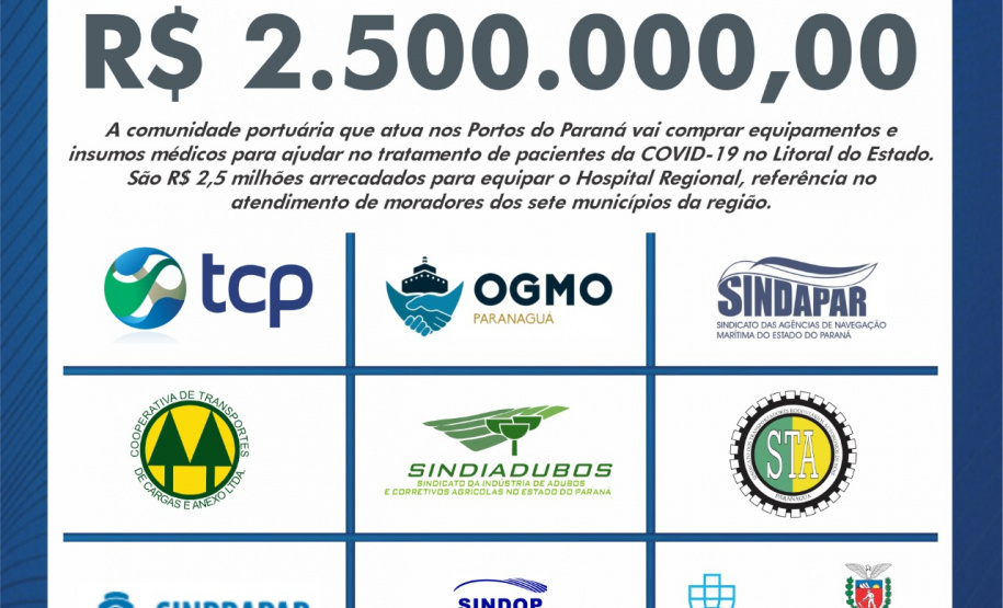 A comunidade portuária que atua nos portos do Paraná vai comprar equipamentos e insumos médicos para ajudar no tratamento de pacientes da Covid-19 no Litoral do Estado. São R$ 2,5 milhões arrecadados para equipar o Hospital Regional, referência no atendimento de moradores dos sete municípios da região.