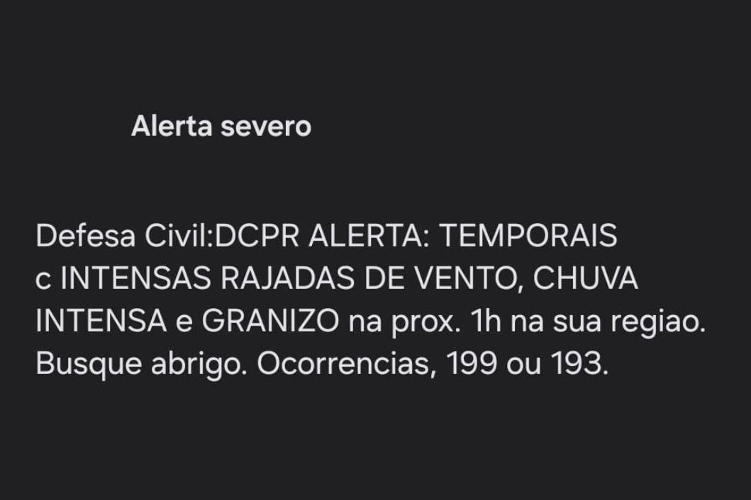 Neste sábado (7), por volta das 17h40, o município de Curitiba recebeu o seu primeiro alerta por meio do sistema cell broadcast. Esse sistema alerta para situações de tempestades mais extremas, que exigem uma ação imediata das pessoas em buscar um local seguro. Por isso essa mensagem, que não exige cadastro prévio na Defesa Civil, se sobrepõe as informações no celular, obrigando que a pessoa interaja e saiba que existe o alerta para região.