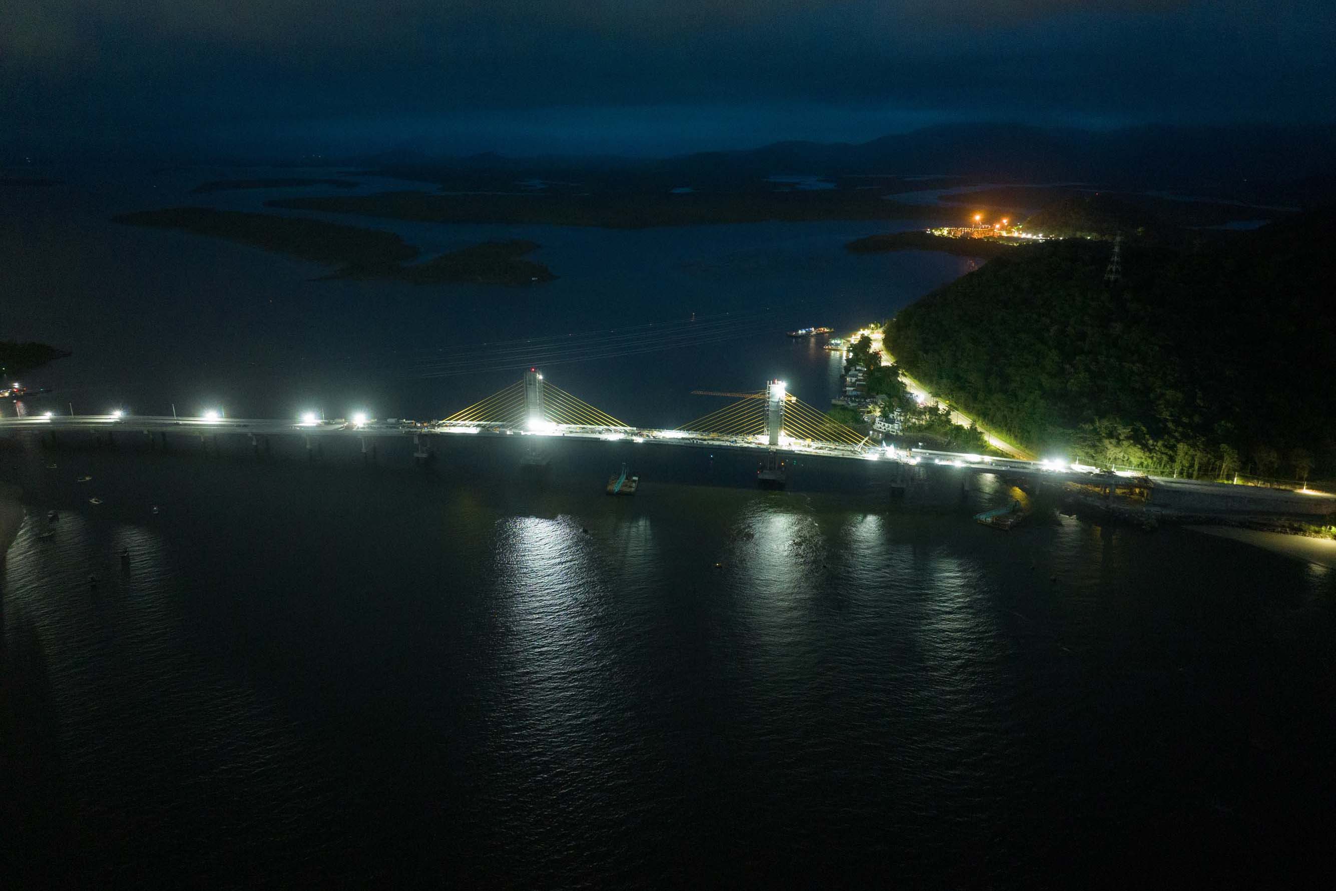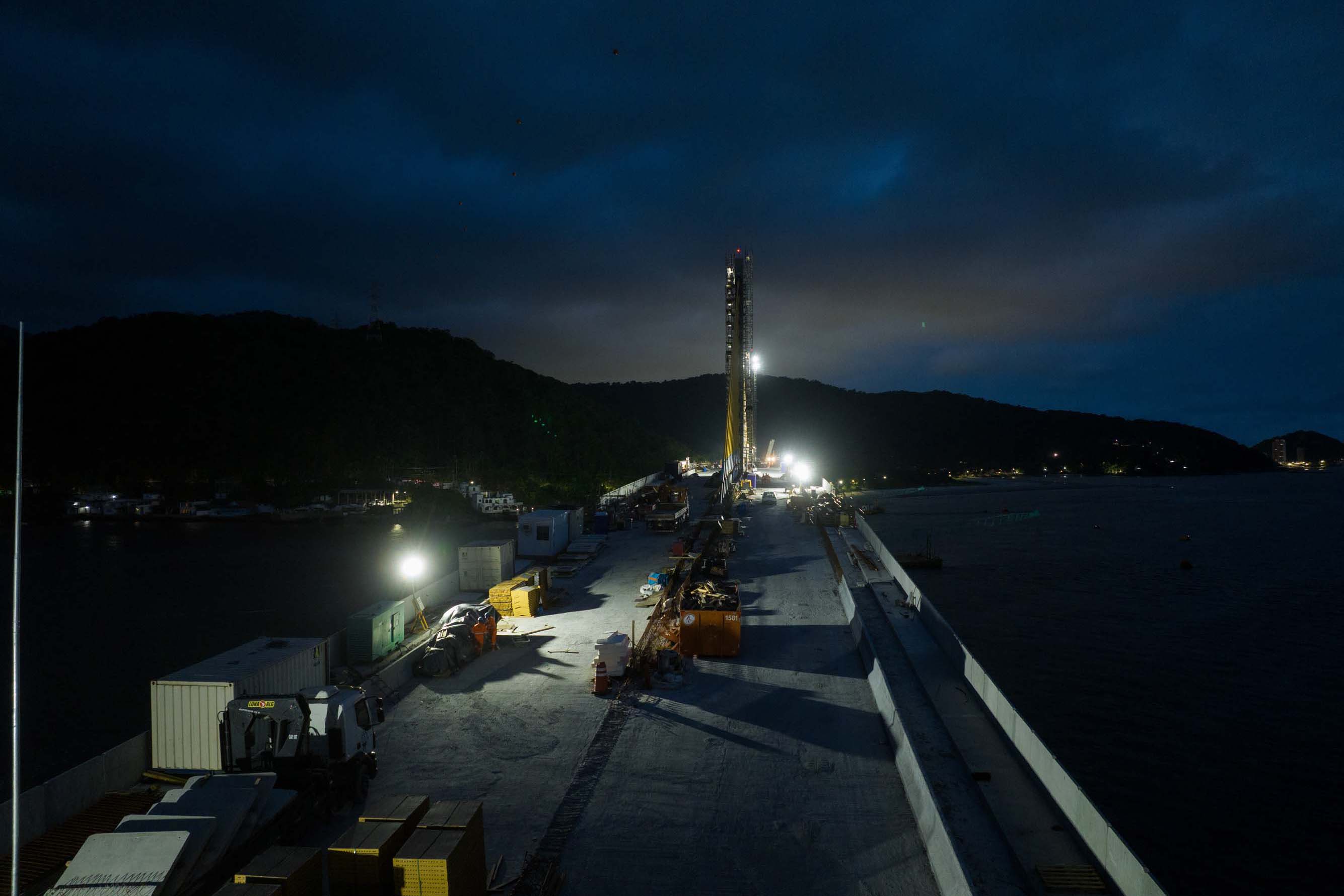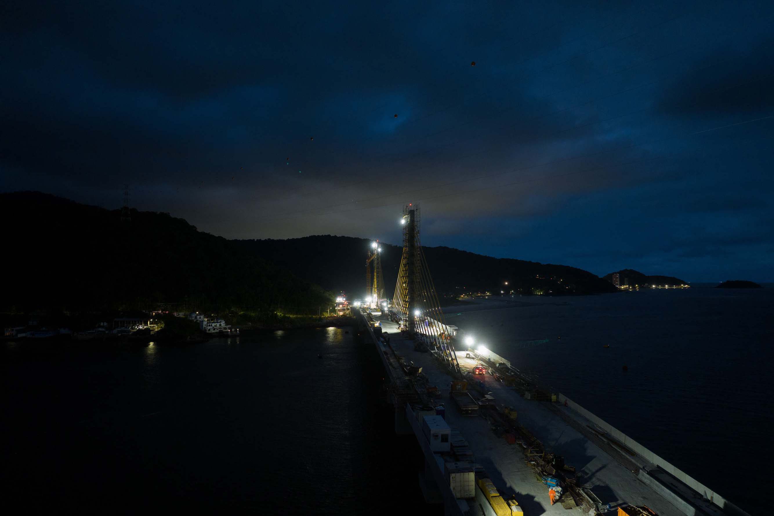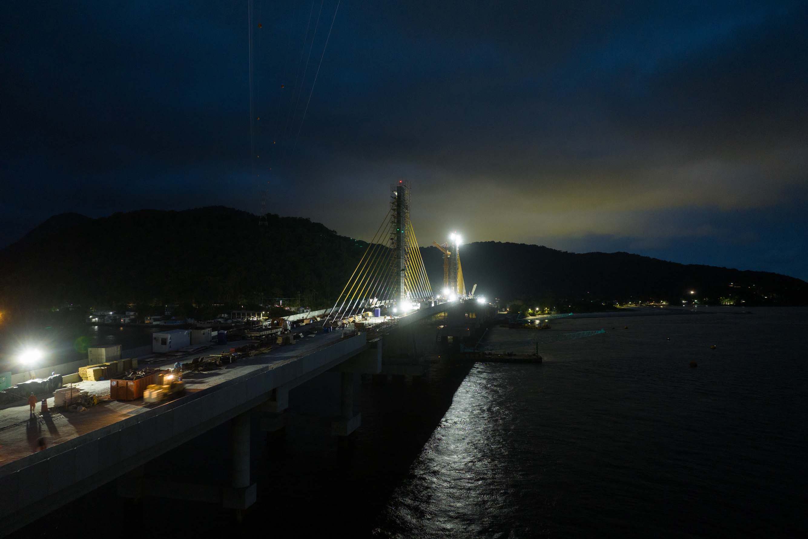 Os trabalhos na construção da Ponte de Guaratuba seguem a todo vapor, 24 horas por dia. Mesmo com a ligação definitiva, os serviços seguem inclusive à noite e estão concentrados na fase de acabamentos e acessos. Os trabalhos de armação que foram feitos ao longo dos últimos meses durante as noites e madrugadas para apoiar os trabalhos diurnos já encerraram.