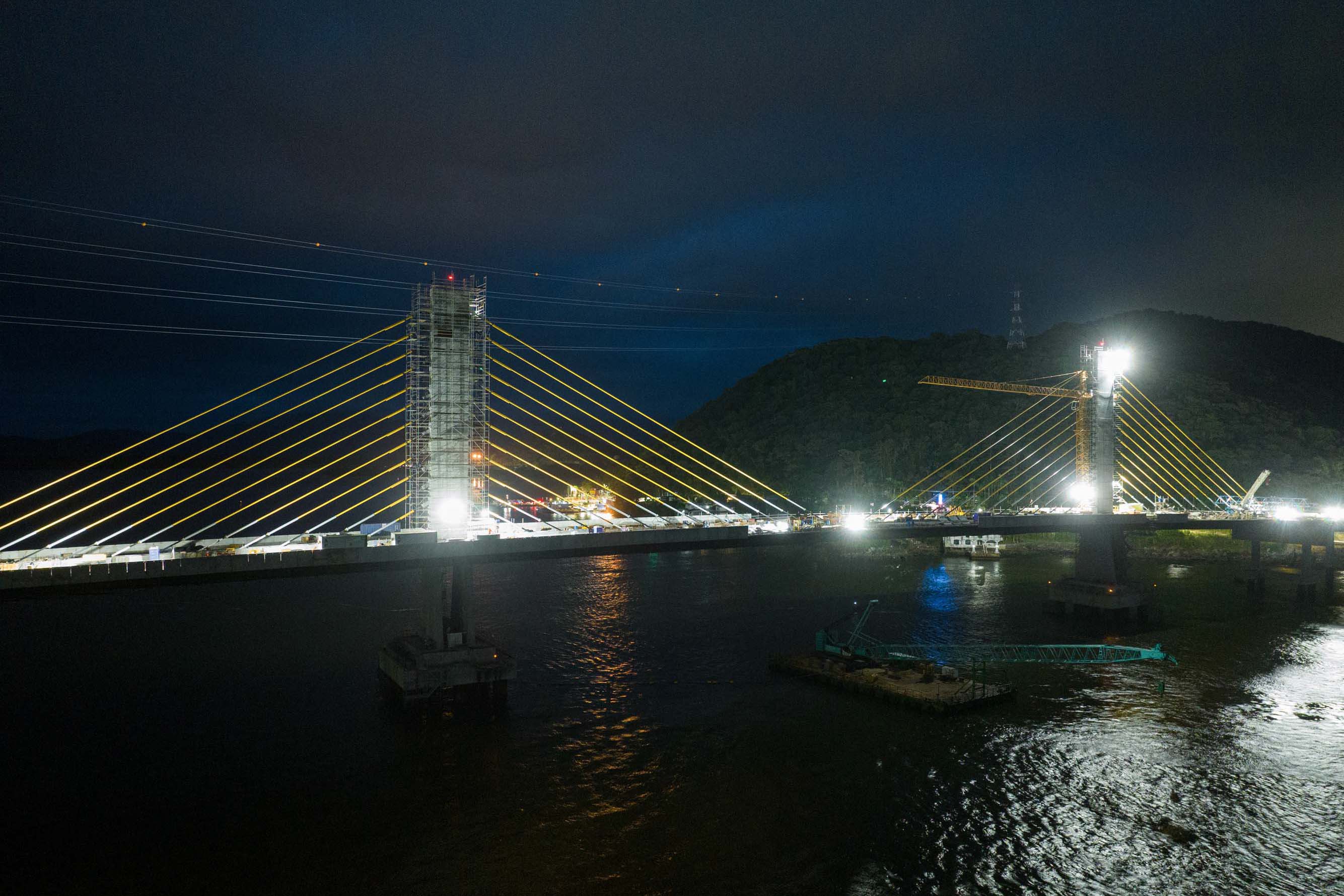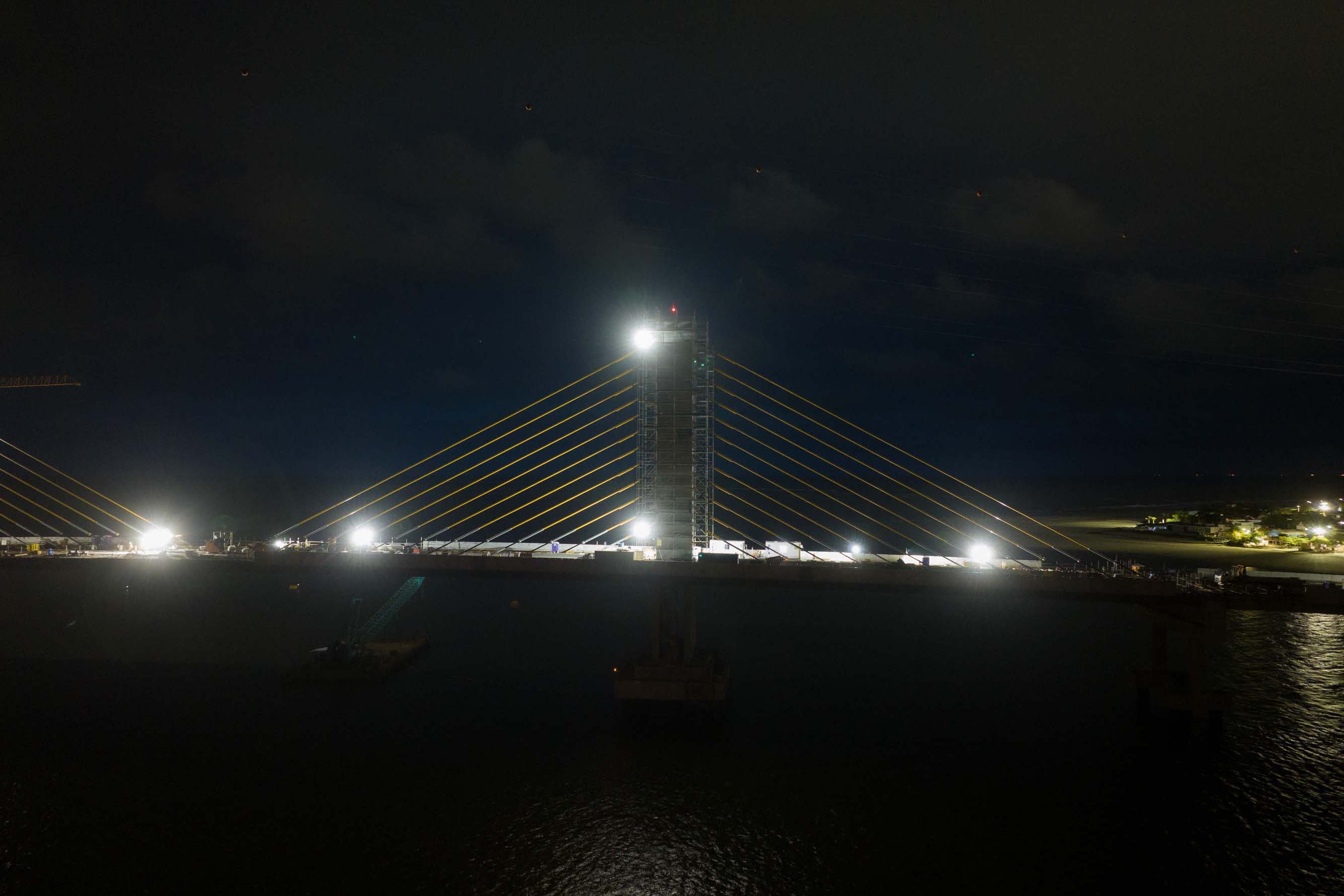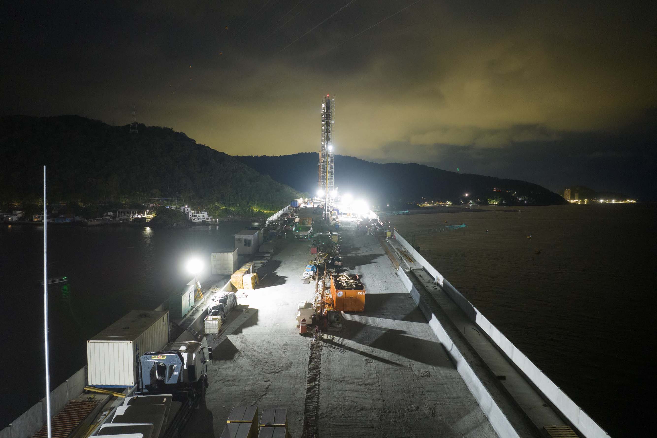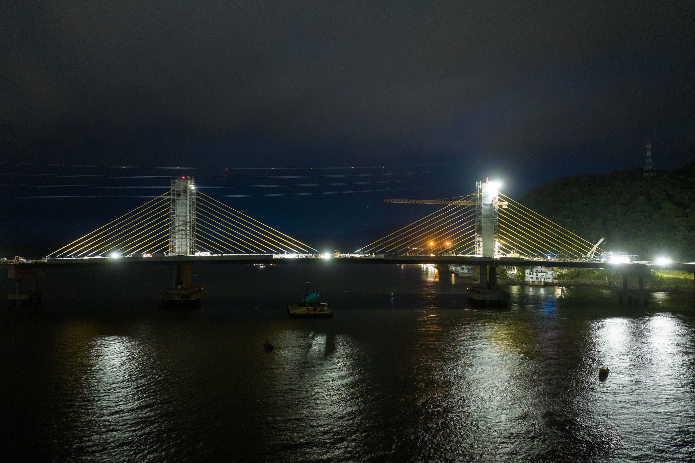 Os trabalhos na construção da Ponte de Guaratuba seguem a todo vapor, 24 horas por dia. Mesmo com a ligação definitiva, os serviços seguem inclusive à noite e estão concentrados na fase de acabamentos e acessos. Os trabalhos de armação que foram feitos ao longo dos últimos meses durante as noites e madrugadas para apoiar os trabalhos diurnos já encerraram.