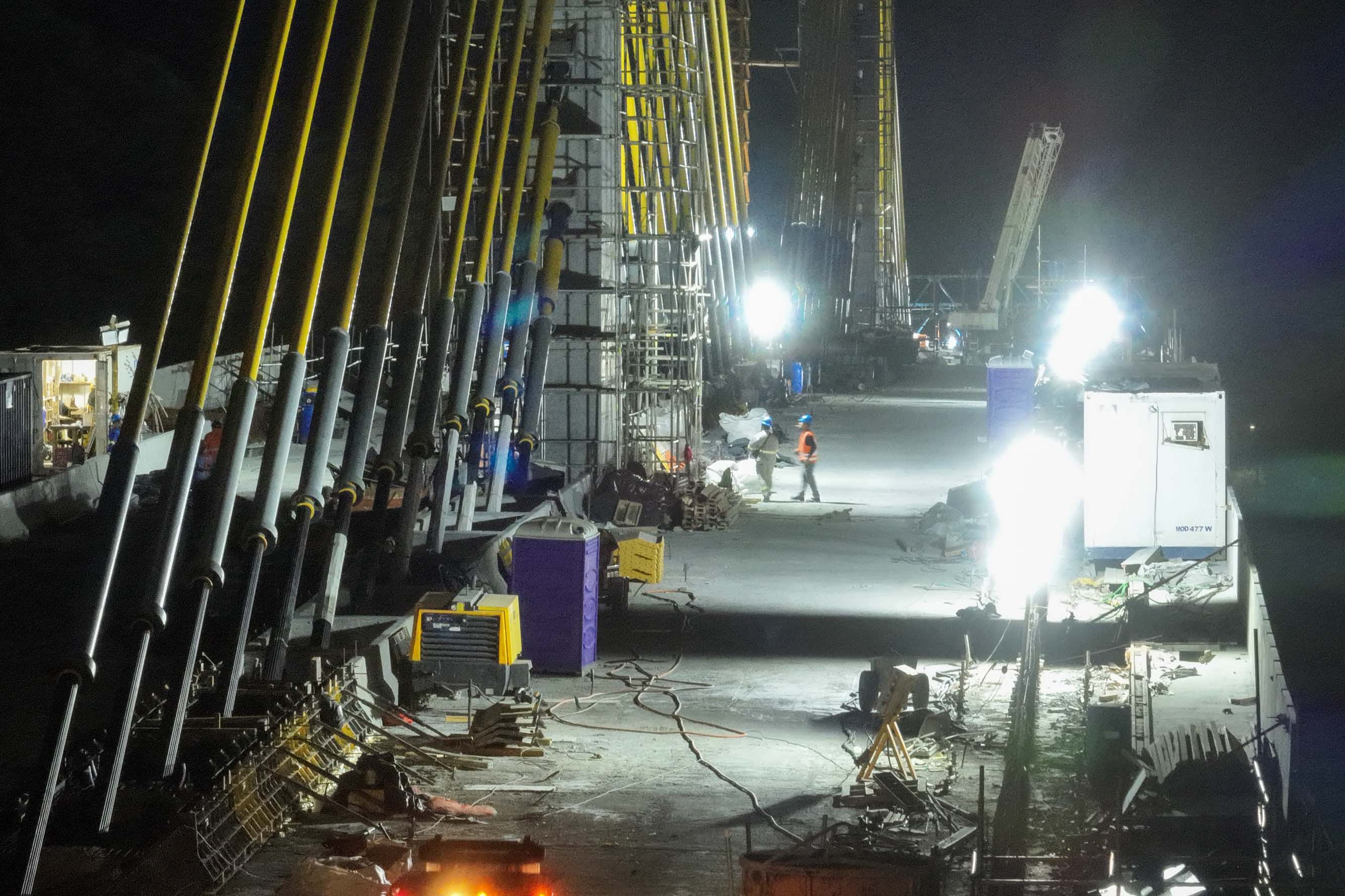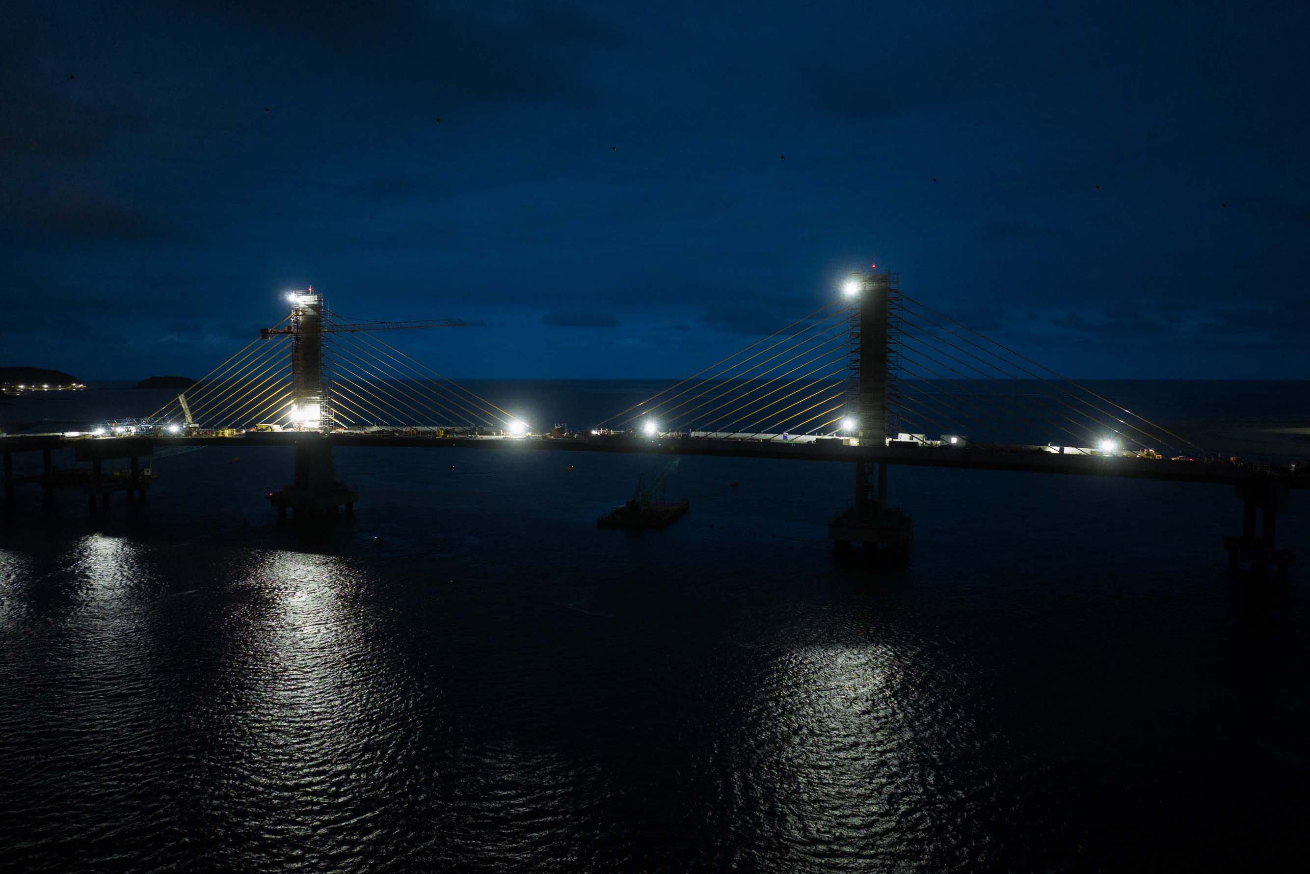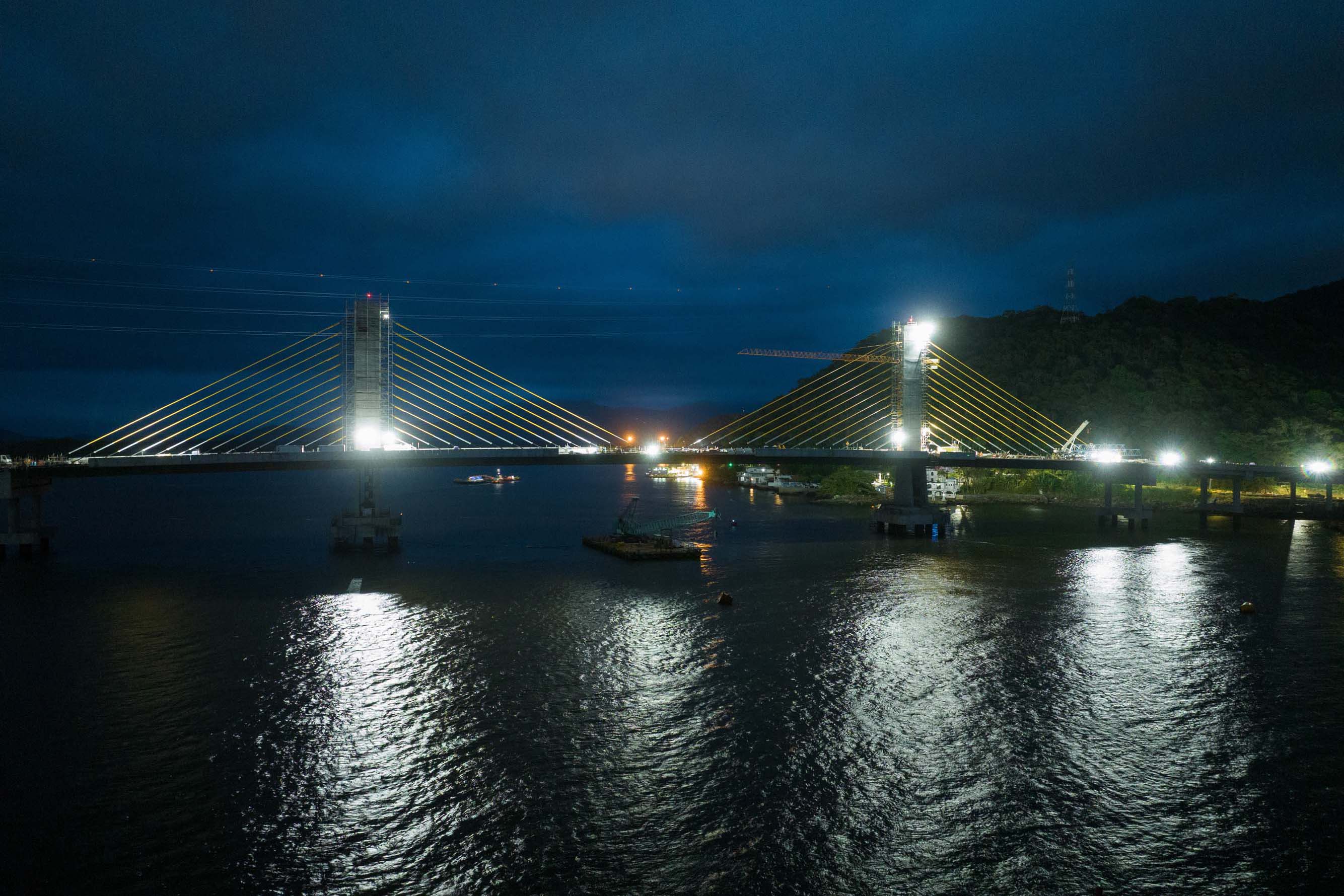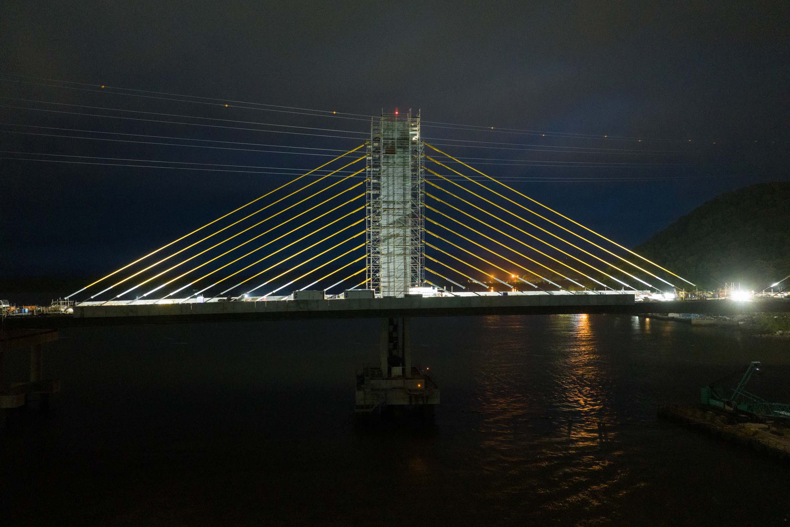 Os trabalhos na construção da Ponte de Guaratuba seguem a todo vapor, 24 horas por dia. Mesmo com a ligação definitiva, os serviços seguem inclusive à noite e estão concentrados na fase de acabamentos e acessos. Os trabalhos de armação que foram feitos ao longo dos últimos meses durante as noites e madrugadas para apoiar os trabalhos diurnos já encerraram.
