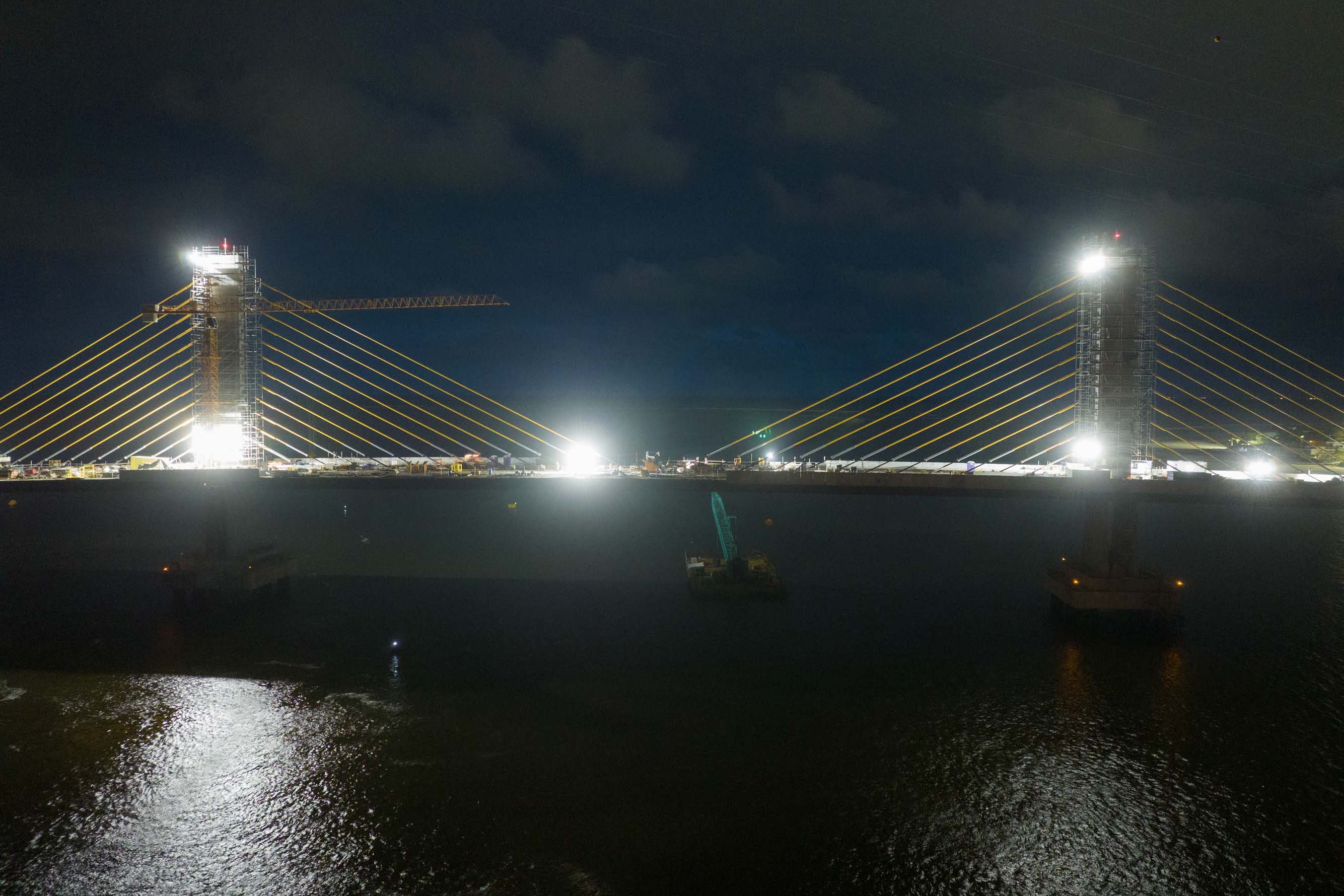 Finalizada a instalação dos estais e, por consequência, o tabuleiro central, com o famoso “beijo da ponte”, os serviços agora tem como foco a instalação de barreiras de concreto New Jersey (dispositivo que vai dividir o sentido das pistas), em grande parte já instaladas, assim como postes de iluminação pública e os guarda-corpos que dividem a via da calçada e das laterais externas, garantindo a segurança de pedestres e ciclistas.