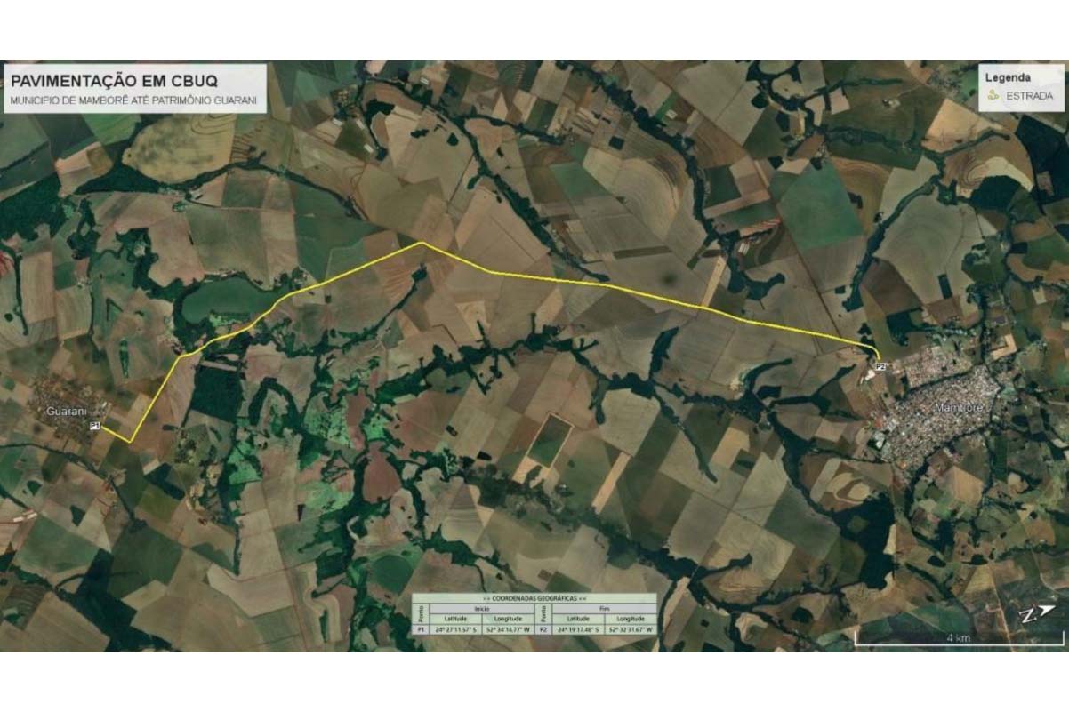 Mamborê está prestes a contratar a pavimentação da estrada de acesso ao distrito de Guarani, na região Centro-Oeste, um investimento de R$ 34.888.900,00. A obra é possível por meio de convênio com a Secretaria estadual de Infraestrutura e Logística (SEIL) e vai atender um trecho de 16,79 quilômetros ligando o distrito à sede do município.