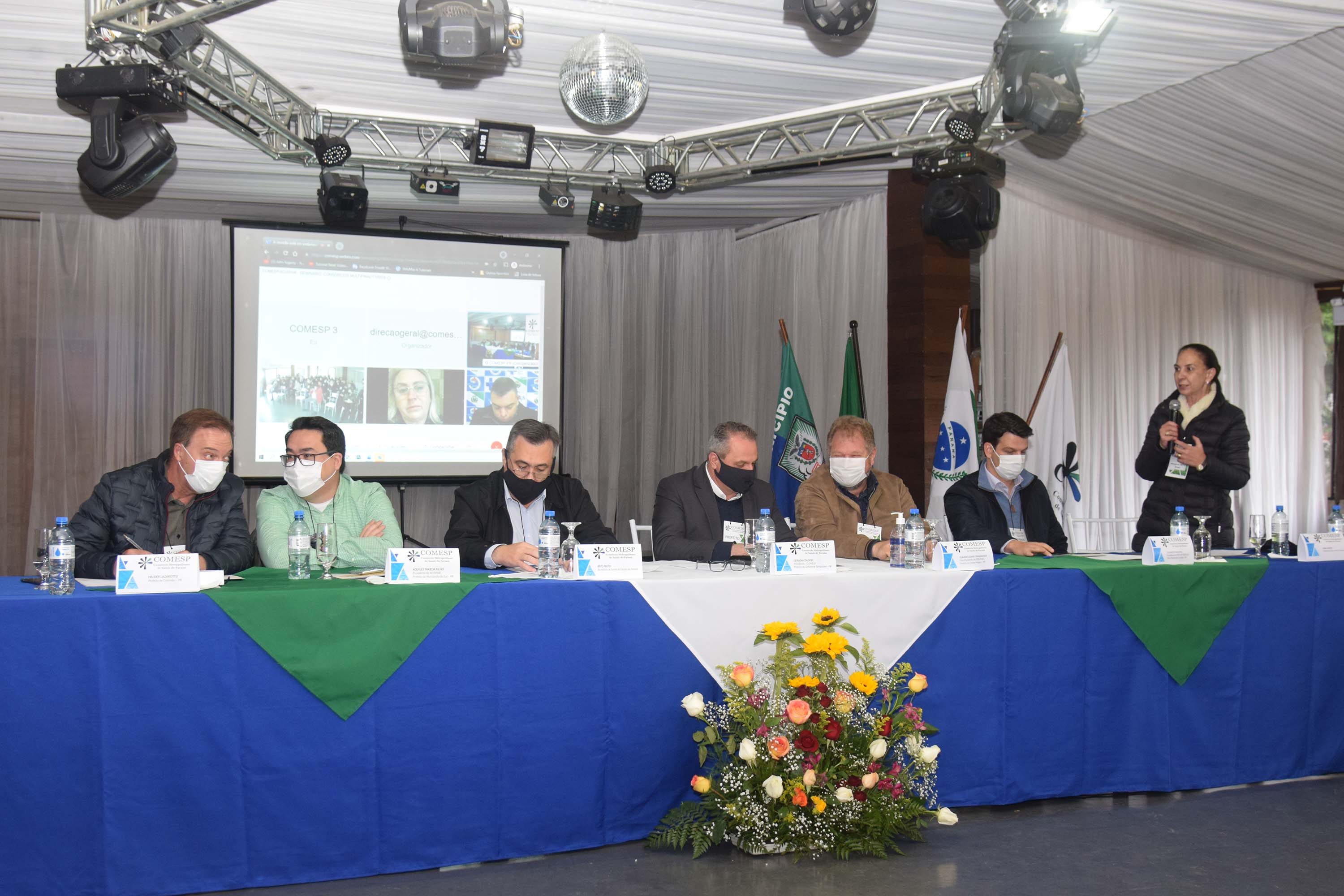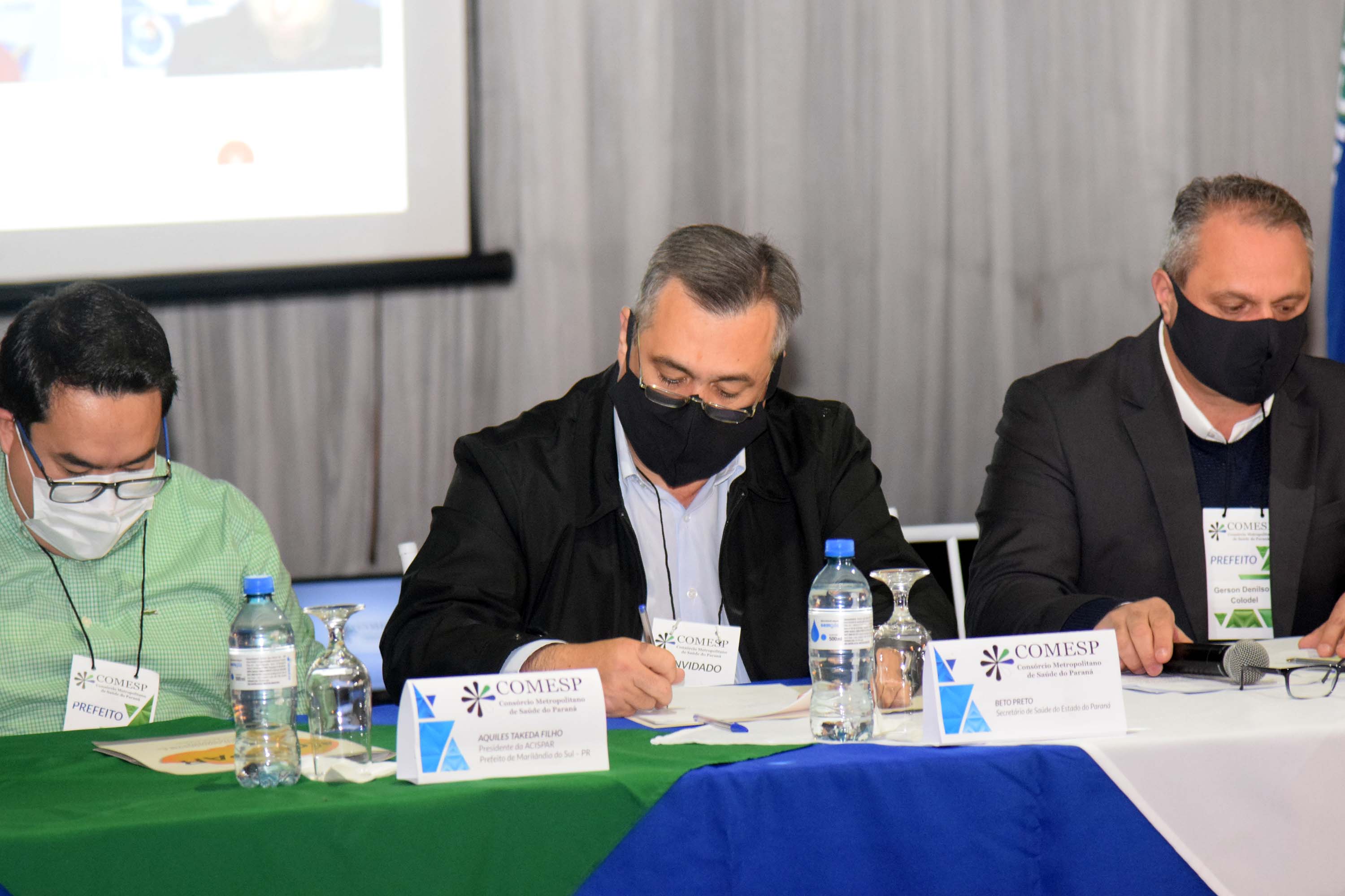 PRESENÇAS – Participaram do evento o prefeito de Marilândia do Sul e presidente da Associação dos Consórcios e Associações Intermunicipais de Saúde do Paraná (Acispar), Aquiles Takeda Filho; a prefeita de São José dos Pinhais, Nina Singer; o 1º vice-presidente da Associação dos Municípios da Região Metropolitana de Curitiba (Assomec) e prefeito de Campo Magro, Claudio Cesar Casagrande; o prefeito de Colombo, Helder Luiz Lazarotto; além de demais prefeitos e secretários municipais de saúde.