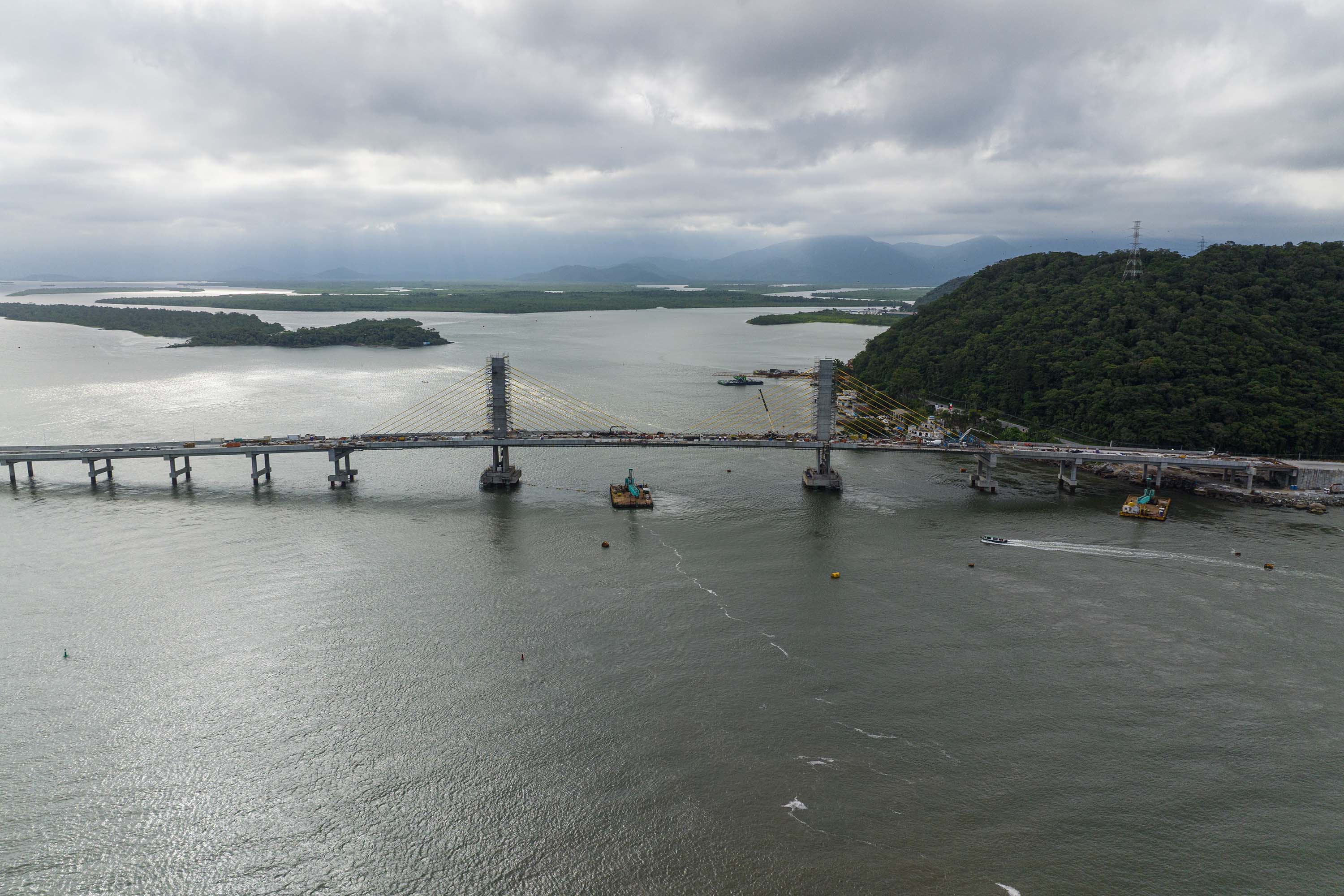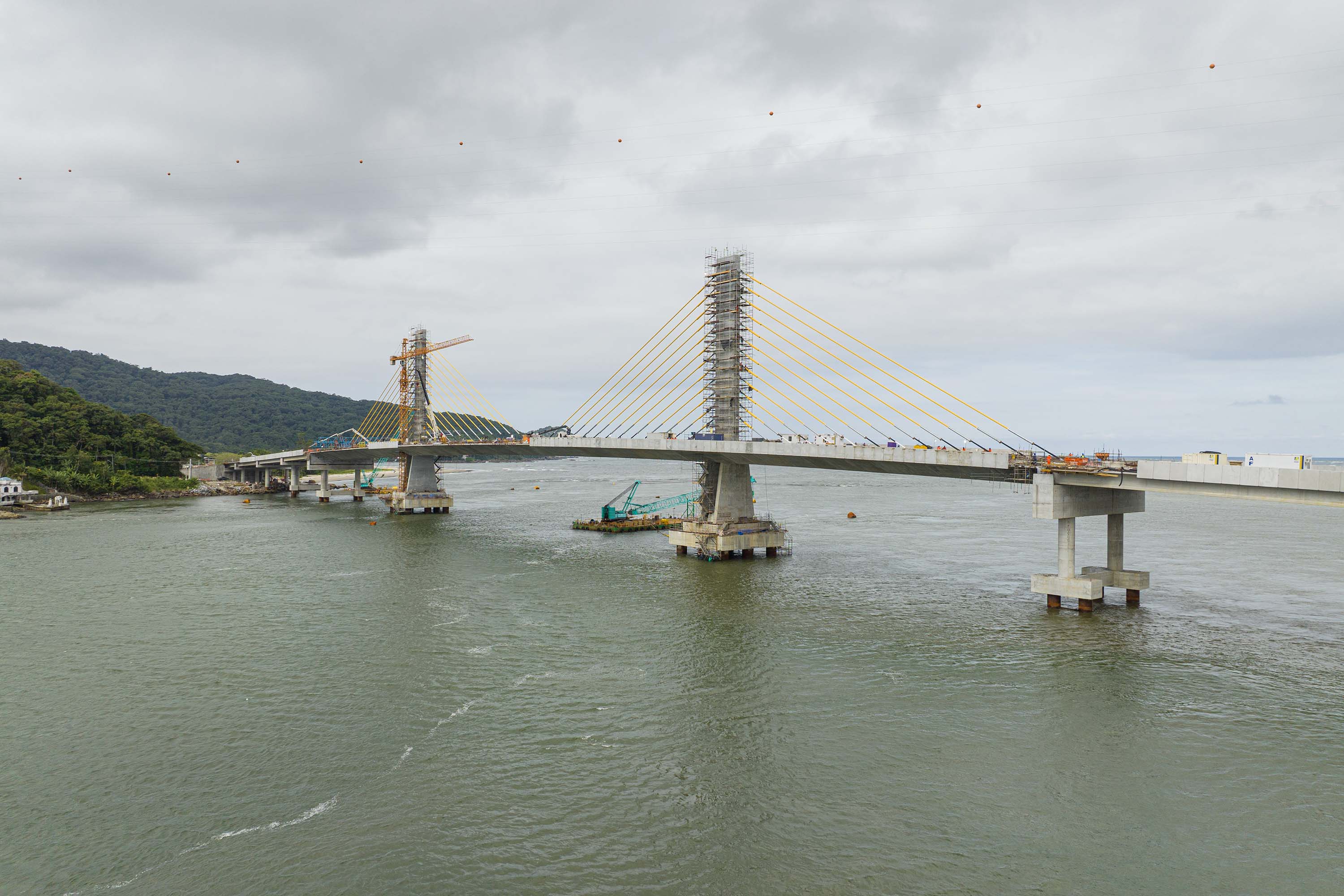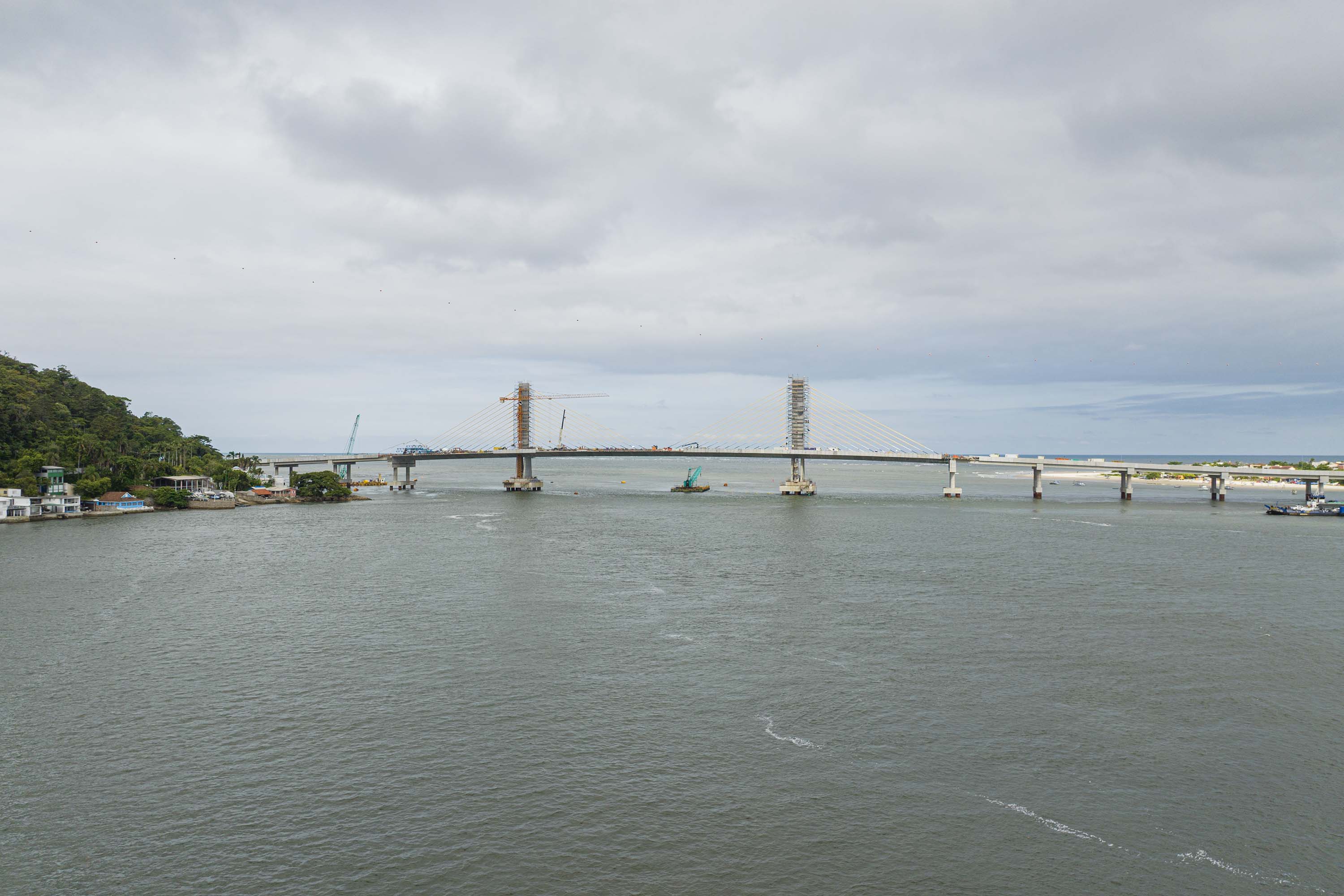 Cada vez mais próxima da inauguração, as obras da Ponte de Guaratuba seguem em bom ritmo na fase de acabamentos, o que envolve as áreas de iluminação pública, pavimentação e guarda-corpos. A evolução para a parte final foi possível graças ao término do trecho estaiado no início do mês de março, considerada a parte mais complexa e que dá identidade à ponte. A estrutura montada para a concretagem inclusive já foi retirada.