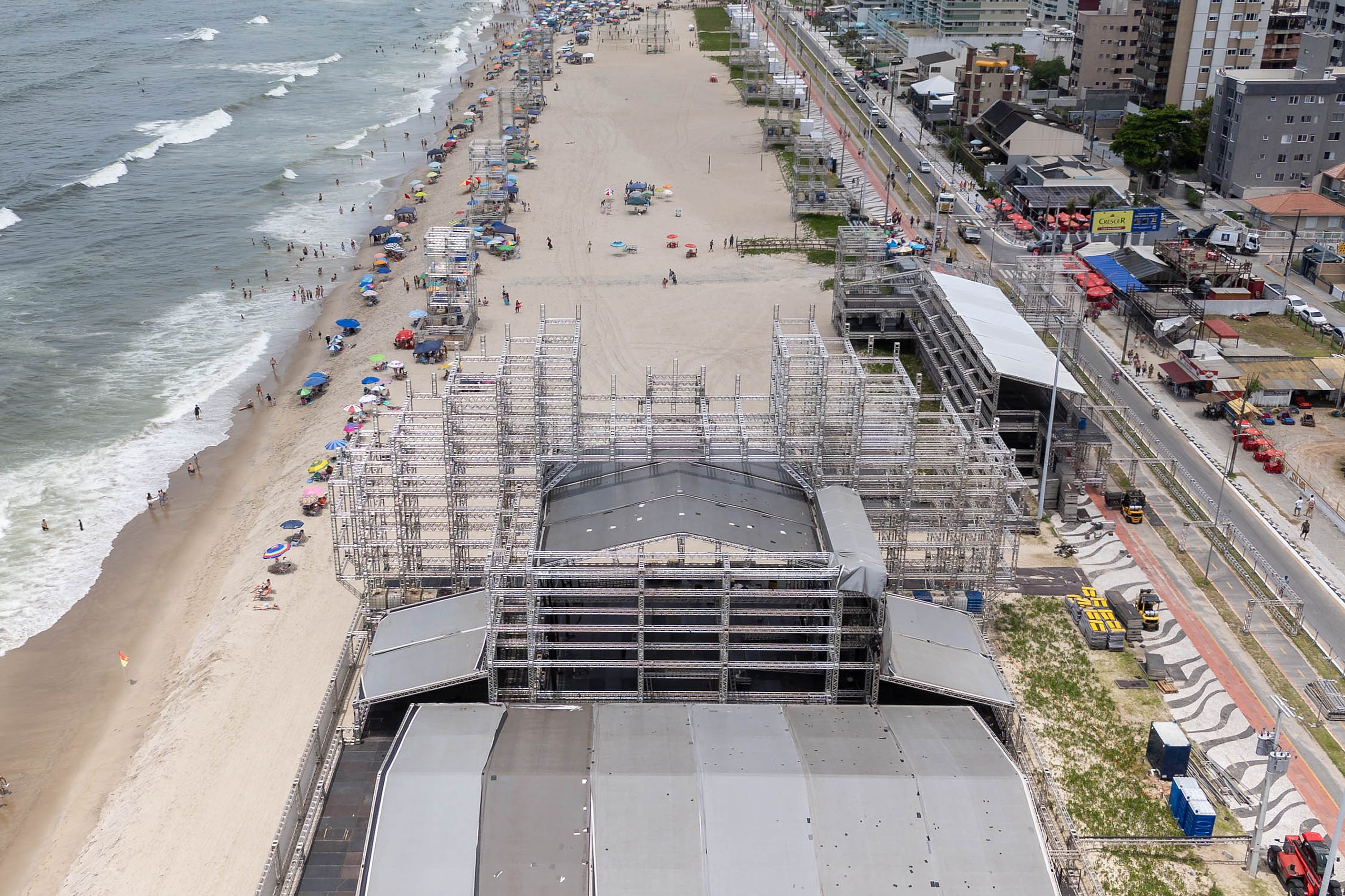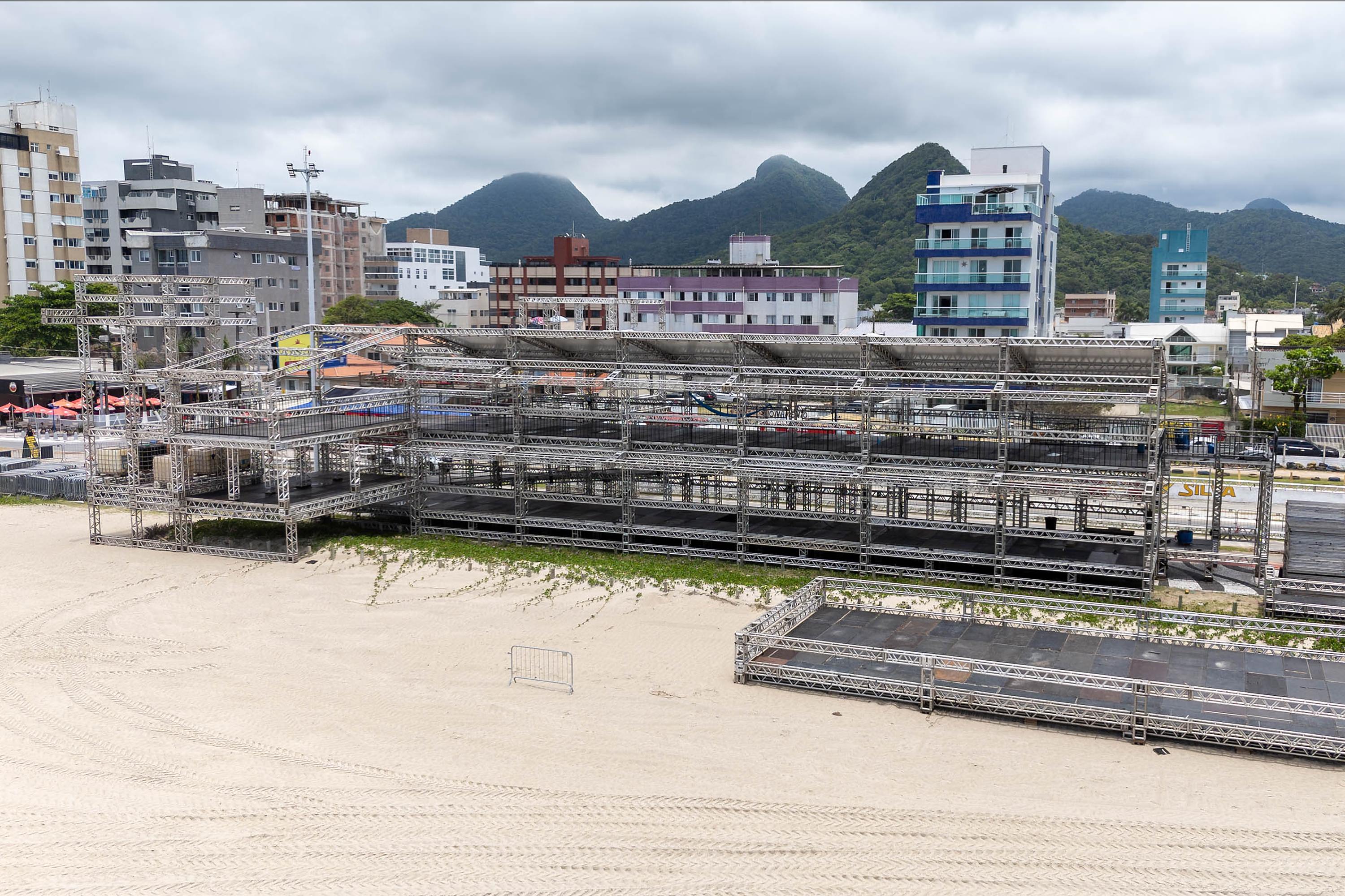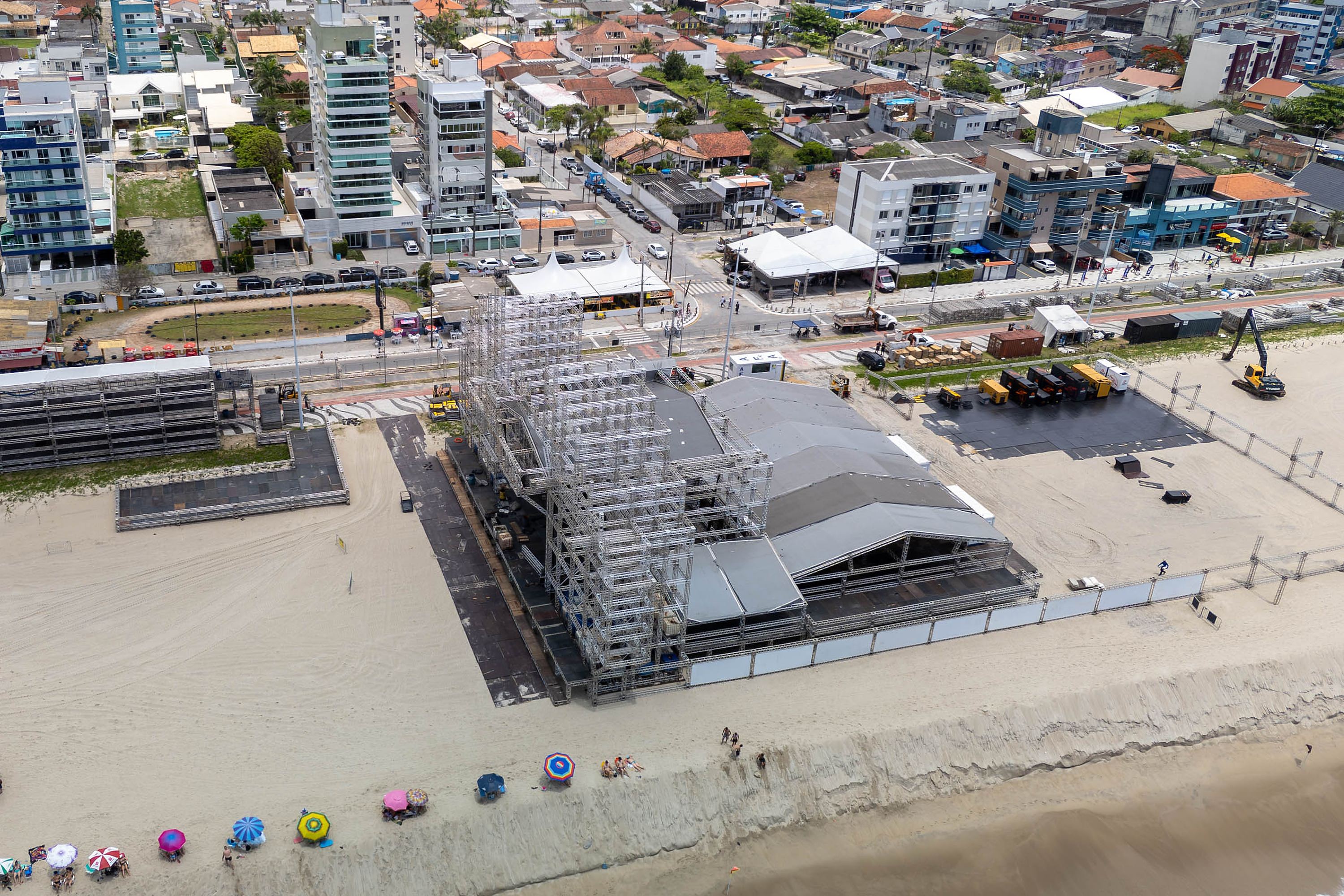 O palco nas areias de Matinhos começou a ser montado no dia 17 de dezembro. Ele terá 45 metros de largura, 21 metros de altura e 23 metros de profundidade, dimensões superiores às de 2025 — 39 metros de largura, 14 metros de altura e 16 metros de profundidade. Já é possível ver bem como ficará a área de camarotes.