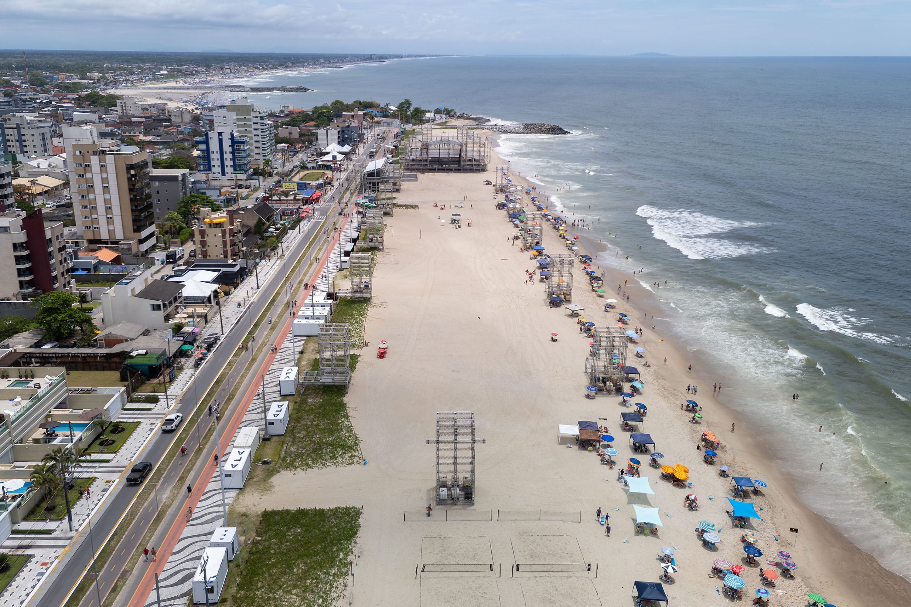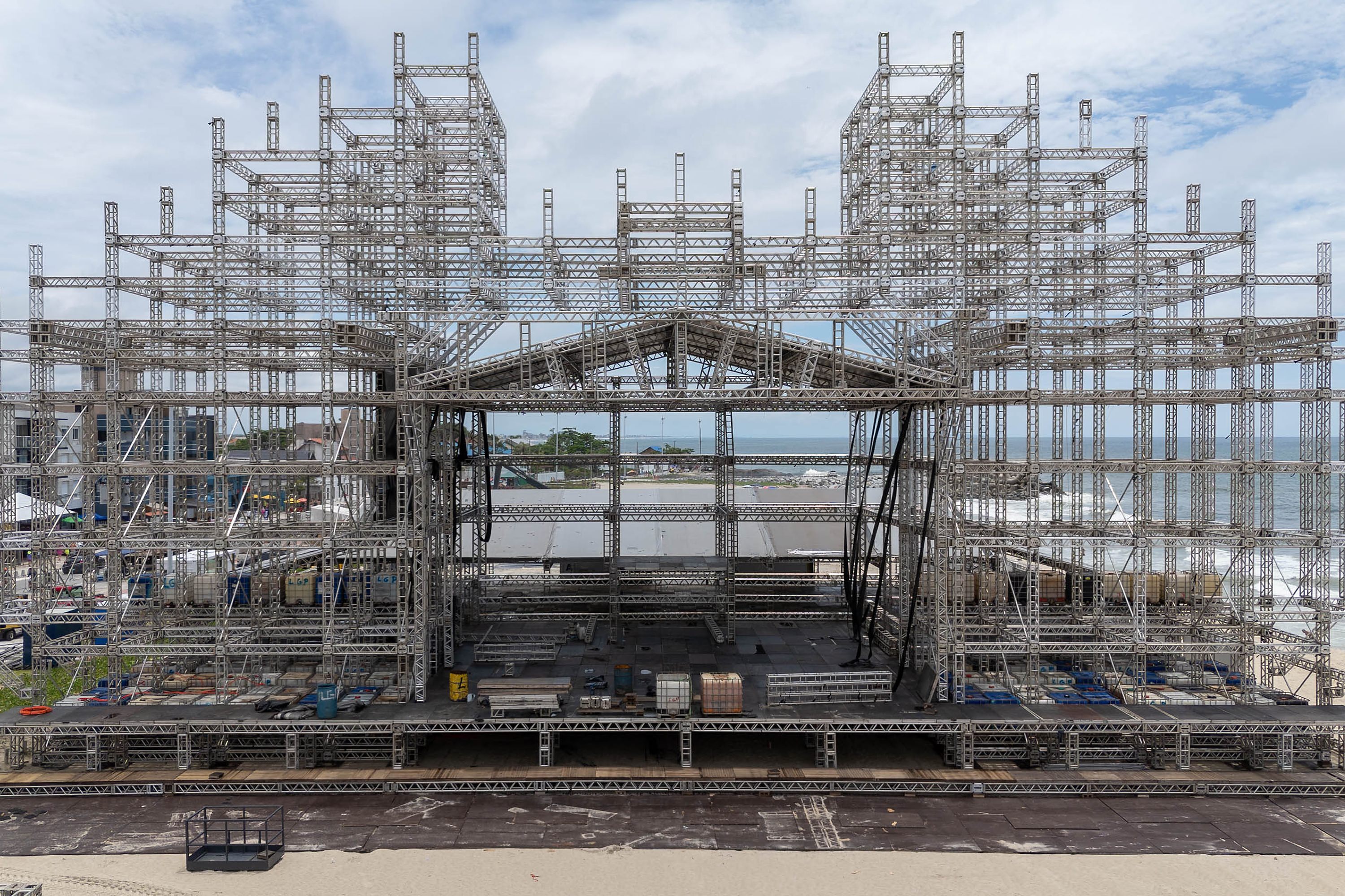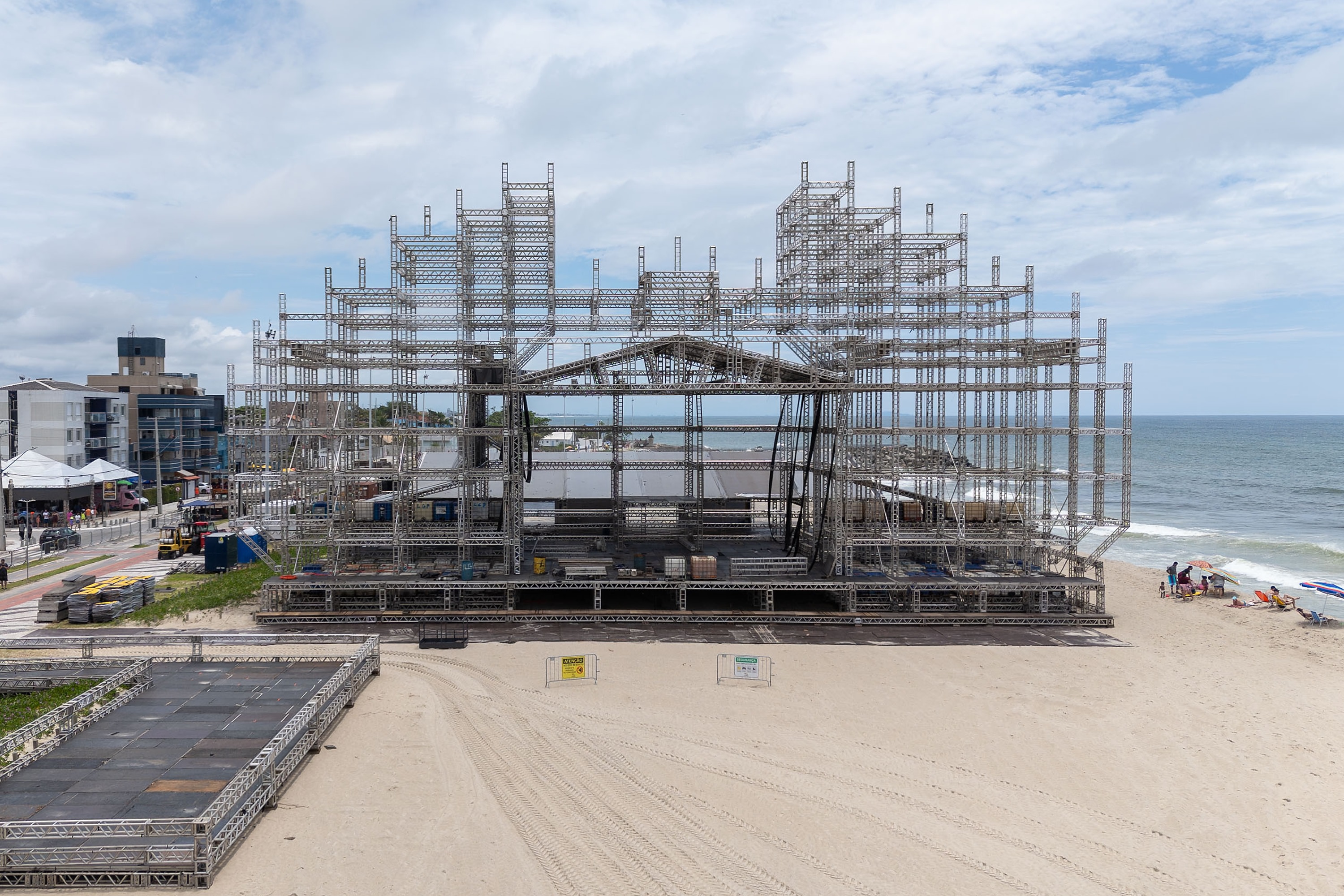 O palco nas areias de Matinhos começou a ser montado no dia 17 de dezembro. Ele terá 45 metros de largura, 21 metros de altura e 23 metros de profundidade, dimensões superiores às de 2025 — 39 metros de largura, 14 metros de altura e 16 metros de profundidade. Já é possível ver bem como ficará a área de camarotes.