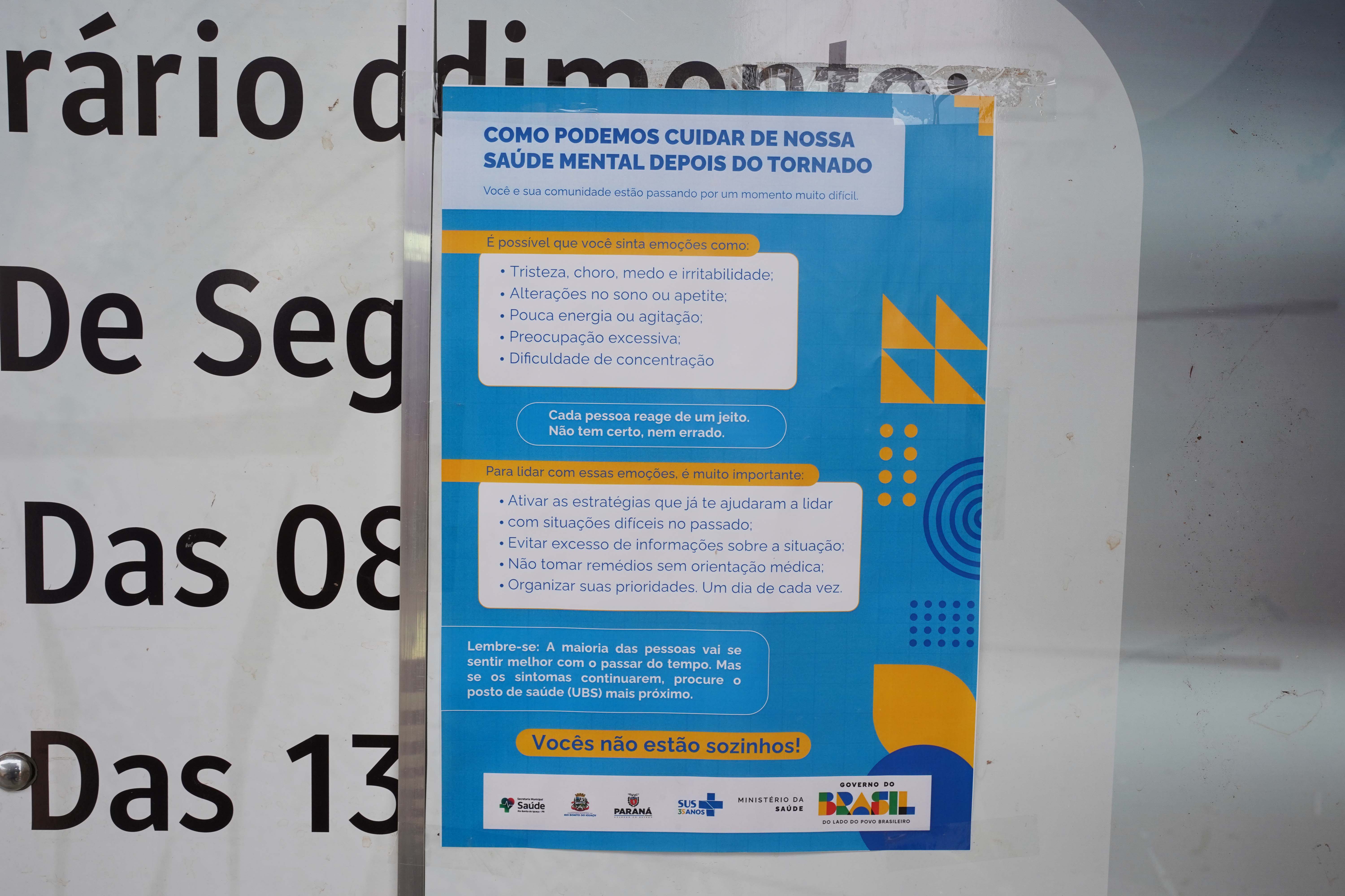 A saúde mental dos moradores também é foco da atenção das equipes que atuam em Rio Bonito do Iguaçu, município do Centro-Sul do Paraná que foi devastado por um tornado na última sexta-feira (7). Desde domingo (9), cerca de 300 moradores e famílias inteiras afetadas pelo evento climático receberam acolhida, orientações e atendimento psicossocial – individual ou coletivo – de profissionais da saúde.