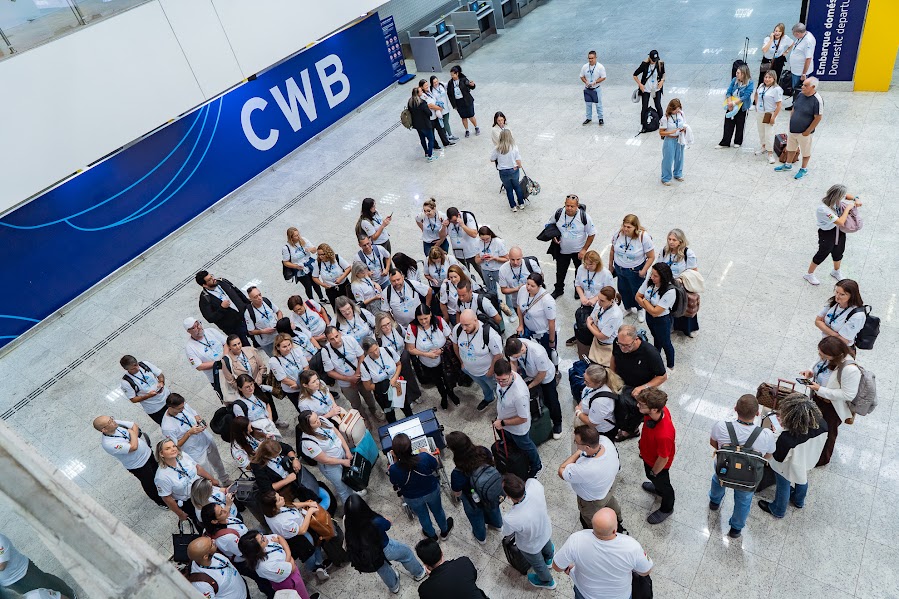 Após as edições dos alunos e dos professores, chegou a vez dos gestores. O saguão de embarque internacional do Aeroporto Afonso Pena, em Curitiba, foi ocupado por 100 diretores da rede estadual que seguiram nesta manhã de sábado (6) rumo a Santiago, capital chilena. A viagem marcou o início do programa Ganhando o Mundo Diretores - experiência internacional voltada à formação de diretores escolares, com atividades voltadas ao intercâmbio de práticas educacionais.