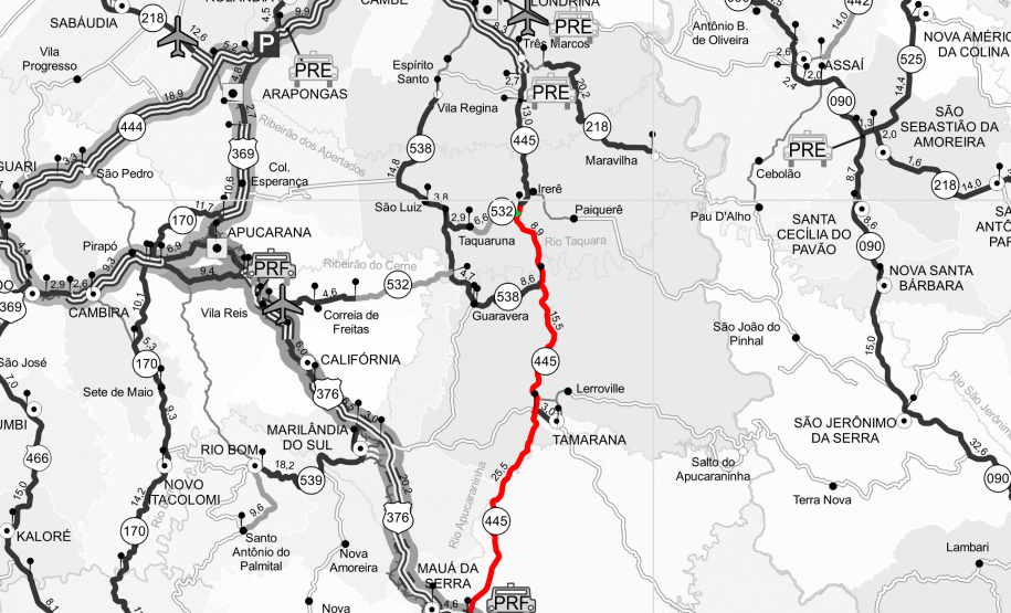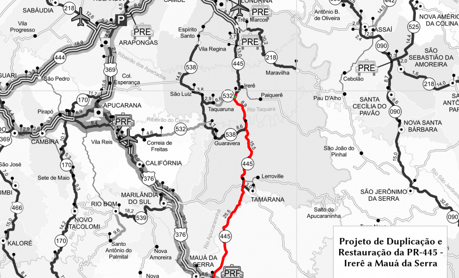 O Departamento de Estradas de Rodagem do Paraná (DER/PR) publicou nesta quarta-feira (30) o edital de licitação n.º 23/2019 para selecionar a empresa que vai elaborar o projeto de engenharia de restauração e duplicação da PR-445, entre Irerê e Mauá da Serrá, na região Norte do Paraná. A licitação foi anunciada pelo governador Carlos Massa Ratinho Júnior.