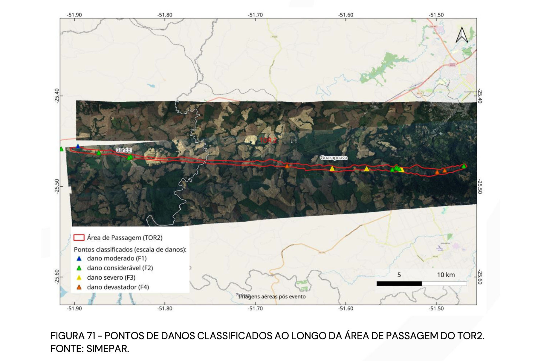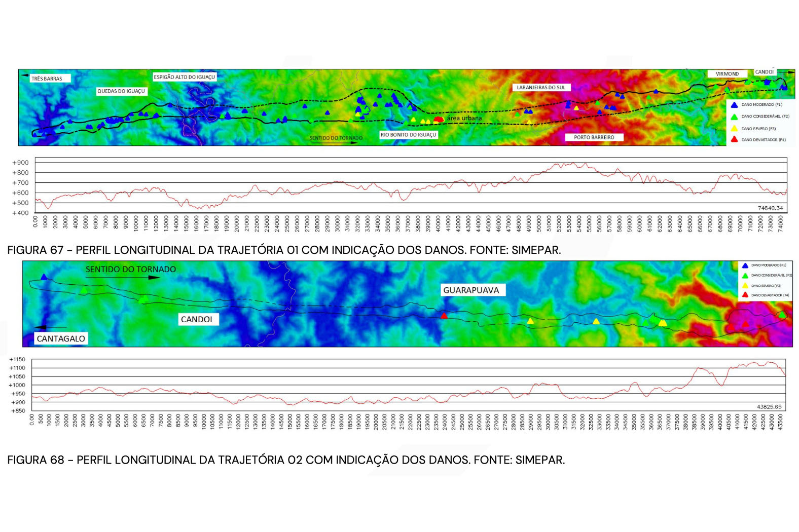 O Sistema de Tecnologia e Monitoramento Ambiental do Paraná (Simepar) concluiu nesta semana o laudo técnico que detalha a trajetória e a classificação dos três tornados que atingiram o Paraná em 7 de novembro. O trabalho descrito no documento, que tem mais de 130 páginas, elevou para F4 a categoria na escala Fujita dos tornados que atingiram Rio Bonito do Iguaçu e Guarapuava, e manteve em F2 a categoria do tornado que atingiu Turvo. Onze municípios foram atingidos: Rio Bonito do Iguaçu, Turvo, Guarapuava, Quedas do Iguaçu, Espigão Alto do Iguaçu, Nova Laranjeiras, Porto Barreiro, Laranjeiras do Sul, Virmond, Cantagalo e Candói.