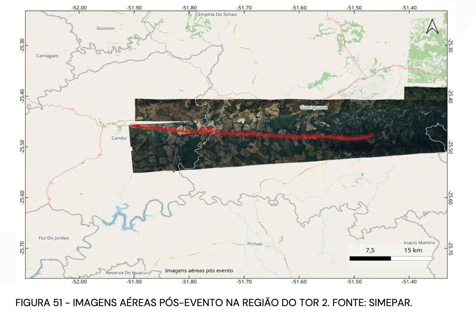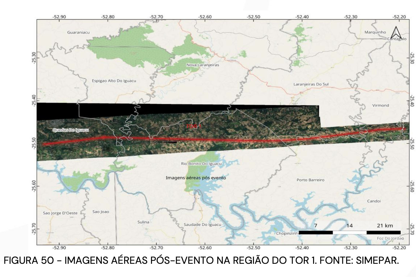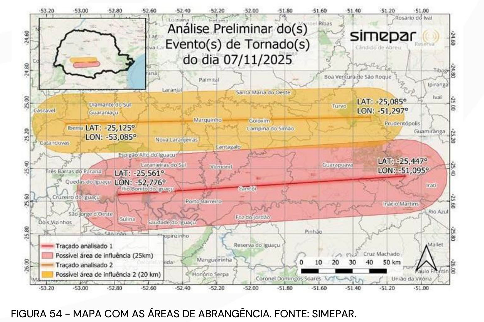 TRAJETÓRIAS – O Tornado 1 percorreu aproximadamente 75 km, com uma área de impacto estimada em 12.426 hectares. Sua largura variou de 750 metros em Quedas do Iguaçu para 3.250 metros na região de maior intensidade, em Rio Bonito do Iguaçu. Em média, a largura foi de 1.850 metros, refletindo o poder destrutivo do tornado, especialmente nas áreas mais afetadas.