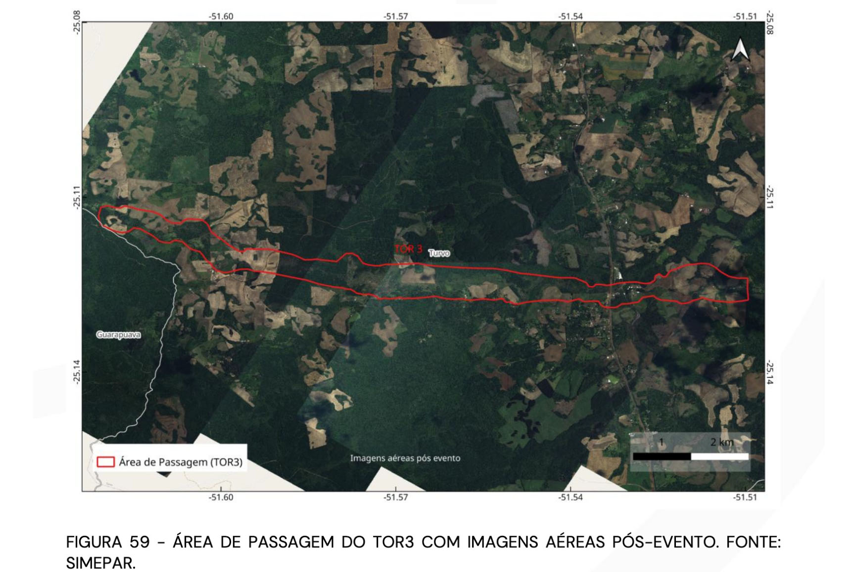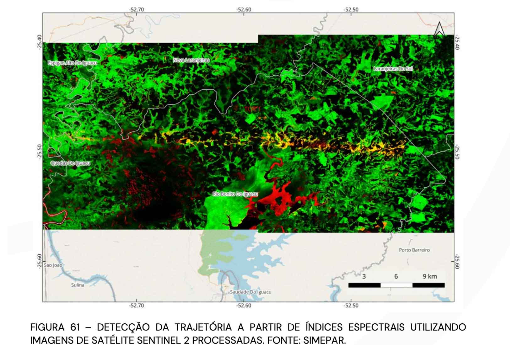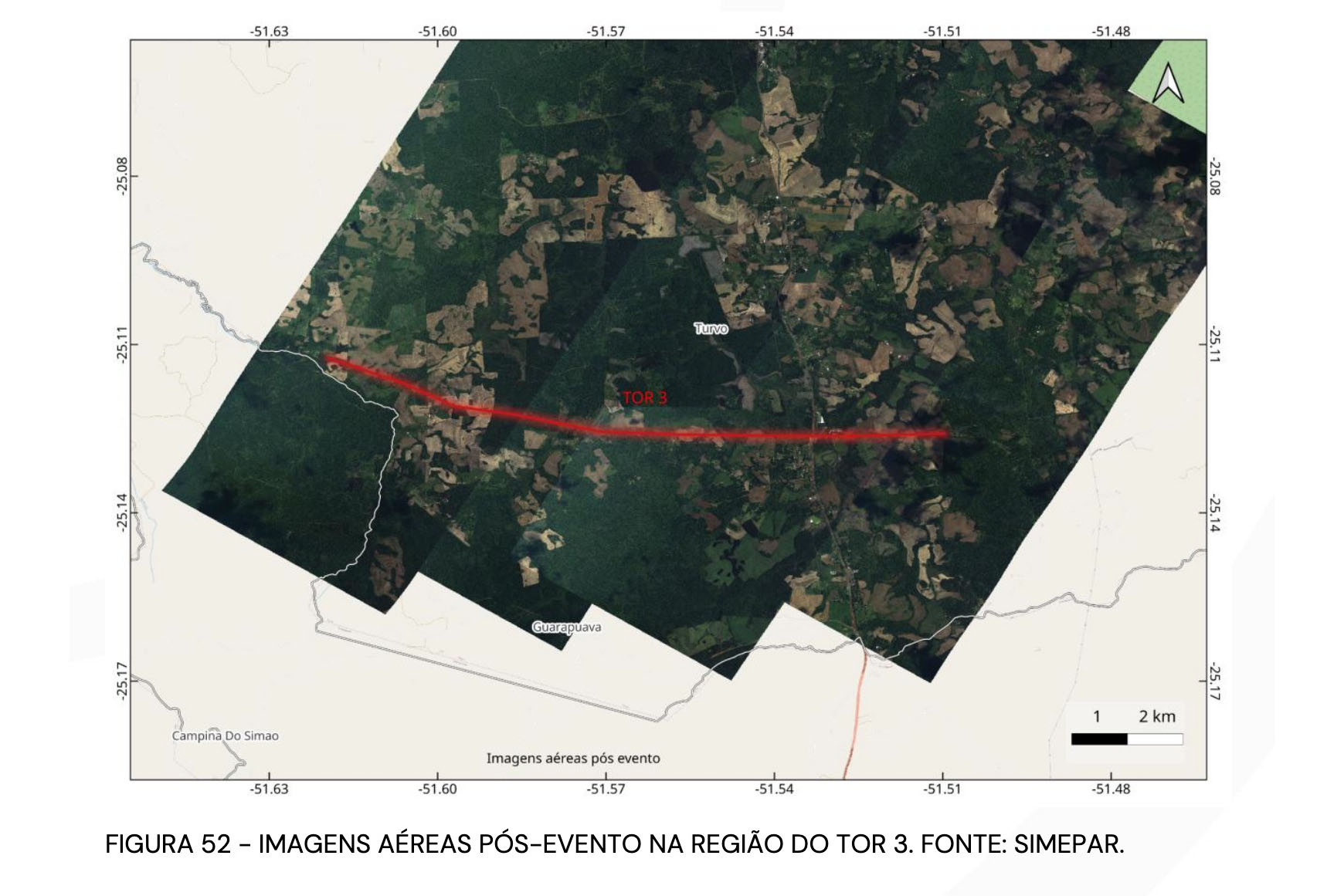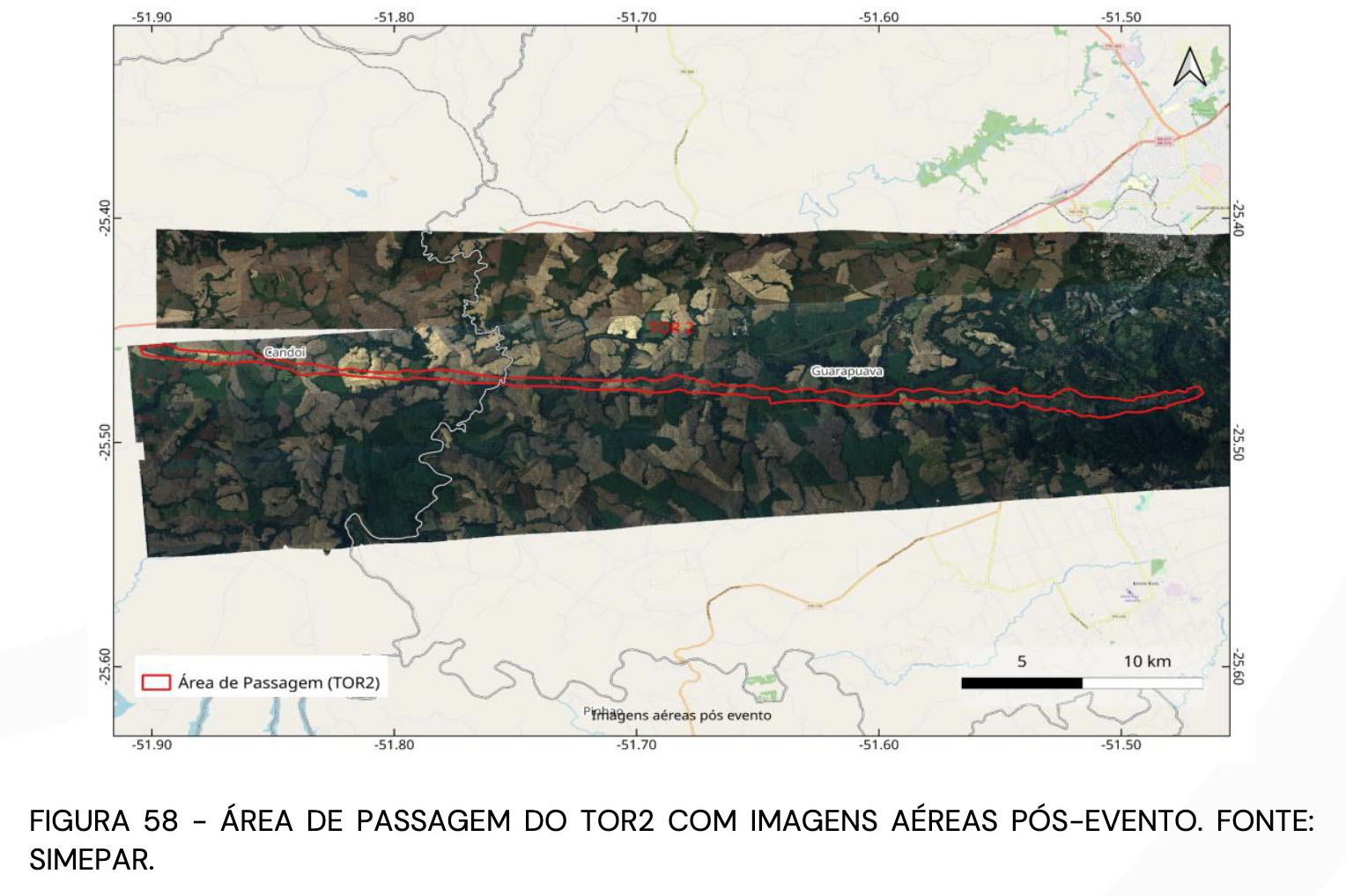 TRAJETÓRIAS – O Tornado 1 percorreu aproximadamente 75 km, com uma área de impacto estimada em 12.426 hectares. Sua largura variou de 750 metros em Quedas do Iguaçu para 3.250 metros na região de maior intensidade, em Rio Bonito do Iguaçu. Em média, a largura foi de 1.850 metros, refletindo o poder destrutivo do tornado, especialmente nas áreas mais afetadas.