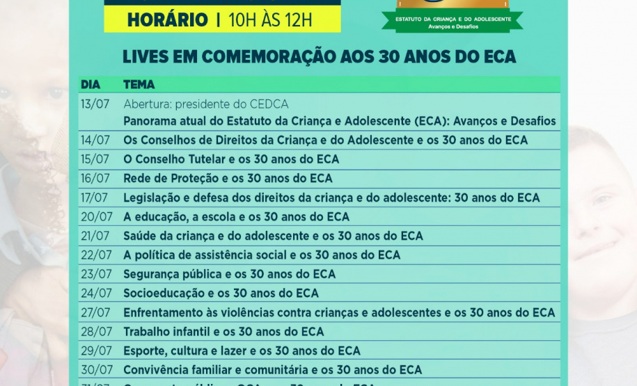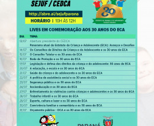 Em comemoração aos 30 anos do Estatuto da Criança e do Adolescente (ECA), a Secretaria da Justiça, Família e Trabalho, através do Conselho Estadual dos Direitos da Criança e do Adolescente (CEDCA), realiza, de 13 a 31 de julho, 15 lives sobre políticas públicas e os principais direitos garantidos pelo estatuto. As transmissões ao vivo vão acontecer de segunda a sexta-feira, das 10 às 12h no canal do Youtube da Sejuf (http://abre.ai/sejufparana).