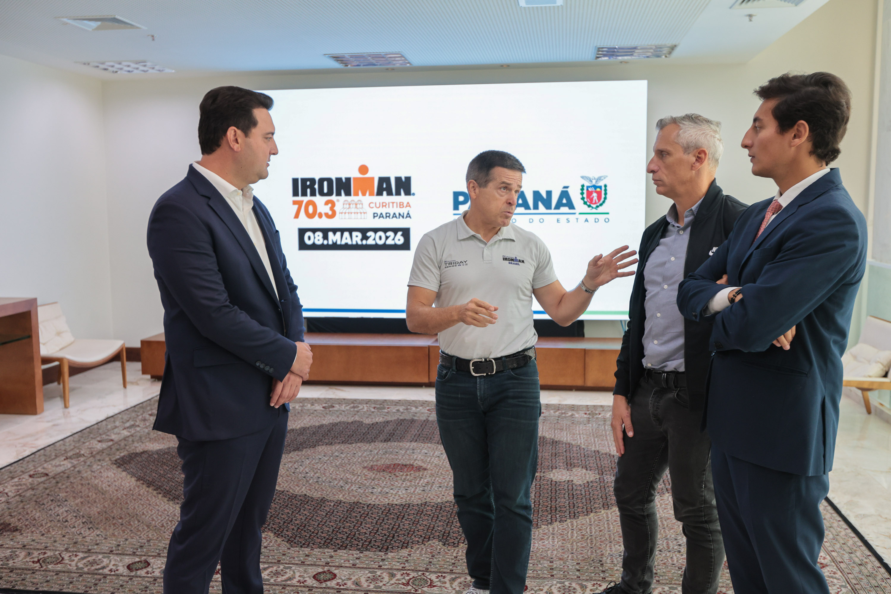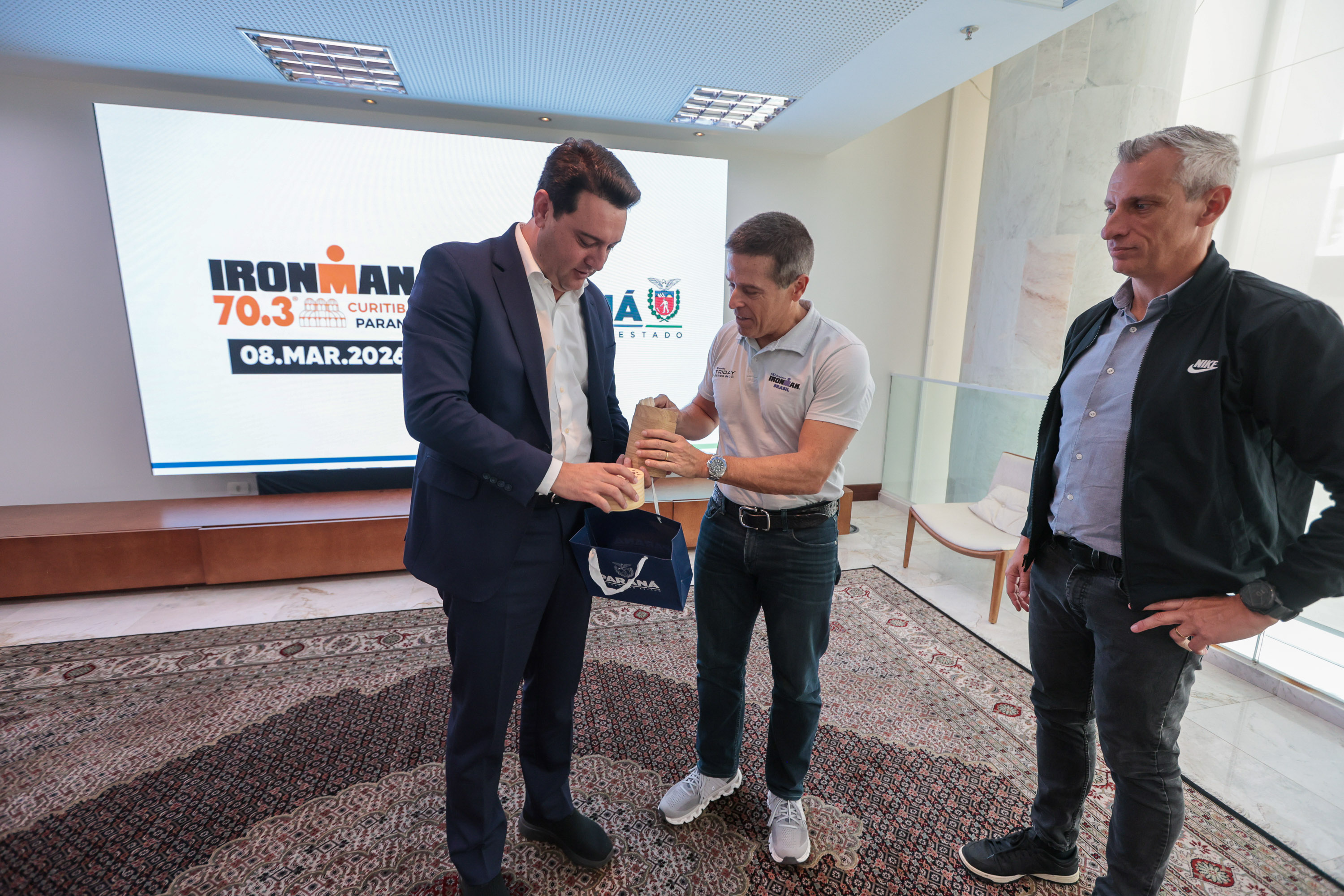 Organizadores do IRONMAN BRASIL 2026, maior circuito de triatlo da América Latina, estiveram nesta segunda-feira (2) no Palácio Iguaçu para agradecer o apoio do Governo do Estado e convidar o governador Carlos Massa Ratinho Junior para presenciar a volta da disputa ao Paraná. A etapa “70.3 Curitiba”, no próximo domingo (8), abre o calendário nacional da competição, composto por sete eventos. A prova de resistência esteve pela última vez em território paranaense em 2016, em Foz do Iguaçu.