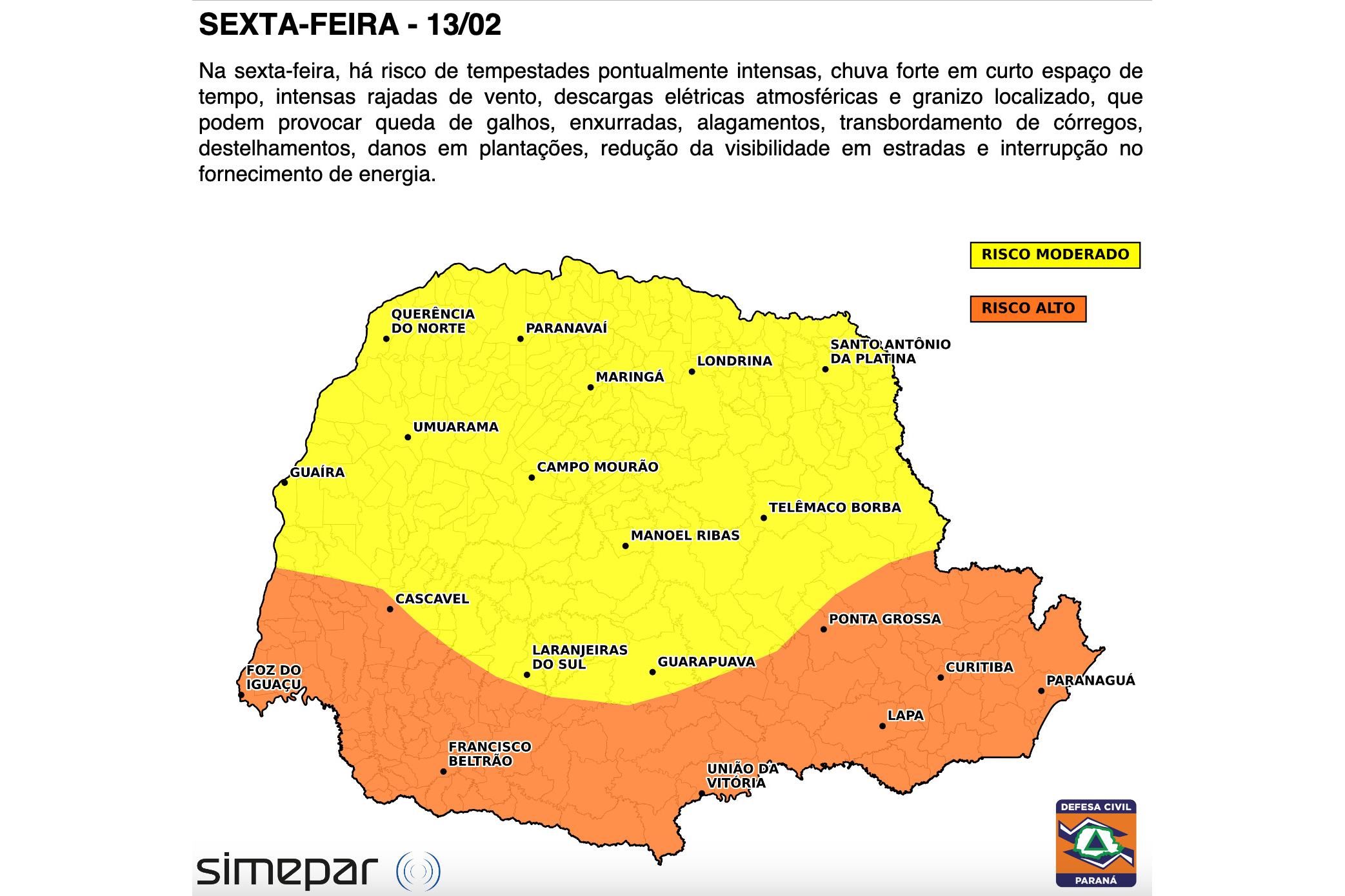 Já na sexta-feira (13), o risco é alto no Leste, Sul e Sudoeste do Paraná, e moderado em todo o resto do estado, para tempestades pontualmente intensas, chuva forte em curto espaço de