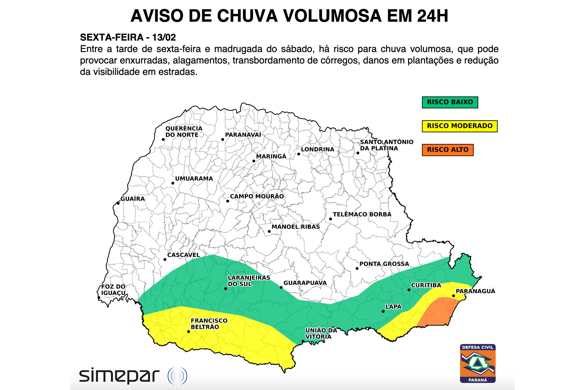 O Boletim de Gestão de Riscos, elaborado pela equipe do Simepar em parceria com a Coordenadoria Estadual de Defesa Civil, aponta nesta quinta-feira (12) risco baixo no Sudoeste, Oeste e Norte do Paraná para tempestades pontualmente intensas, chuva forte em curto espaço de tempo, rajadas de vento, descargas elétricas atmosféricas e granizo localizado, que podem provocar queda de galhos, alagamentos, destelhamentos, danos em plantações, e redução da visibilidade em estradas. No resto do estado, o risco é moderado.