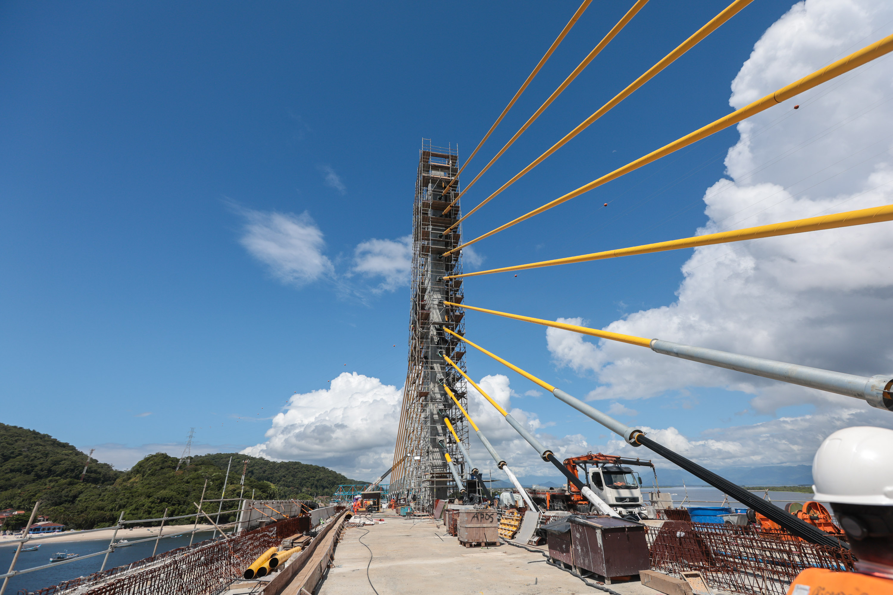 A instalação dos estais, cabos de aço responsáveis por sustentar o vão central da ponte, também evoluiu. Já são 11 pares fixados em cada um dos mastros dos apoios 4 e 5, garantindo a estabilidade necessária para a continuidade dos trabalhos na parte superior da estrutura.