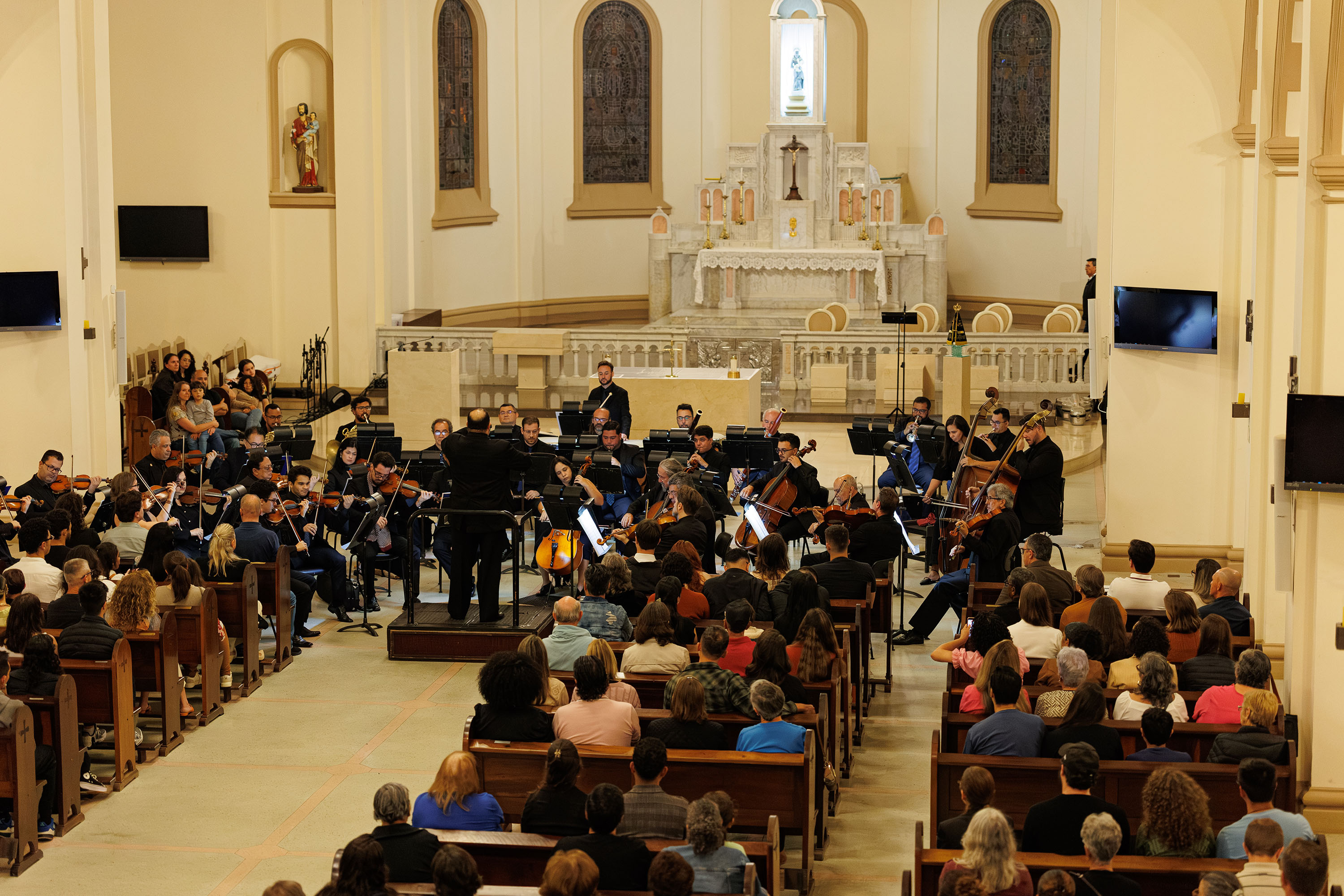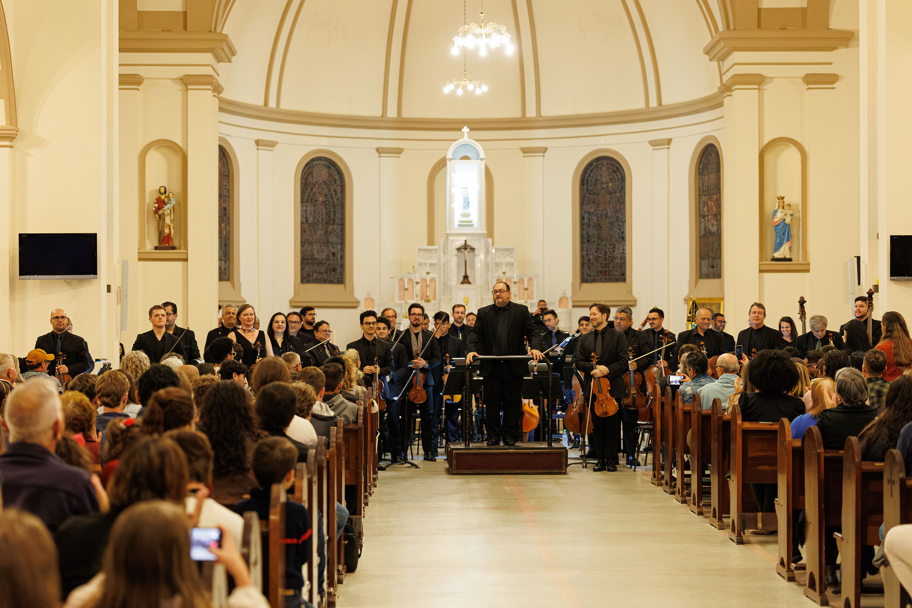 “Tocar em uma igreja é muito diferente, faz um eco muito grande. Quando a gente acaba de tocar, ainda sente o som andando pelo ar”, contou. O maestro destacou a rapidez com que os músicos absorveram essas particularidades sonoras. “Foi incrível, porque eles se adaptaram muito rápido. Na primeira música, é questão de dois, três compassos, a orquestra já está dentro do ar da acústica.”