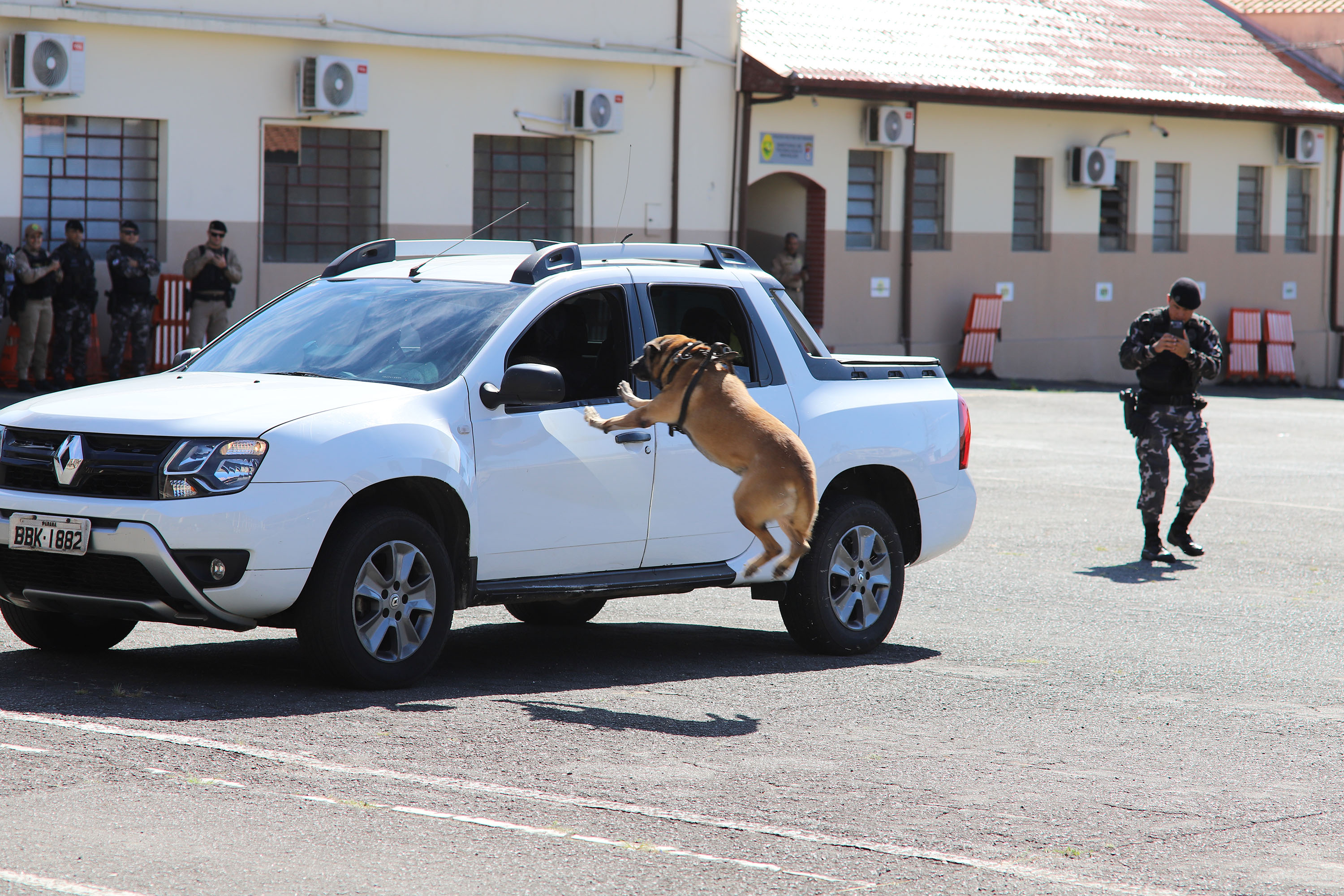 Ainda foram apresentados exercícios de faro, em que os cães identificam drogas ocultas em bagagens, veículos e compartimentos diversos, mesmo em concentrações mínimas.