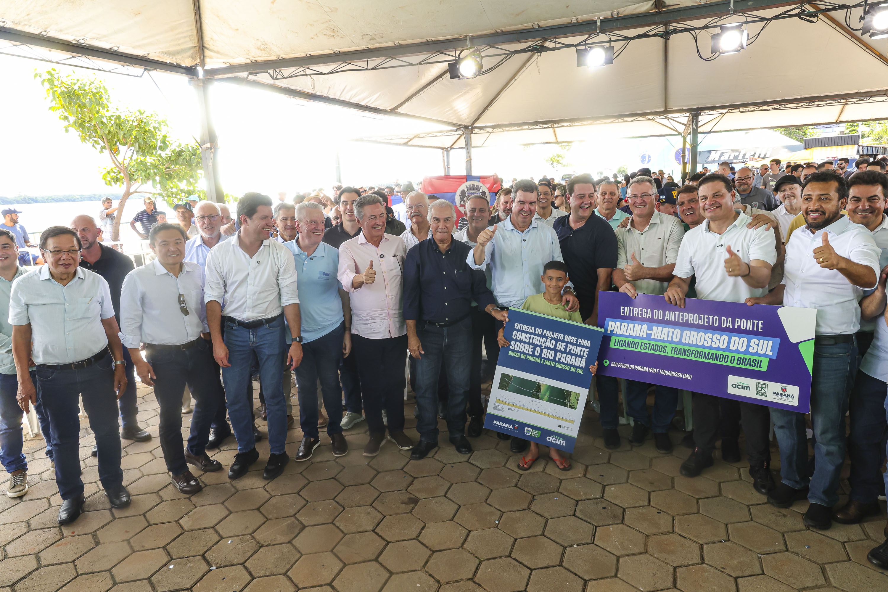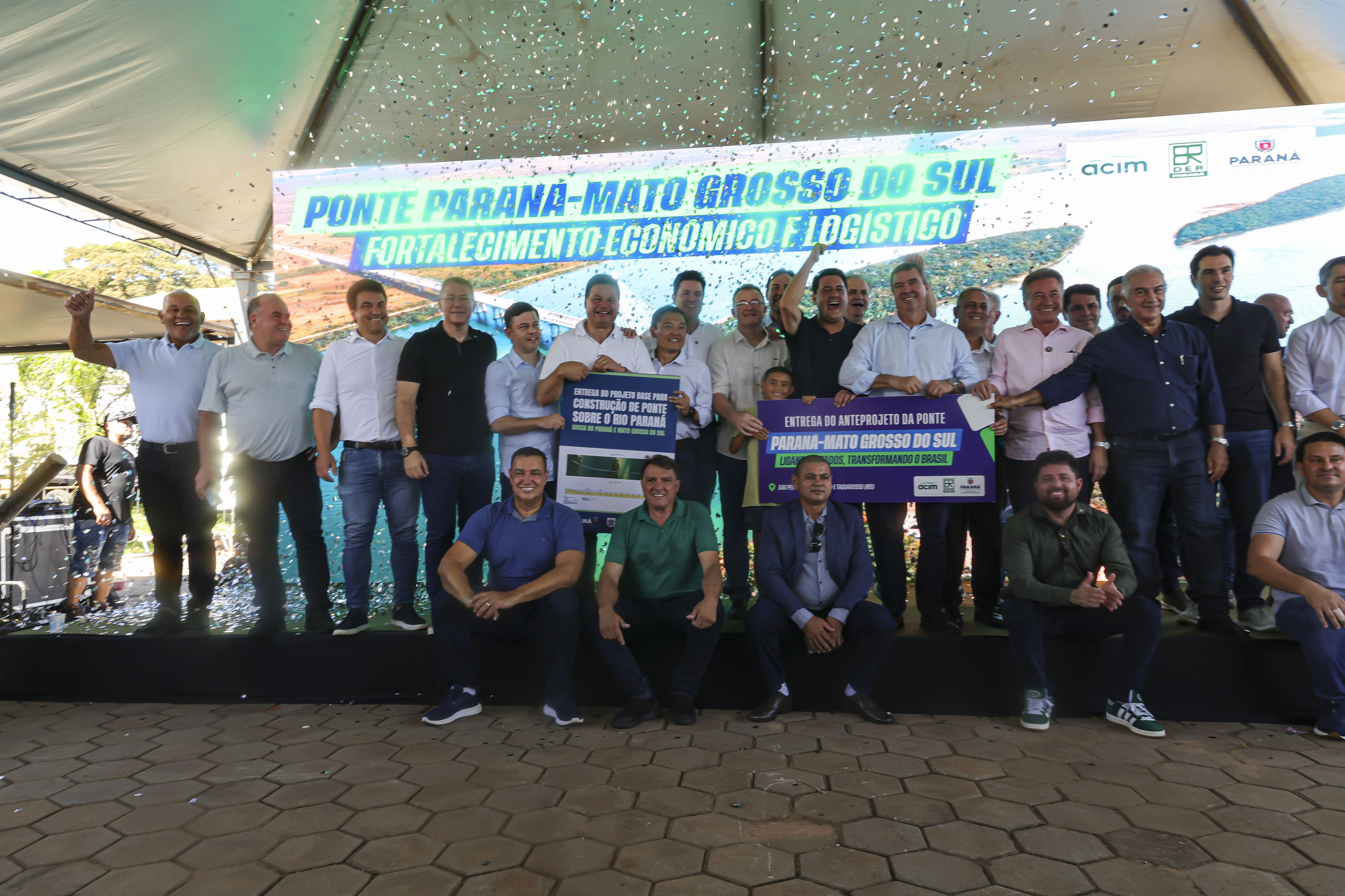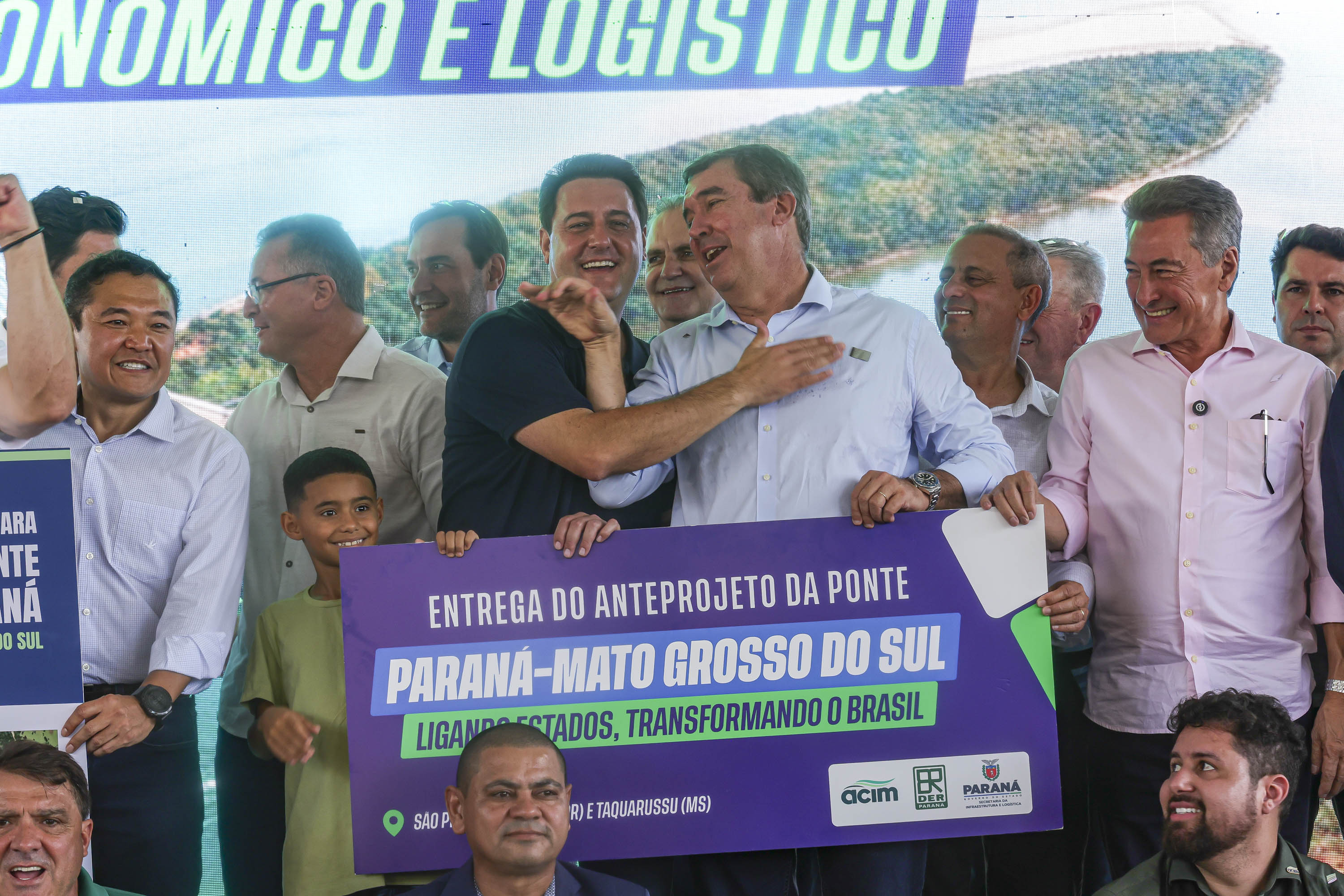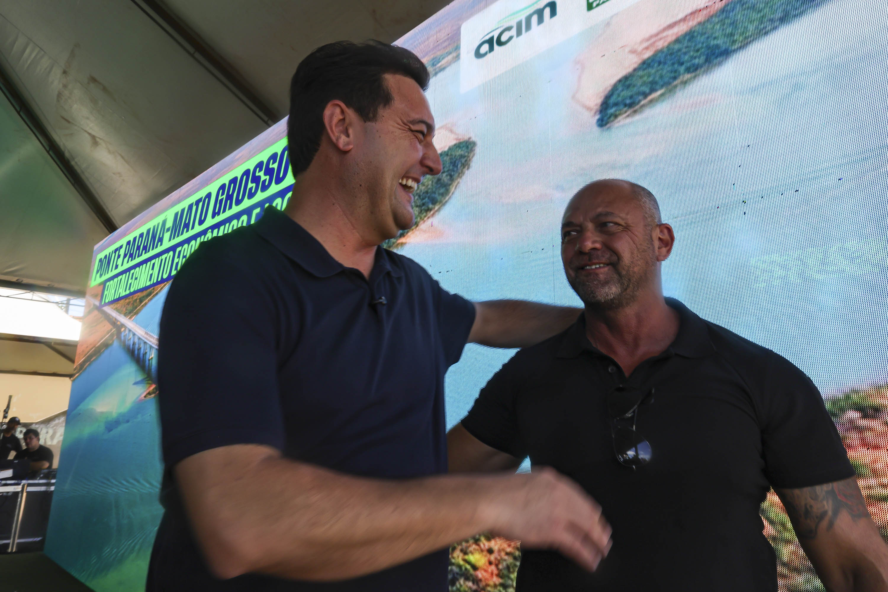 Os governadores Carlos Massa Ratinho Junior, do Paraná, e Eduardo Riedel, do Mato Grosso do Sul, receberam neste sábado (21), em São Pedro do Paraná, o anteprojeto da ligação entre Porto São José, no distrito de São Pedro do Paraná, e Taquarussu, no estado vizinho. O documento foi apresentado ao poder público pela Associação Comercial e Empresarial de Maringá (ACIM).