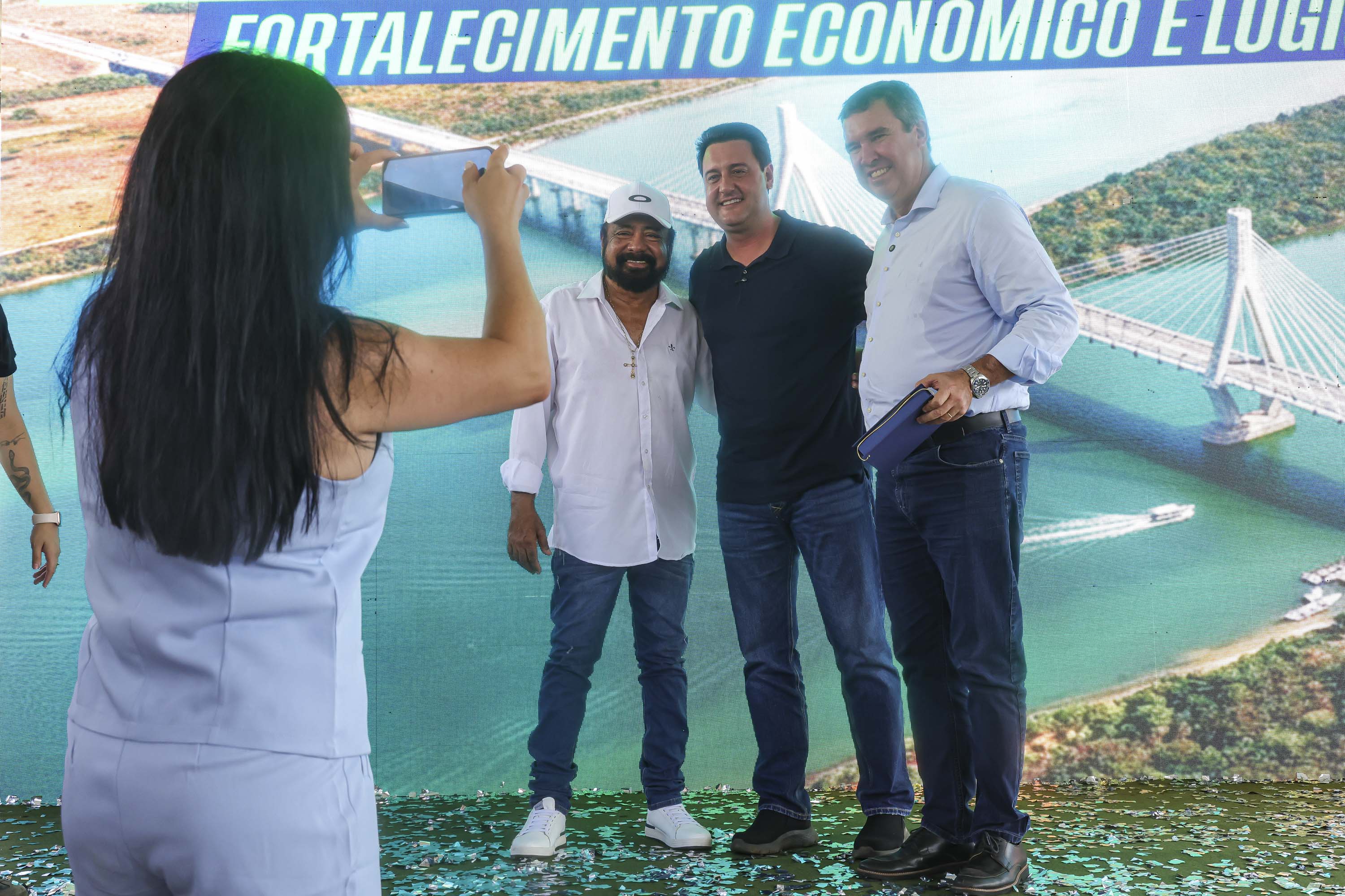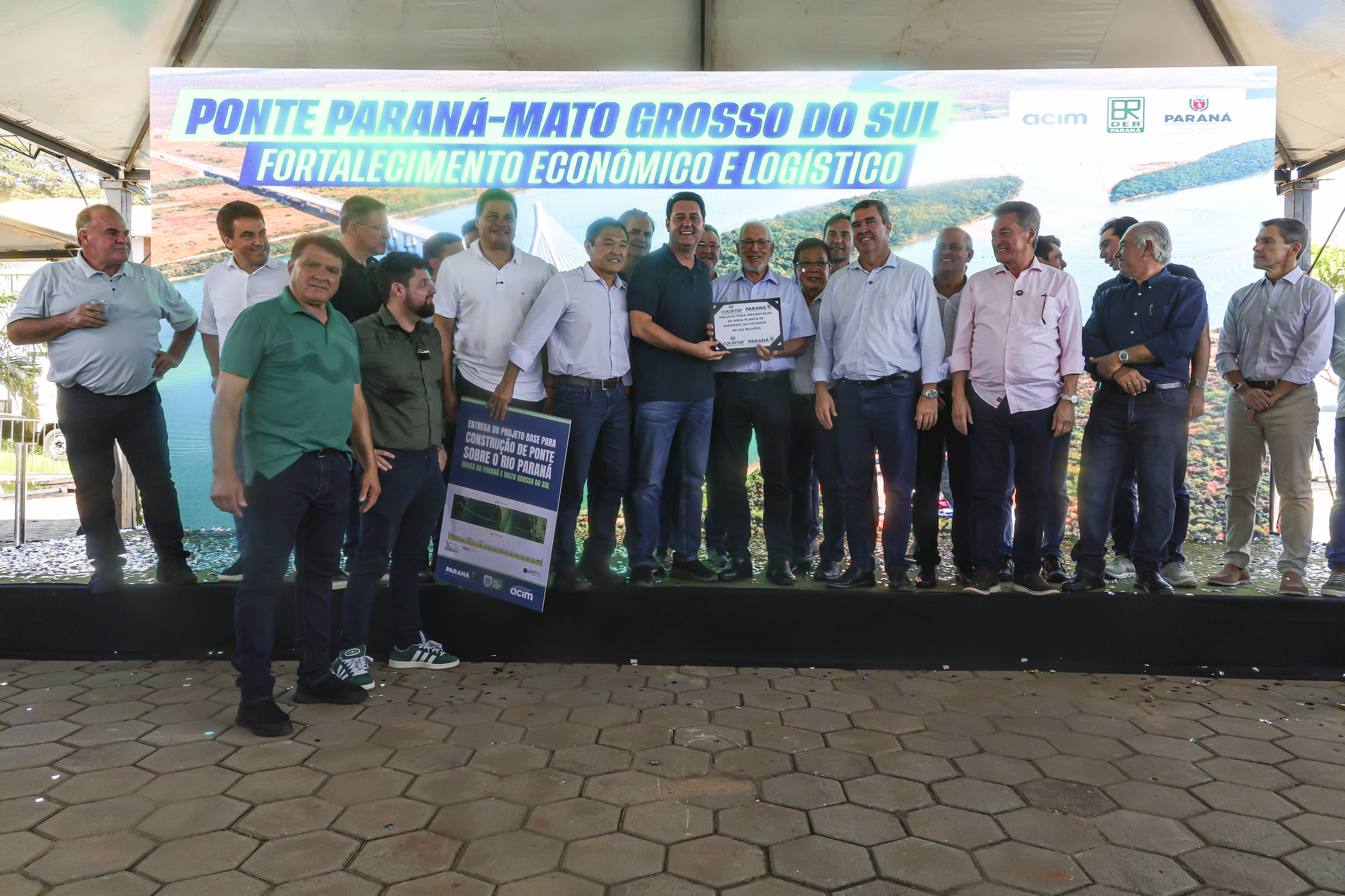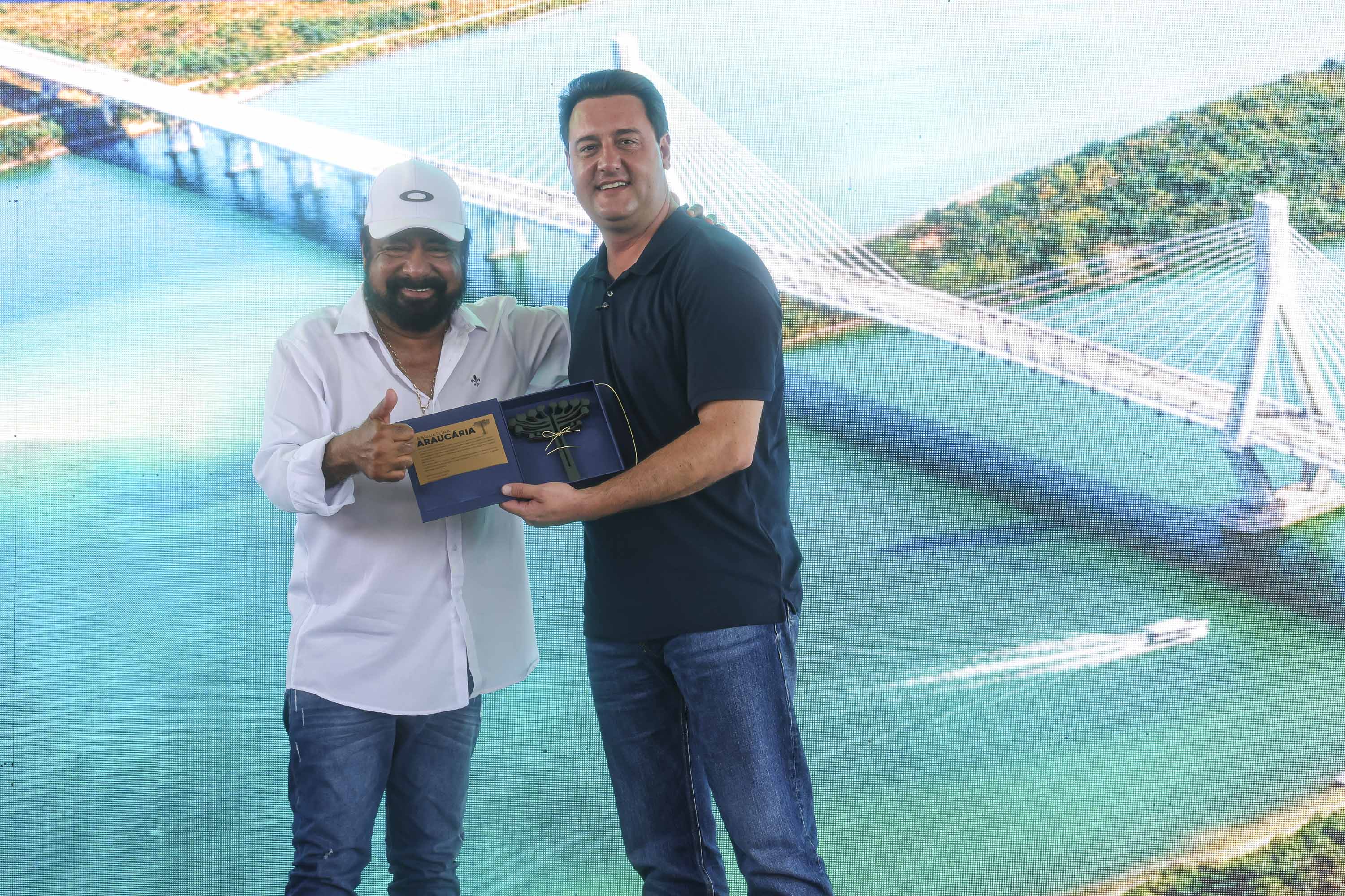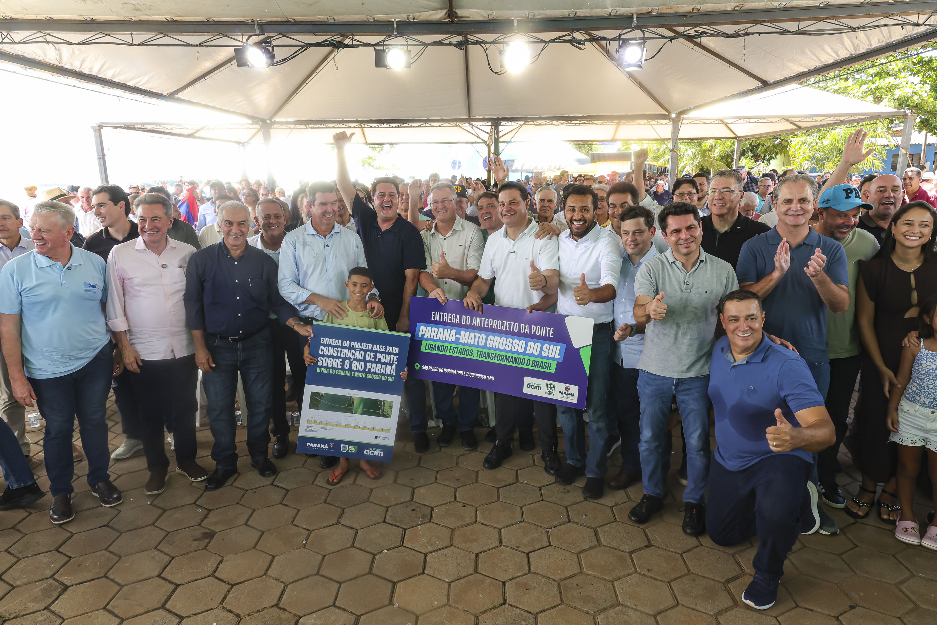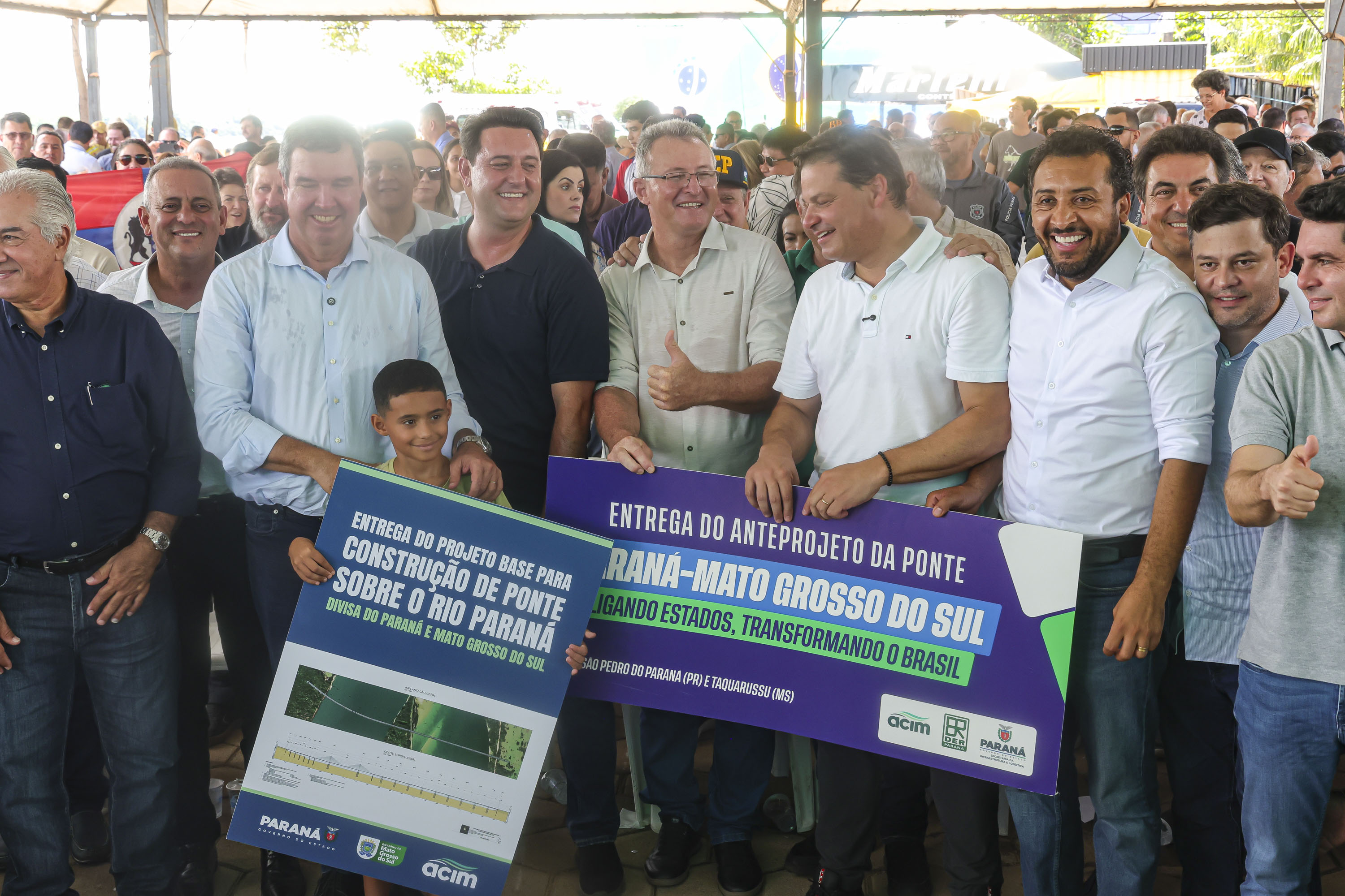 Os governadores Carlos Massa Ratinho Junior, do Paraná, e Eduardo Riedel, do Mato Grosso do Sul, receberam neste sábado (21), em São Pedro do Paraná, o anteprojeto da ligação entre Porto São José, no distrito de São Pedro do Paraná, e Taquarussu, no estado vizinho. O documento foi apresentado ao poder público pela Associação Comercial e Empresarial de Maringá (ACIM).