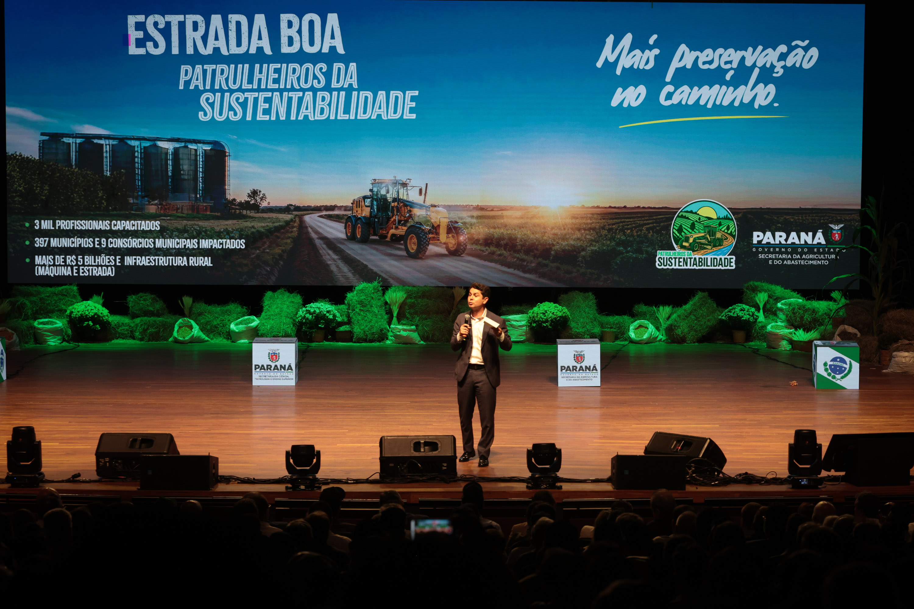 O Governo do Paraná lançou nesta segunda-feira (1º), no Teatro Guaíra, em Curitiba, o programa Patrulheiros da Sustentabilidade, uma nova estratégia para modernizar a infraestrutura rural do Estado e fortalecer a relação entre produção agrícola e preservação ambiental. A iniciativa foi apresentada pelo governador Carlos Massa Ratinho Junior e representa mais um passo na construção de um modelo de desenvolvimento pelo qual a agricultura paranaense cresce de forma sustentável, inovadora e conectada à proteção dos recursos naturais.