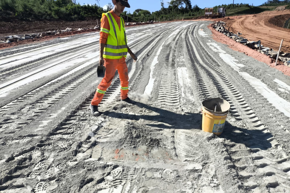 O solo-cimento é uma mistura de cimento com o solo local, resultando em um material com aparência de terra, mas com consistência firme e compacta, sustentando a pista acima. Nesse trecho está previsto o pavimento semirrígido, com duas camadas de solo-cimento ligadas por uma camada de ligante betuminoso, e uma camada de concreto asfáltico usinado a quente (CAUQ).