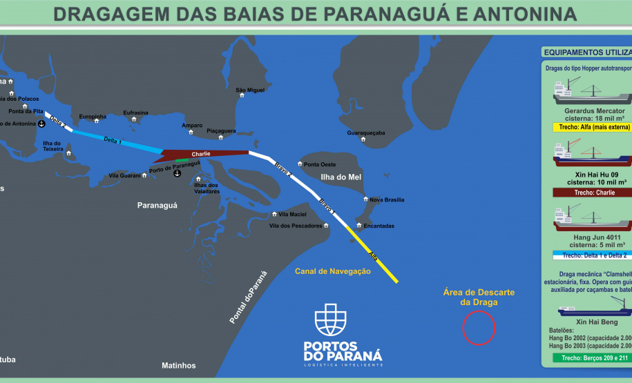 Nas áreas Charlie e Delta, o prazo de conclusão é nos próximos dias. Depois de finalizadas, as dragas hopper chinesas se juntam com a embarcação holandesa para atuar em conjunto nas áreas Bravo e Surdinho (mais internas no canal de acesso ao Porto de Paranaguá).