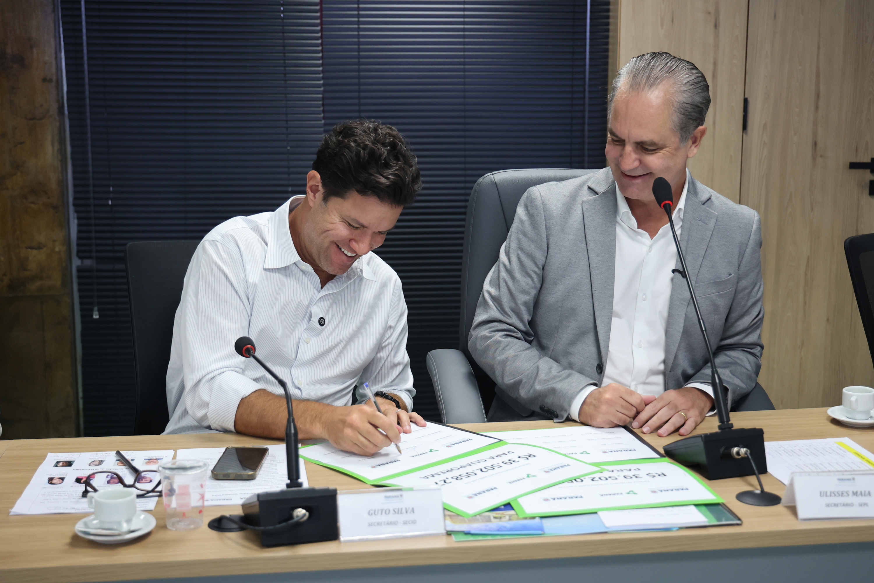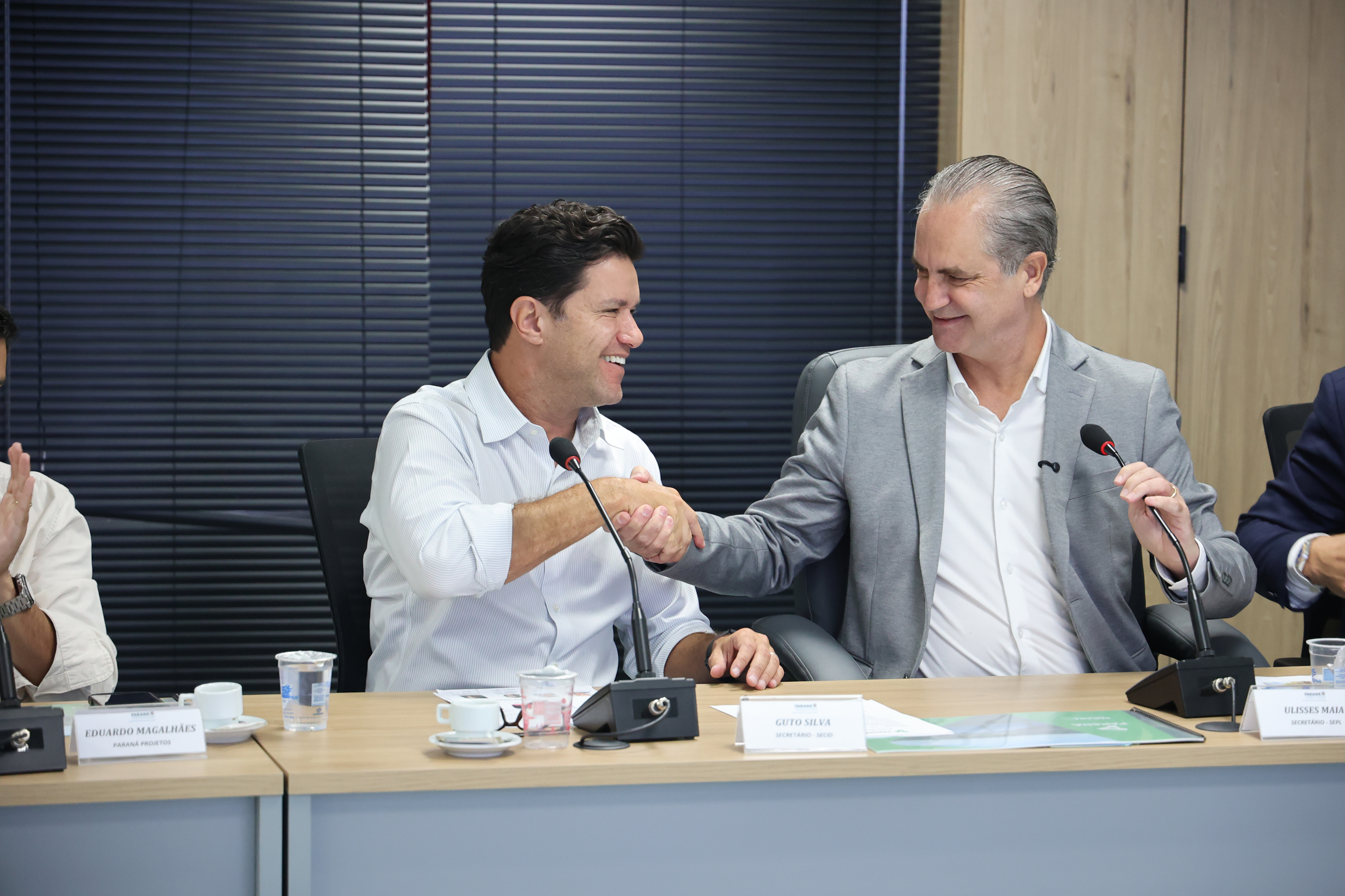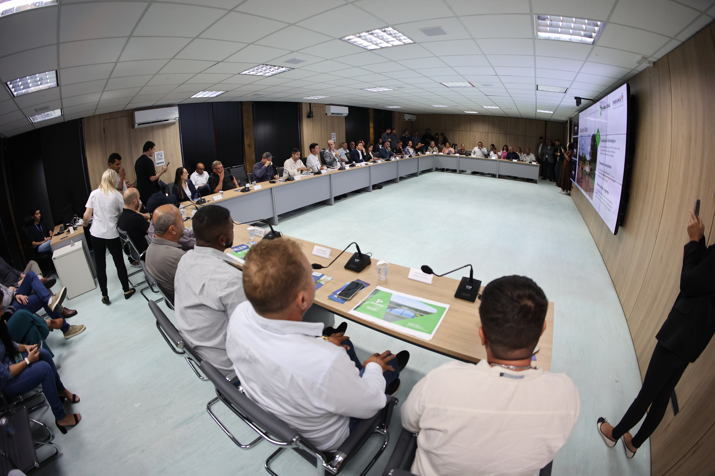 PRESENÇAS – Também estiveram presentes na reunião o superintendente do Paraná Projetos, Eduardo Magalhães; o diretor de Planejamento e Projetos do Paraná Projetos, Célio Watter; a deputada estadual Maria Victória, os prefeitos das duas cidades, Beto Castiglioni e Fabiano Travain, os vice-prefeitos Braulio e Ivan Beraldo, e todos os vereadores das duas câmaras municipais.