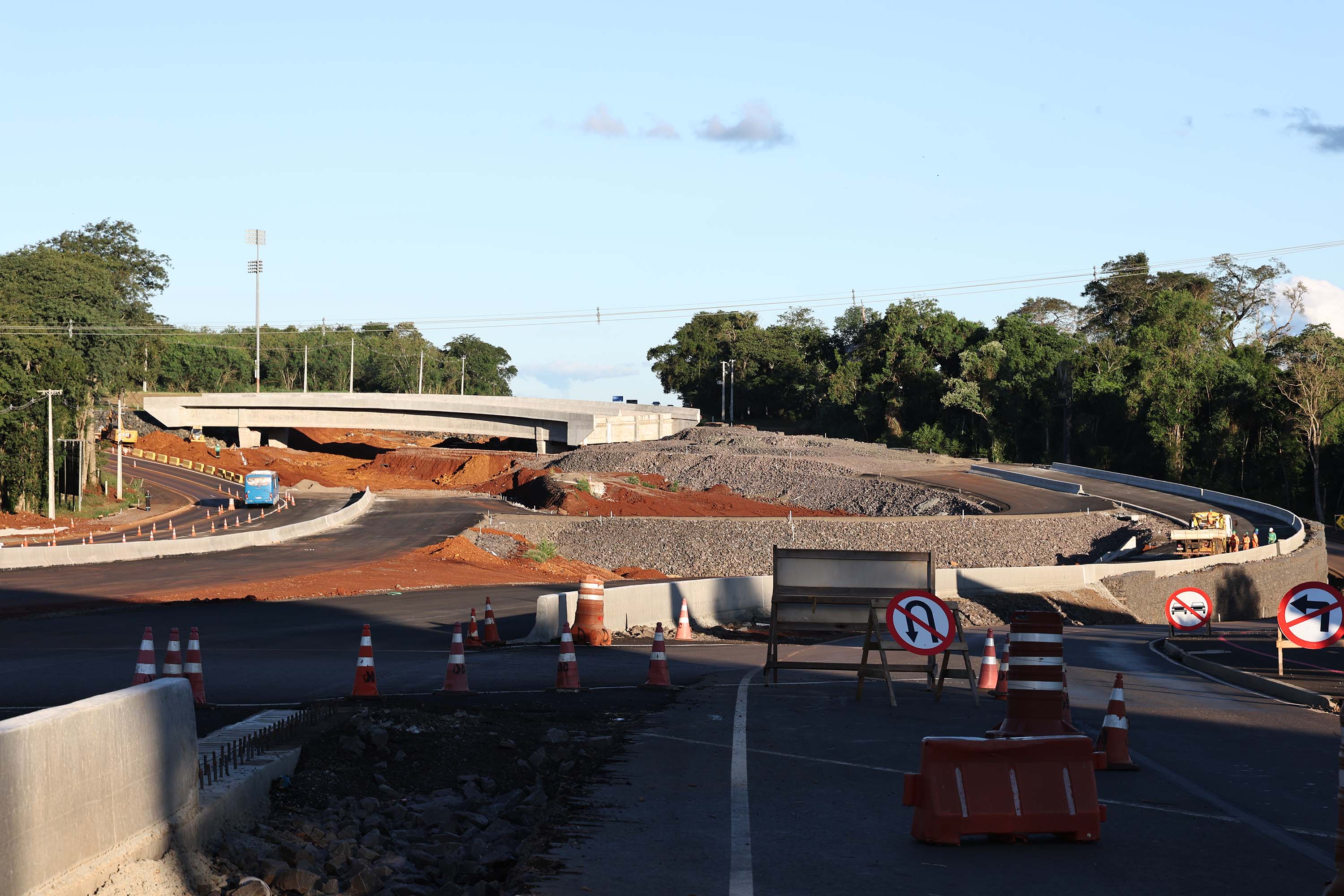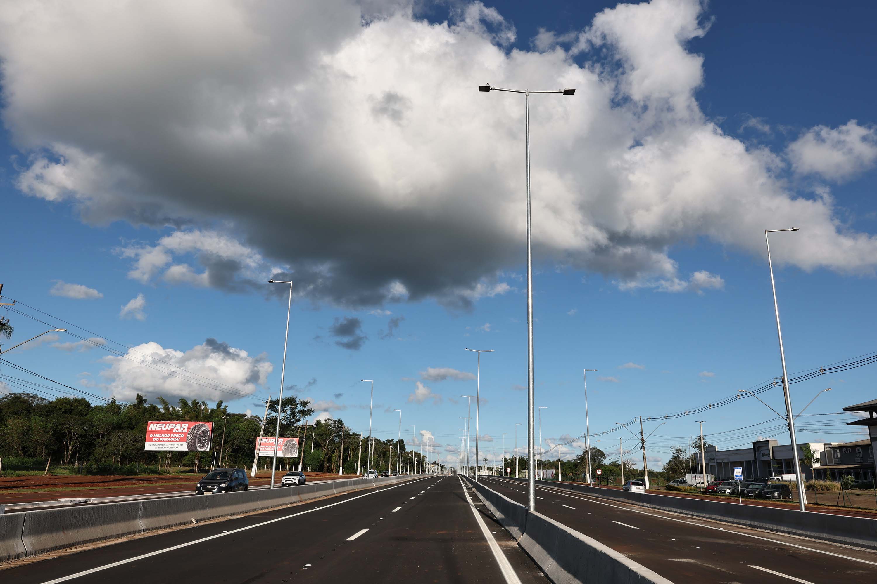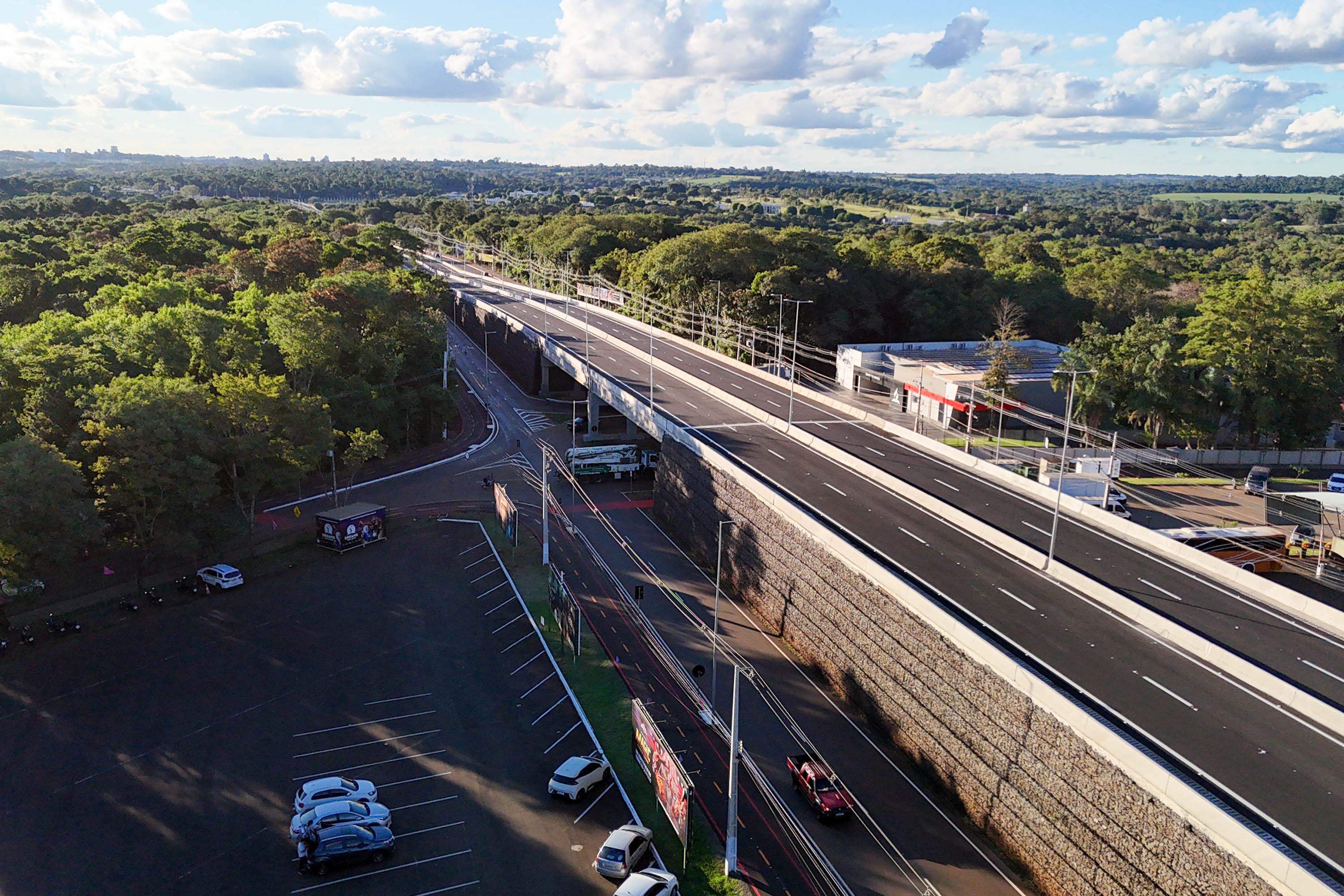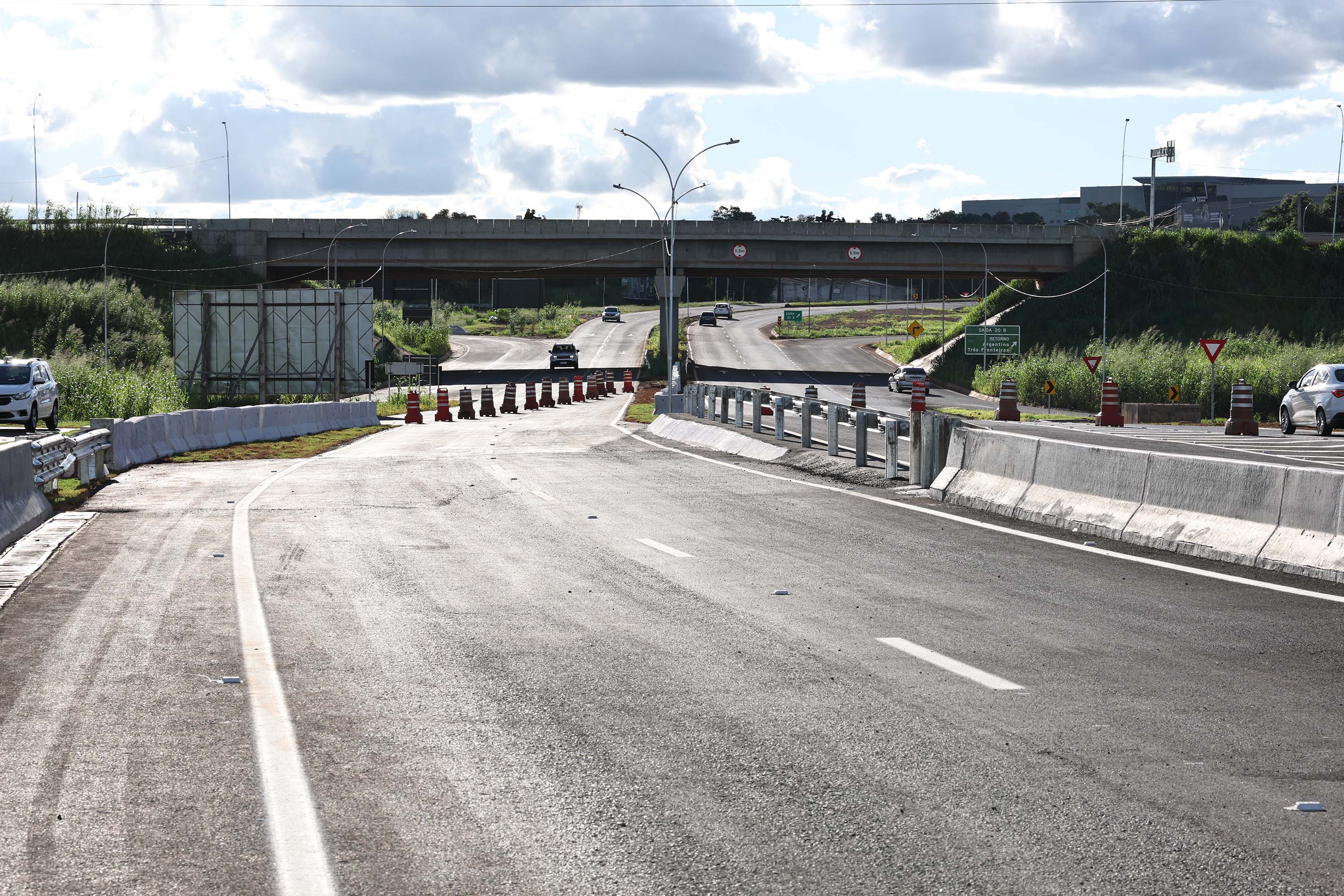 OBRAS CONTINUAM – A liberação do tráfego desta quinta-feira integra a primeira etapa de conclusão das obras de duplicação da Rodovia das Cataratas. A partir do acesso ao aeroporto, as obras continuam, em especial com a construção de um viaduto exatamente neste ponto, que facilitará a chegada até o terminal e ao futuro Centre Pompidou, que terá o primeiro satélite do renomado museu francês nas Américas e no Hemisfério Sul em Foz do Iguaçu.