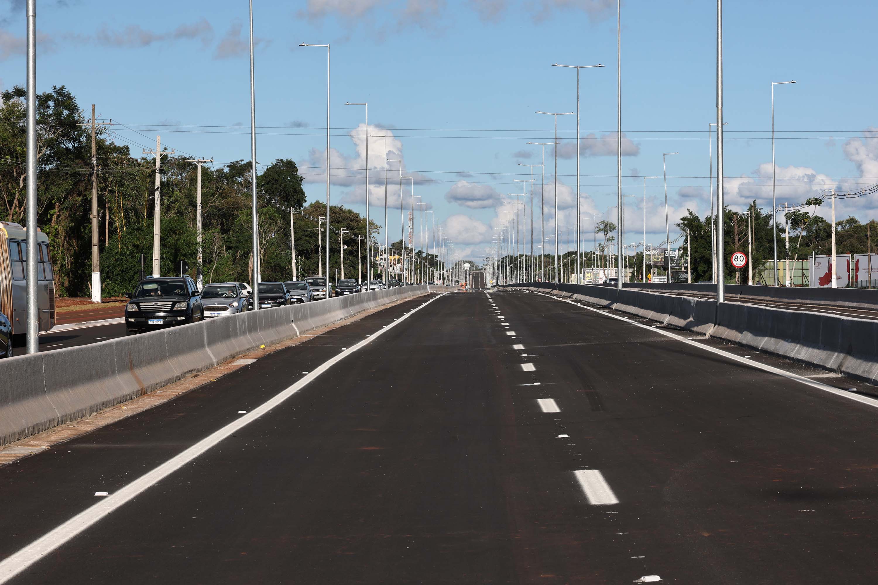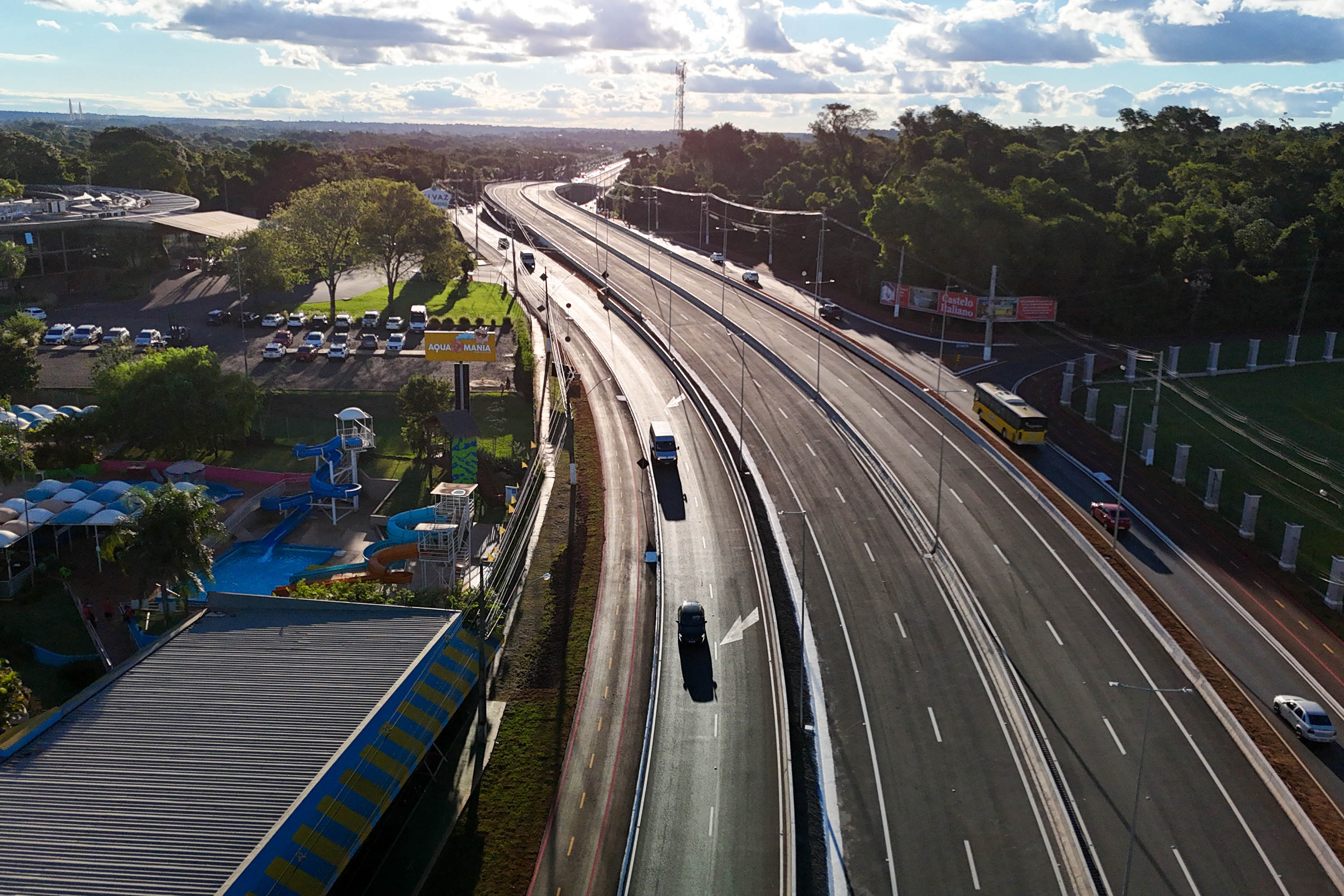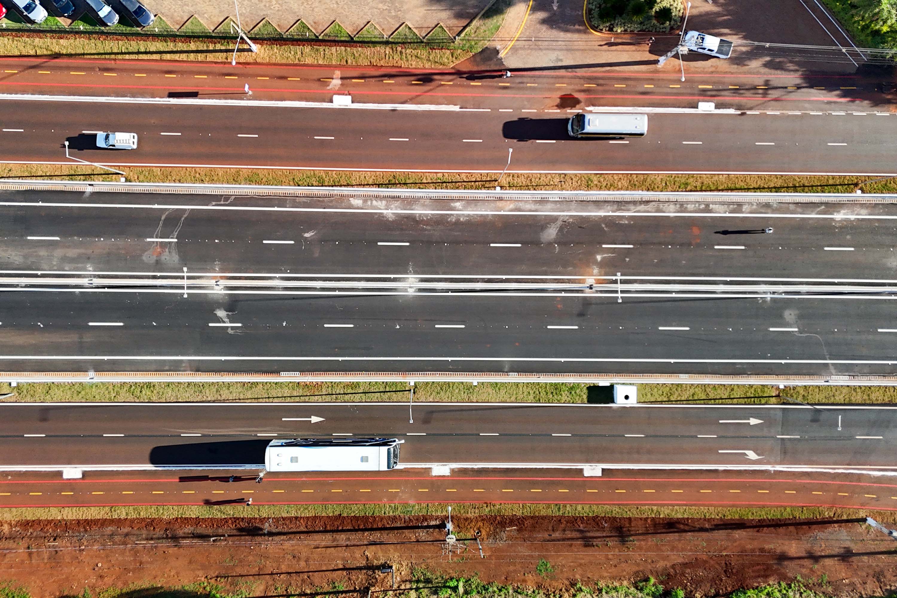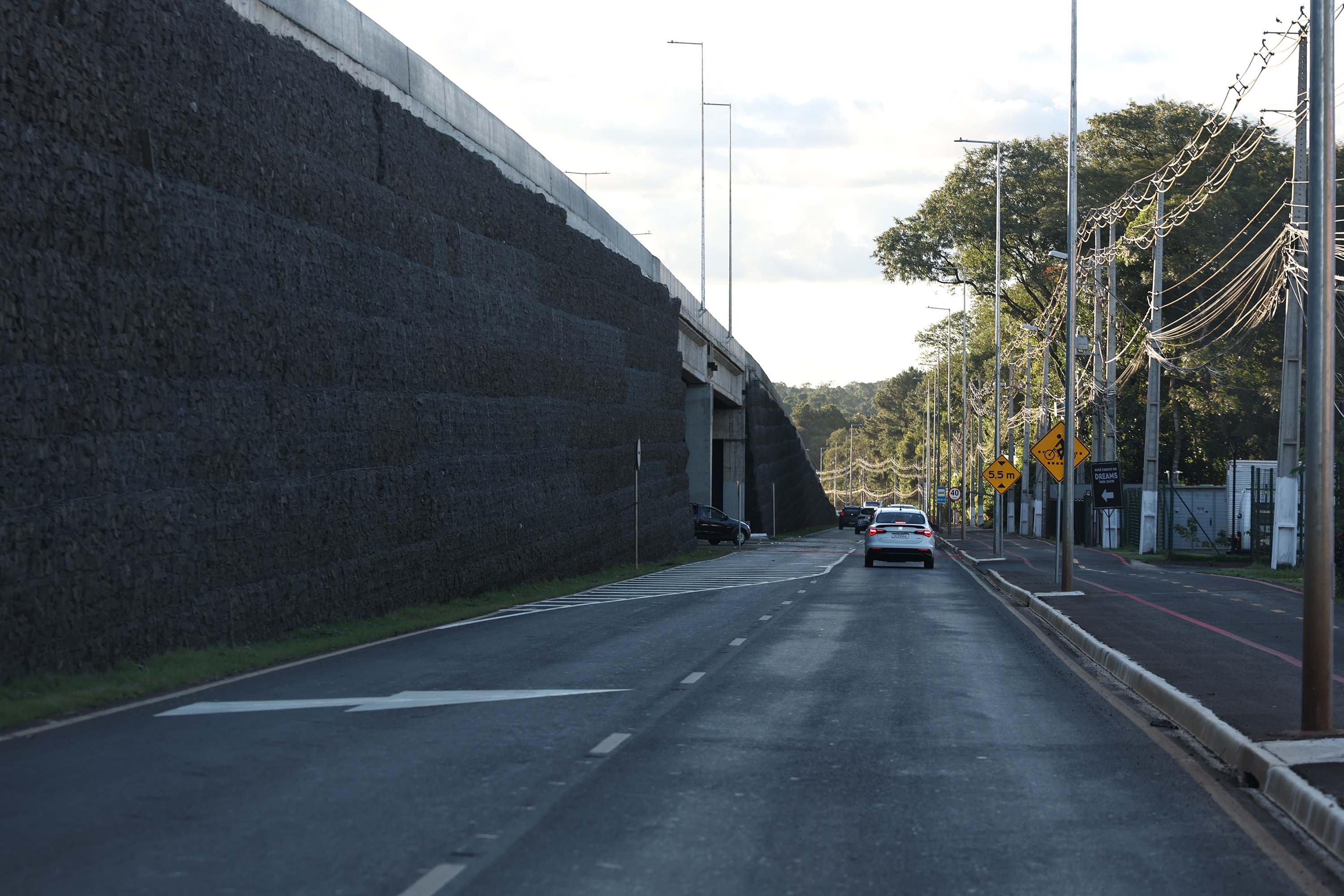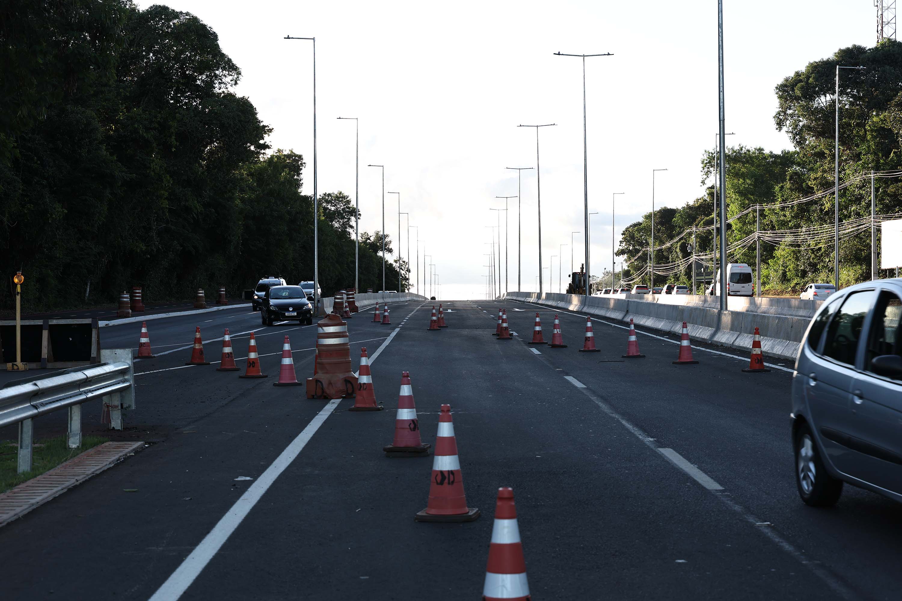 OBRAS CONTINUAM – A liberação do tráfego desta quinta-feira integra a primeira etapa de conclusão das obras de duplicação da Rodovia das Cataratas. A partir do acesso ao aeroporto, as obras continuam, em especial com a construção de um viaduto exatamente neste ponto, que facilitará a chegada até o terminal e ao futuro Centre Pompidou, que terá o primeiro satélite do renomado museu francês nas Américas e no Hemisfério Sul em Foz do Iguaçu.