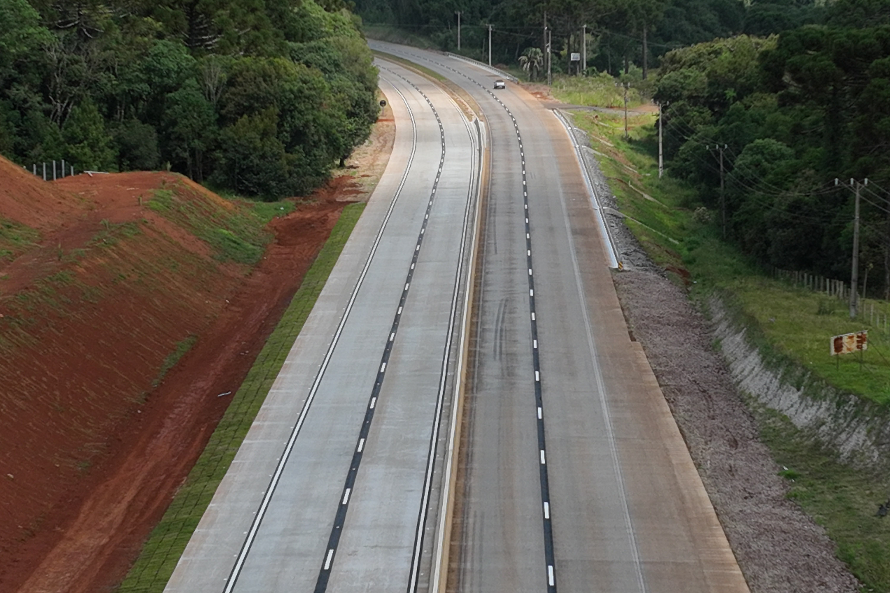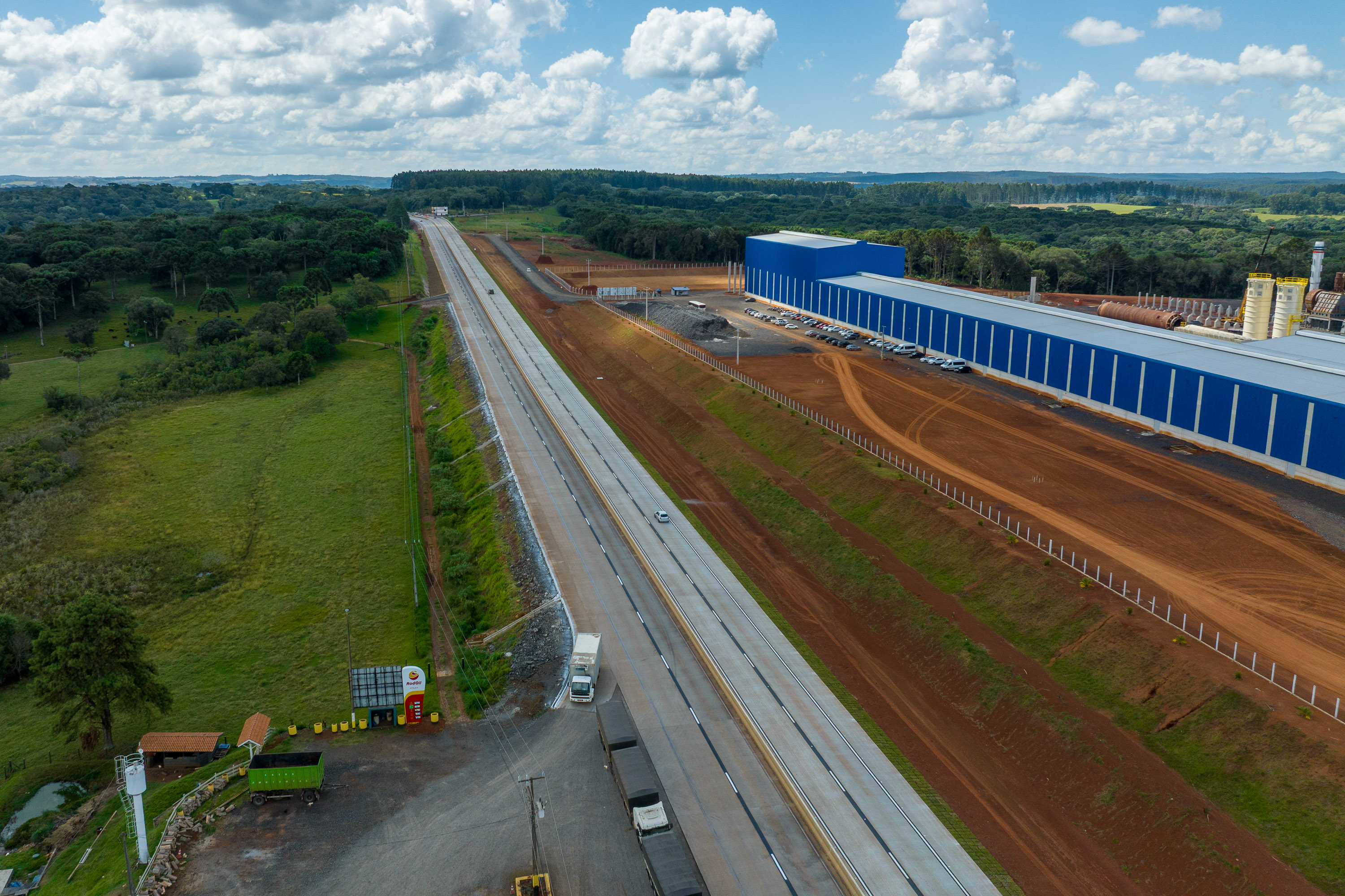 RODOVIA DE CONCRETO – Um dos diferenciais da obra é a adoção do pavimento rígido em concreto nas duas pistas, solução mais moderna e durável. A tecnologia também foi aplicada na restauração da pista existente por meio do whitetopping, técnica que utiliza o asfalto antigo como base para a execução de placas de concreto. Com isso, a rodovia passa a ter maior vida útil, menor necessidade de manutenção e melhor desempenho para suportar o tráfego pesado.